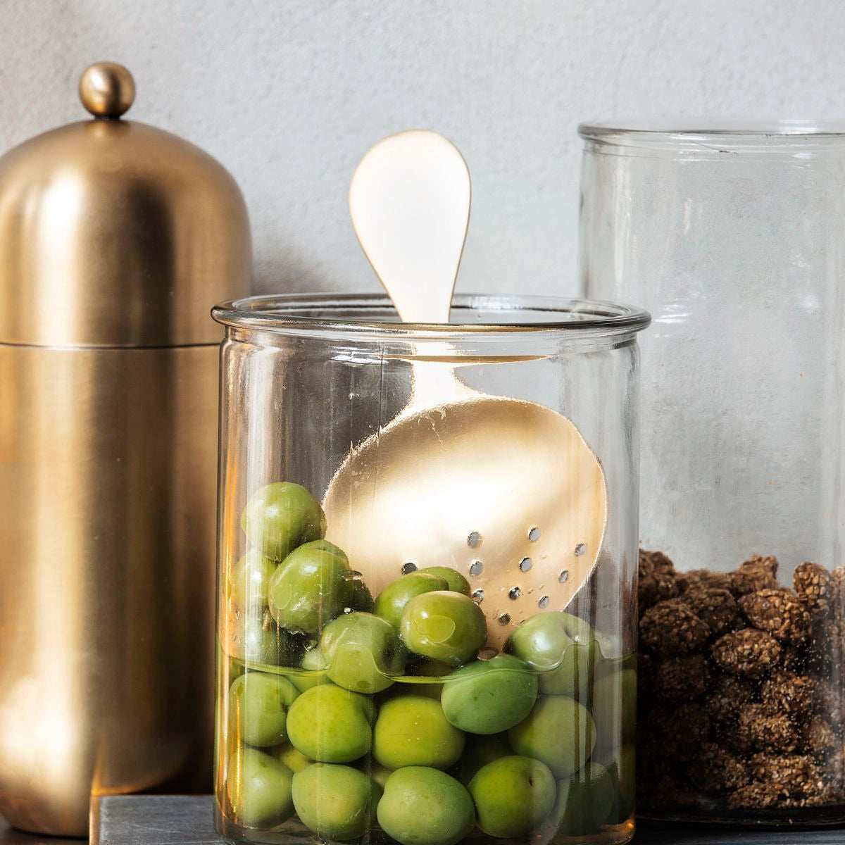 La cuchara Alir de House Doctor es justo lo que buscas si te gusta combinar estilo y funcionalidad en la cocina. Esta elegante cuchara para servir tiene un bonito acabado en color latón y cuenta con pequeños orificios, lo que la hace ideal para escurrir verduras, aceitunas o, por ejemplo, huevos escalfados. Perfecta tanto para cocinar como para llevar a la mesa.