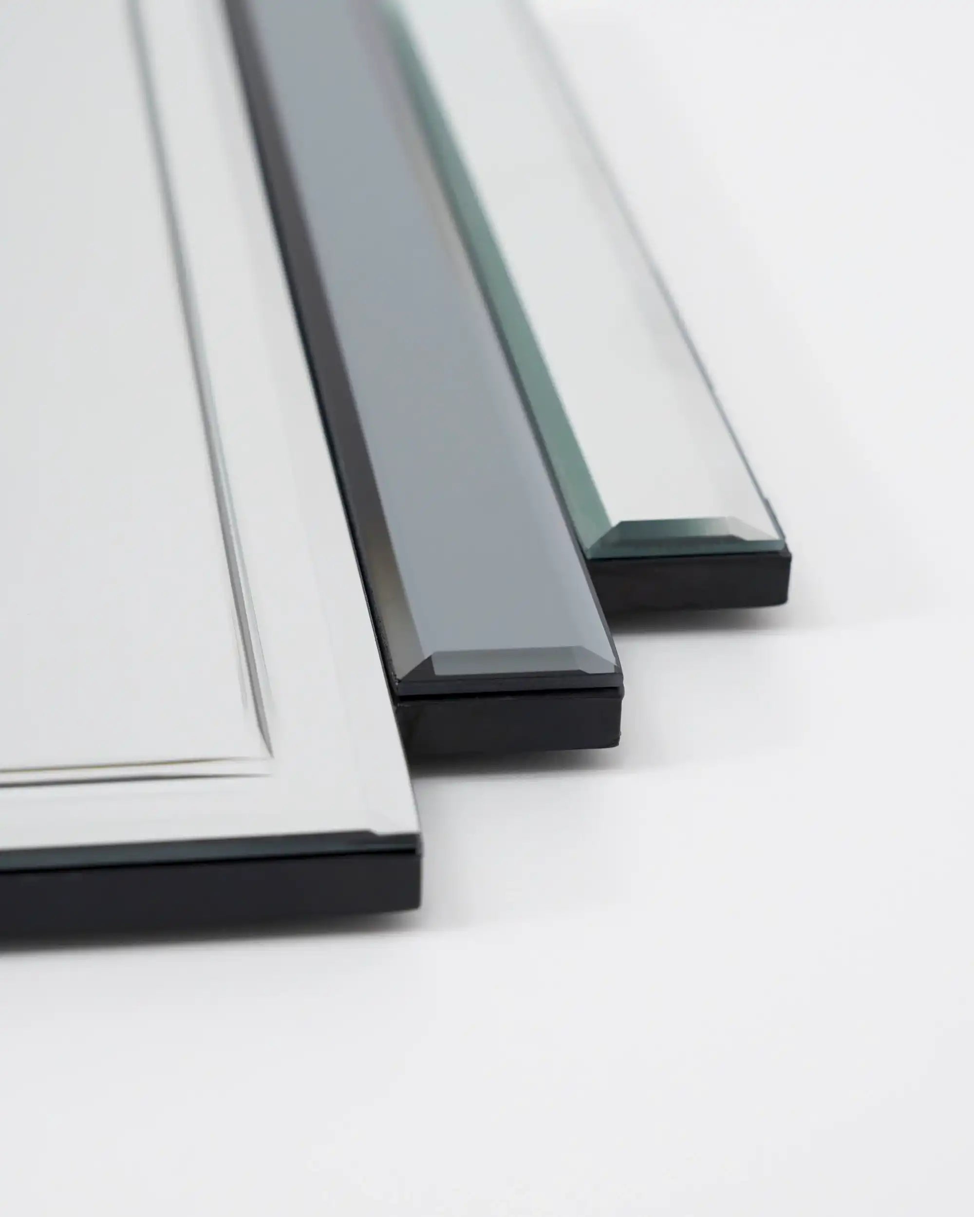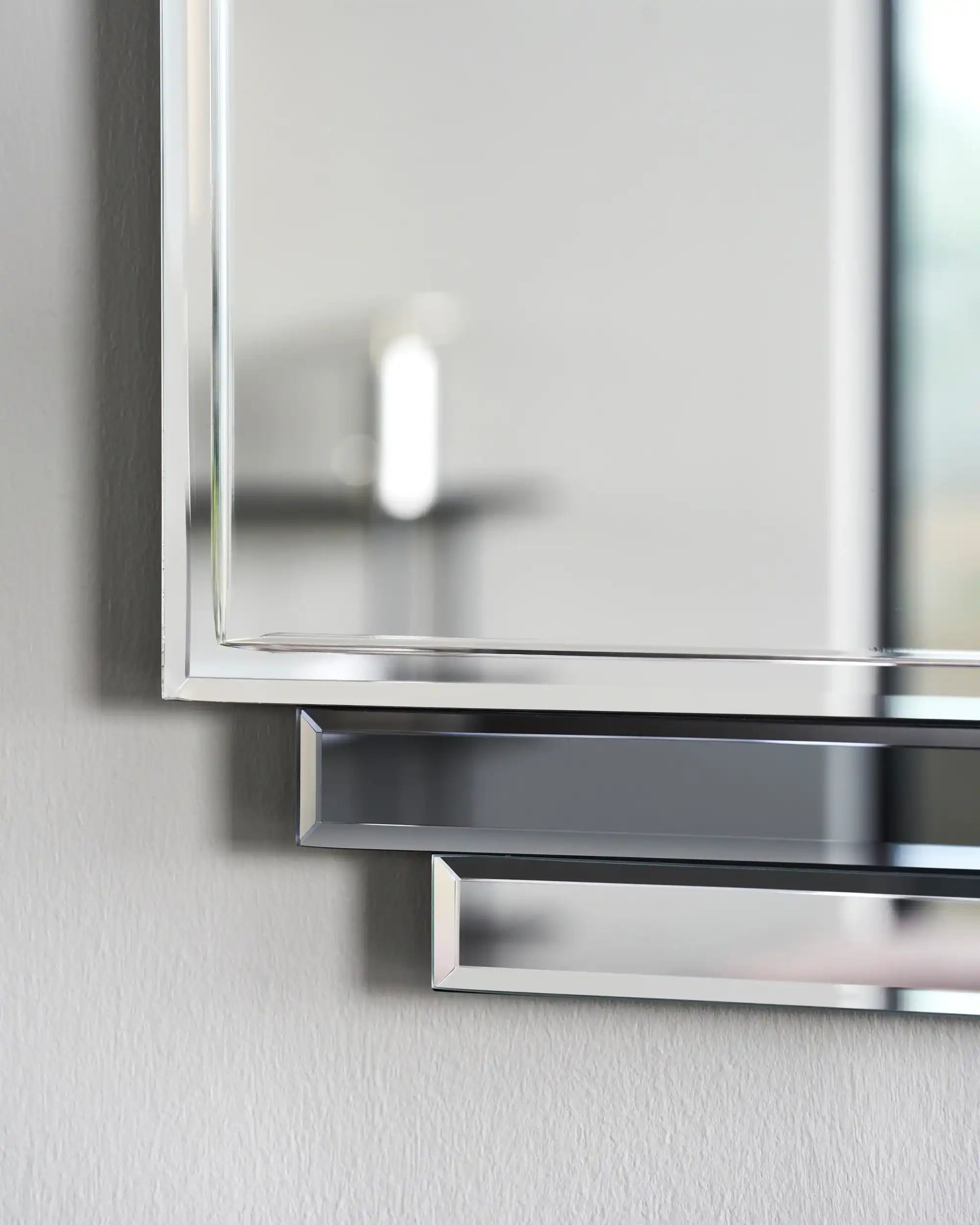 Deco está fabricado en vidrio y madera, con un acabado biselado disponible en dos matices de color. La combinación de materiales y el diseño estilizado le dan un aspecto moderno con un guiño al estilo art déco. El espejo mide 130 cm de alto y 50 cm de ancho, perfecto para el recibidor, el dormitorio o el salón.