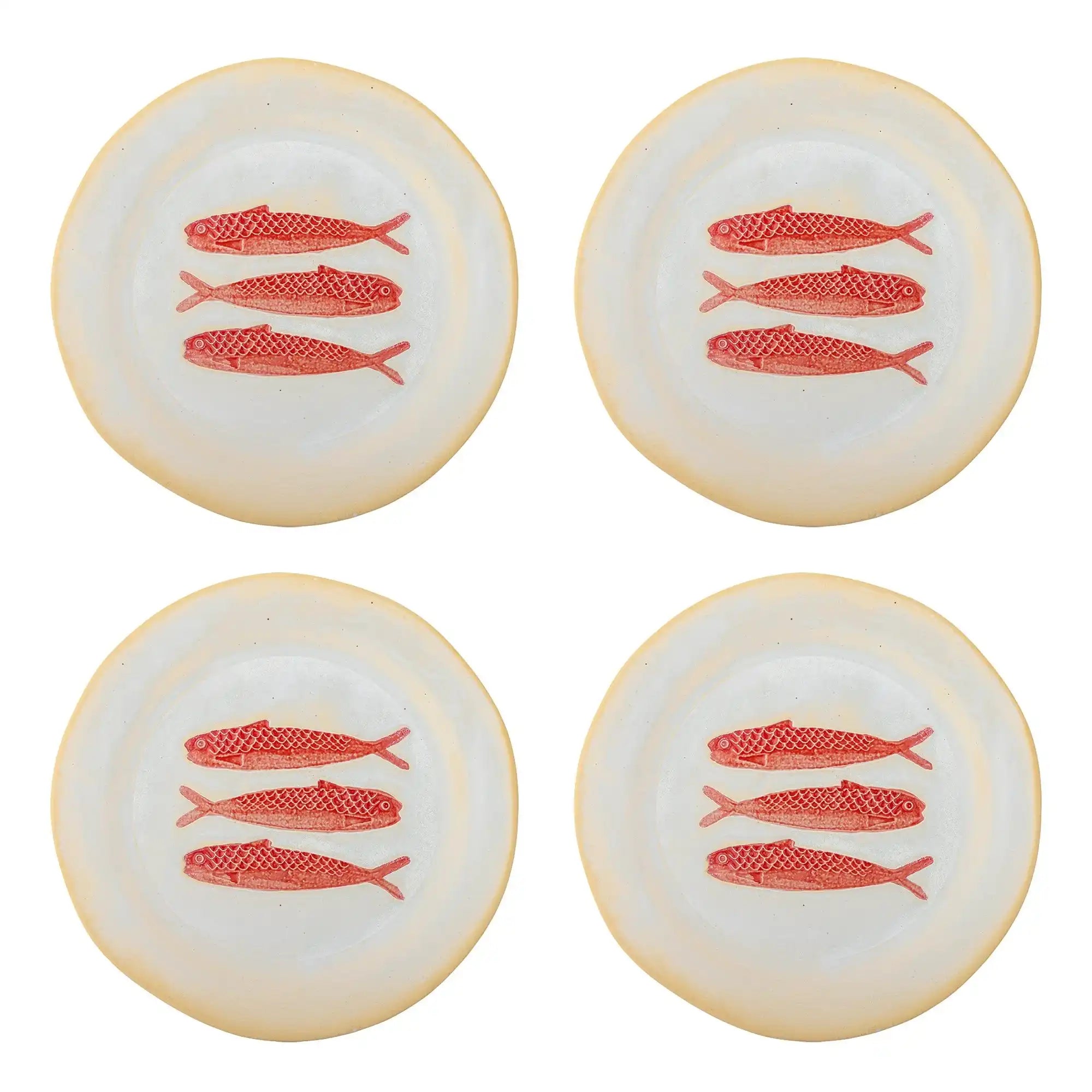 Detalles & material: Fabricado en gres rojo con un esmalte que puede variar sutilmente en cada plato, lo que da a cada pieza su propio carácter. Con ø 27,5 cm tienes espacio generoso para la presentación, mientras que el motivo central de peces aporta una textura agradable. El borde cálido dorado-marrón da equilibrio visual y resalta los colores de tus platos. El set viene en cuatro piezas de Bloomingville: calidad sólida con un toque alegre.
