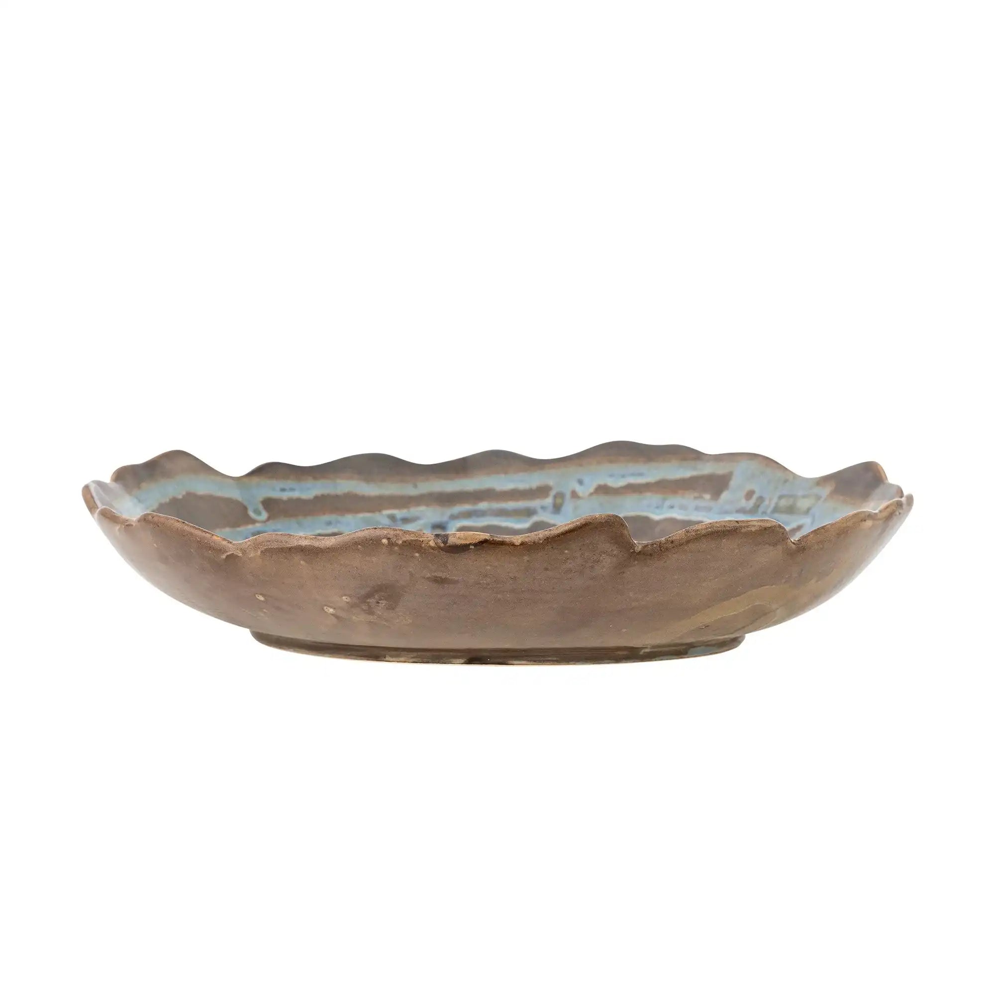 Detalles & material: Fabricada en loza de un tono azul profundo con esmalte reactivo y decoración pintada a mano. Con ø 29 cm tienes un formato versátil para servir o presentar. El borde orgánico, ligeramente desigual, subraya el diseño artesanal y hace que la bandeja sea visualmente interesante. Gracias a la solidez del material, se siente robusta, y el sutil brillo del esmalte resalta aperitivos, pequeños accesorios u objetos decorativos de forma elegante.