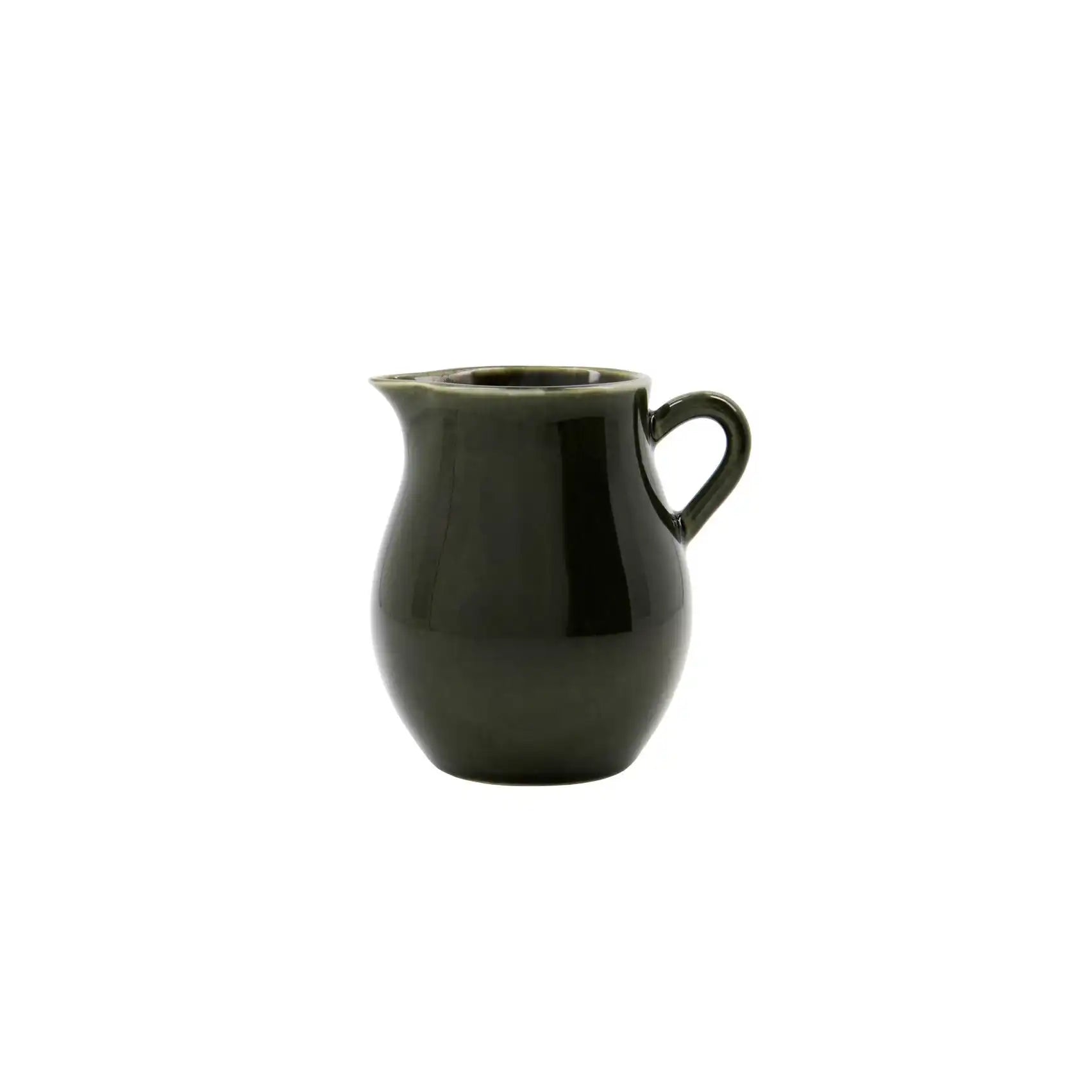Fabricada en loza esmaltada con un suave brillo y un rico tono verde. Gracias a su tamaño compacto (l: 10,5 cm x a: 8,5 cm x al: 11 cm), esta jarra cabe fácilmente en la mesa o en el armario. Con una capacidad de 38 cl, es ideal para leche, nata o salsas calientes. El asa curvada se adapta cómodamente a la mano y el pico vertedor evita goteos en la mesa.