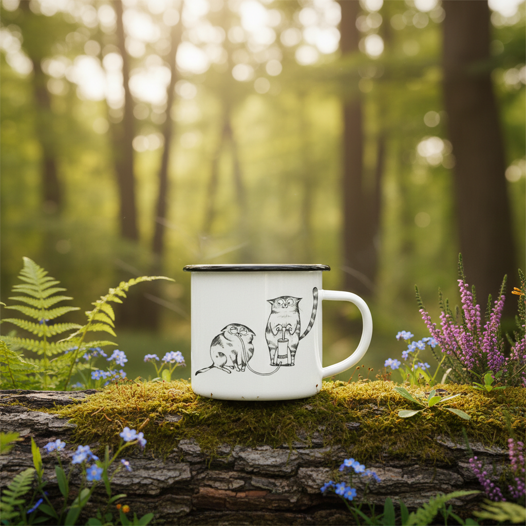 La Ligarti taza esmaltada hecha a mano Helium 300ml no es solo una taza, sino una pieza única que alegra tus momentos cotidianos. El diseño creativo de los gatos flotantes, impreso a mano en Alemania, convierte cada taza en una obra de arte individual. Fabricada en metal blanco de alta calidad con un borde negro clásico, esta taza tiene una capacidad de 300 ml, perfecta para tus bebidas calientes favoritas.