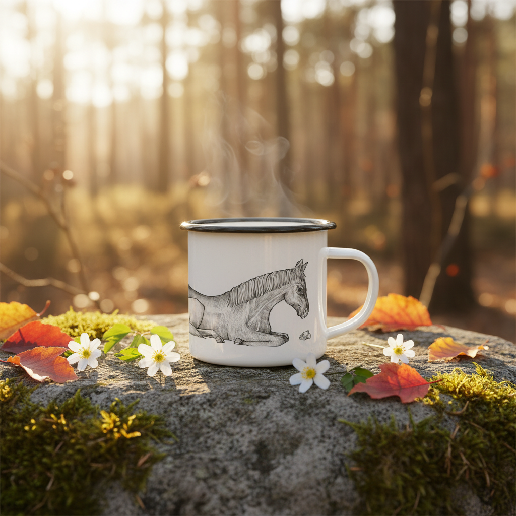 Pon una sonrisa en tu rostro durante tus momentos diarios de café o té con las resistentes tazas de esmalte de Ligarti. Estas preciosas tazas artesanales cuentan con estampados únicos, como este encantador caballo tumbado. Fabricadas con esmero en Alemania, no solo son un placer para la vista, sino también ligeras y fáciles de llevar en todas tus aventuras.