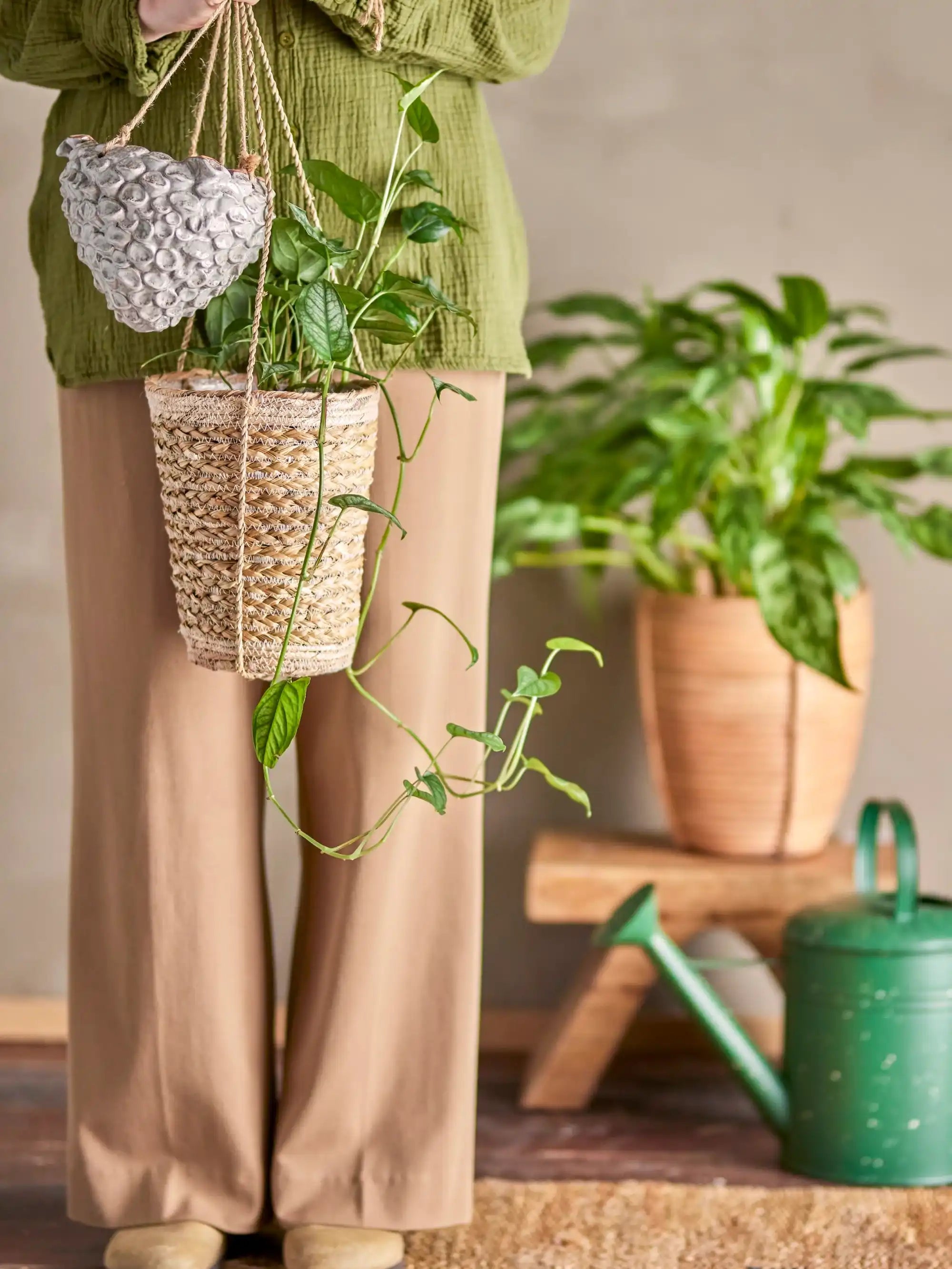Detalles y material: Fabricada en cerámica de alta calidad en beige/natural y acabada con un esmalte reactivo, Alaz combina una textura táctil con una paleta de colores serena. Con ø 19 cm, la maceta ofrece espacio para varias plantas de interior, mientras que el diseño colgante libera espacio en el suelo y la mesa. El colgador de cáñamo se siente resistente y añade fibras orgánicas y cálidas que contrastan de forma elegante con la cerámica lisa. El relieve similar al coral capta la luz de manera sutil y resalta la forma de tu planta.