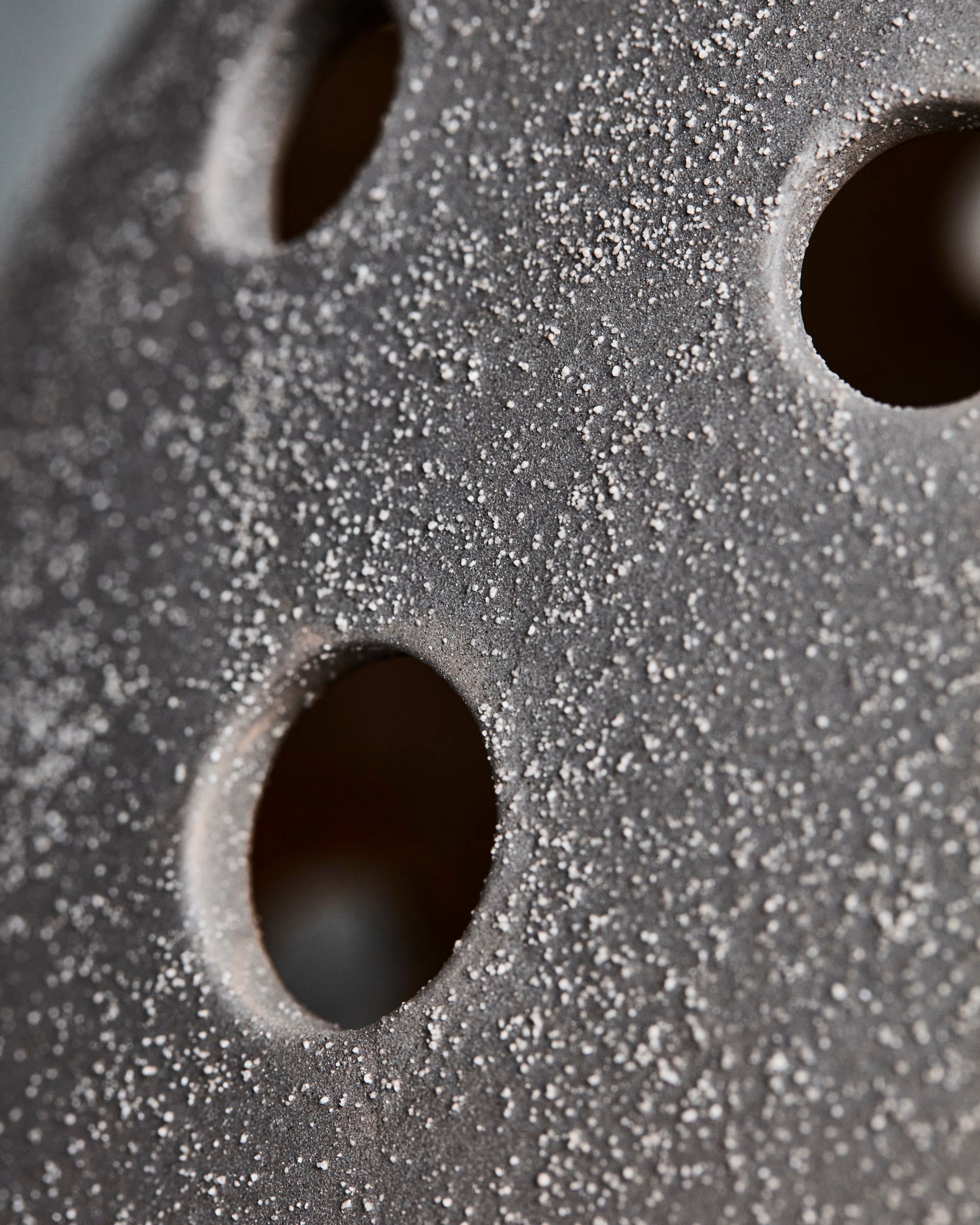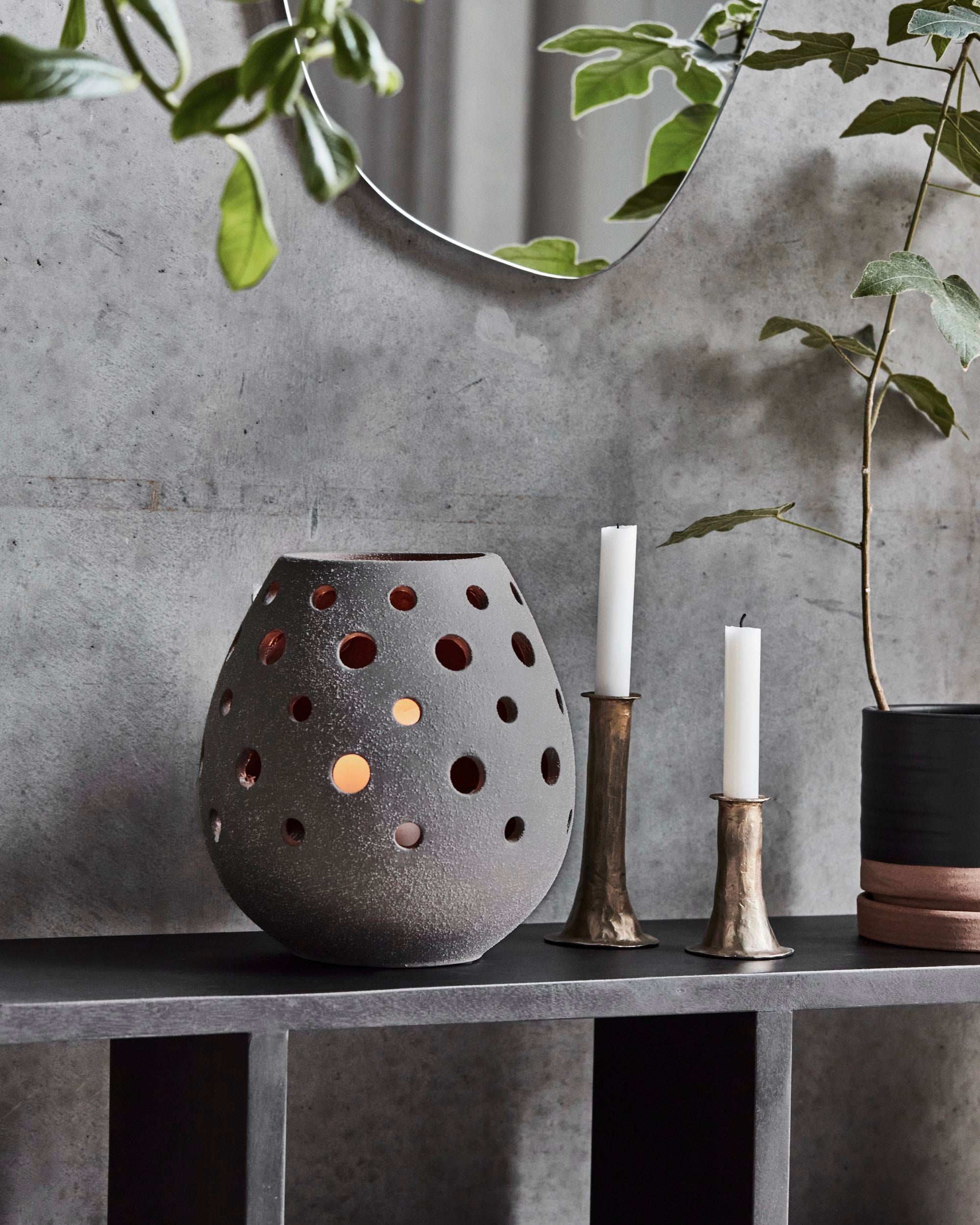 Este candelabro está cuidadosamente elaborado en cerámica y presenta un acabado mate en tono gris que combina fácilmente con diferentes estilos de interior. Con una altura de 25 cm y un diámetro de 13 cm y 23 cm, destaca sin dominar el espacio. Gracias a su generoso tamaño, queda perfecto en el suelo, pero también luce precioso sobre un mueble bajo o un alféizar ancho.
