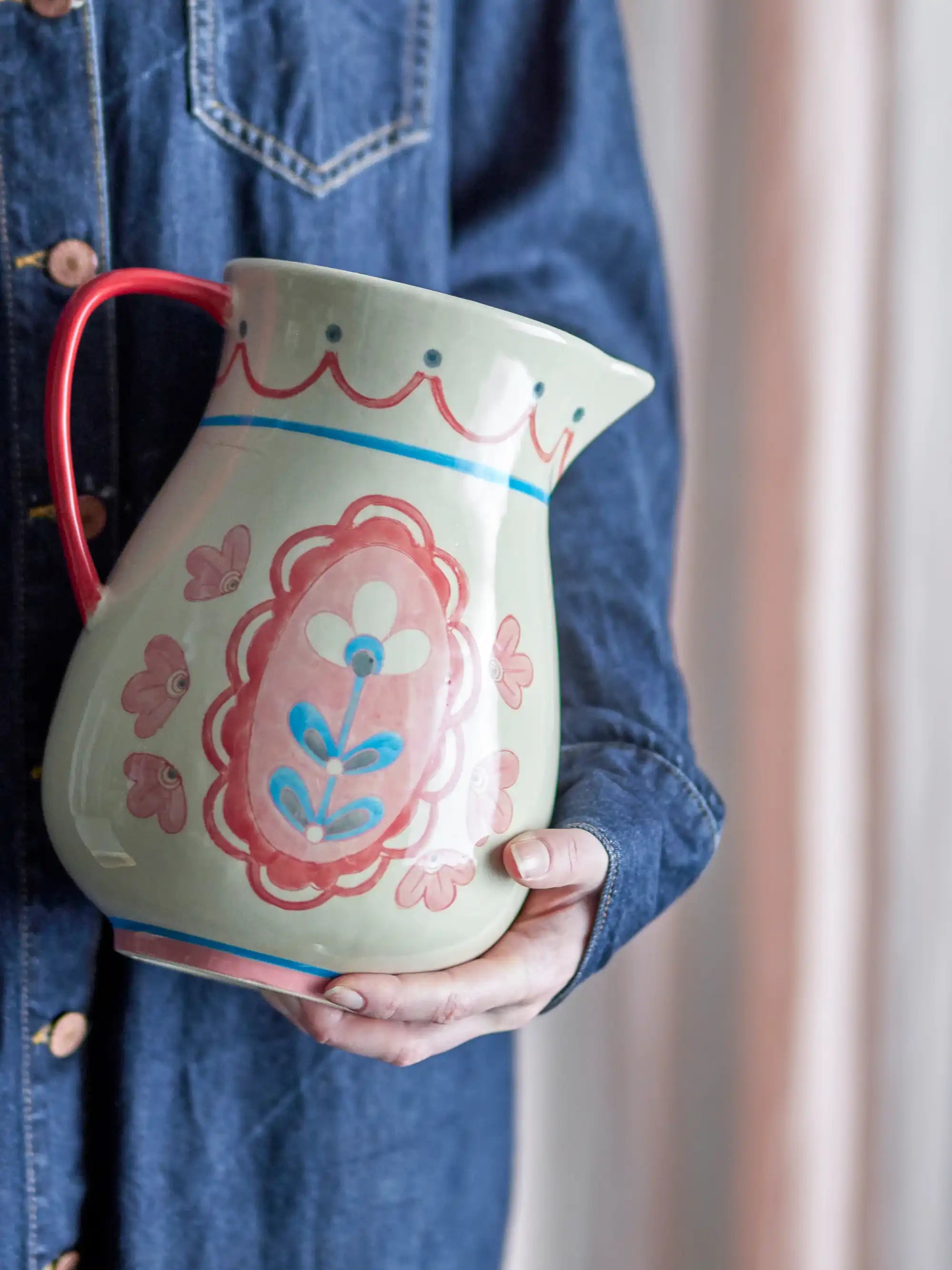 Por qué querrás tener esta jarra: Aporta alegría y sofisticación a tu mesa al instante con esta encantadora jarra de cerámica de Bloomingville. El suave tono rosa y los motivos florales crean un ambiente acogedor y cálido que hace especial cualquier reunión.