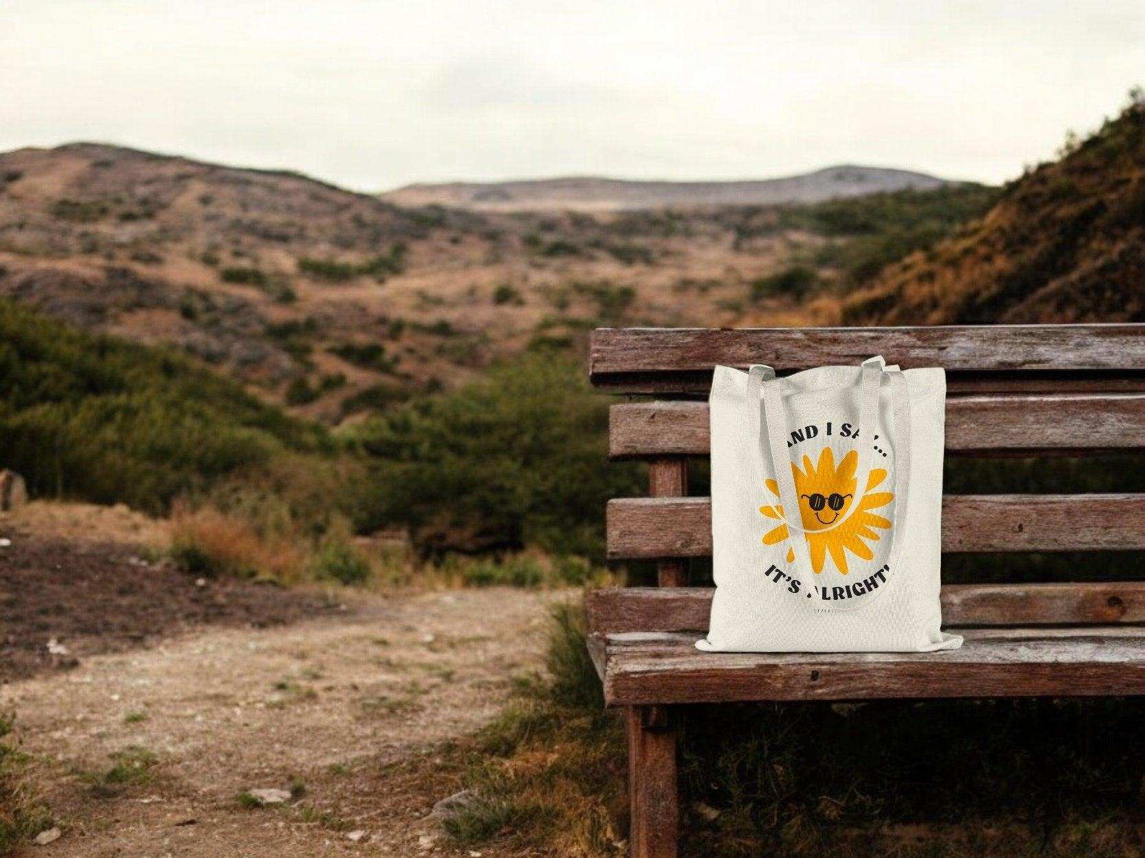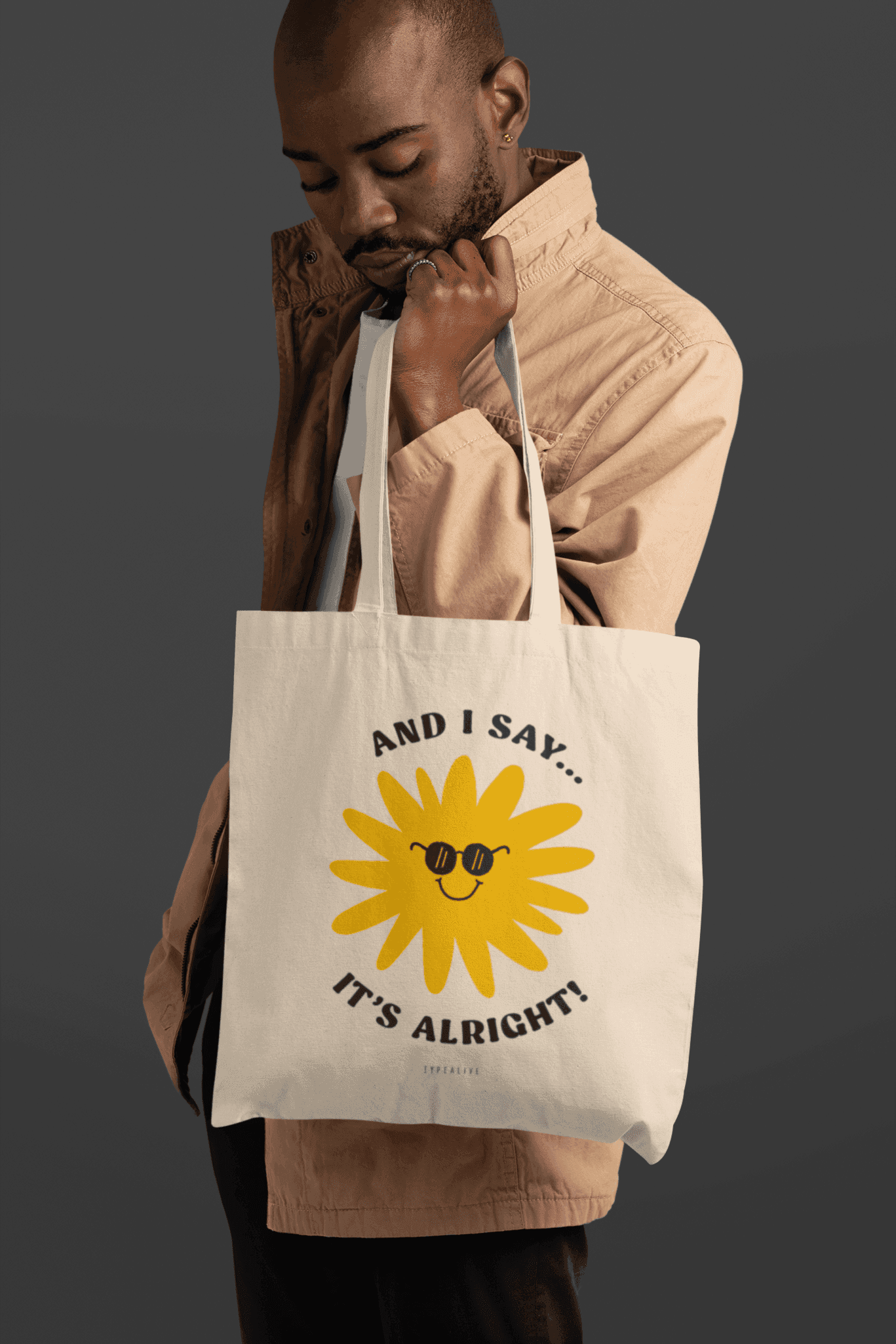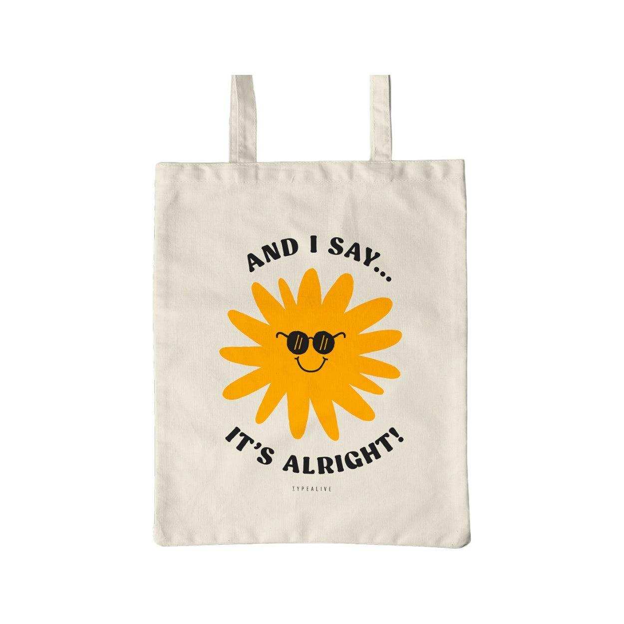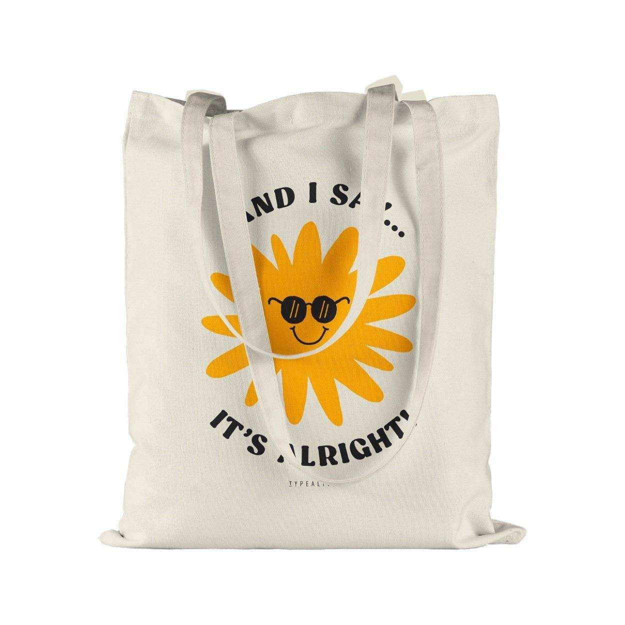 La Typealive Katoenen tas And I say es una bolsa alegre y sostenible, perfecta para cualquier ocasión. Con un sol con gafas de sol y el texto "And u Say… It’s alright!", esta bolsa añade un toque divertido y positivo a tu look diario. Fabricada con algodón 100% certificado oeko-tex, esta bolsa de algodón no solo es elegante, sino también respetuosa con el medio ambiente.