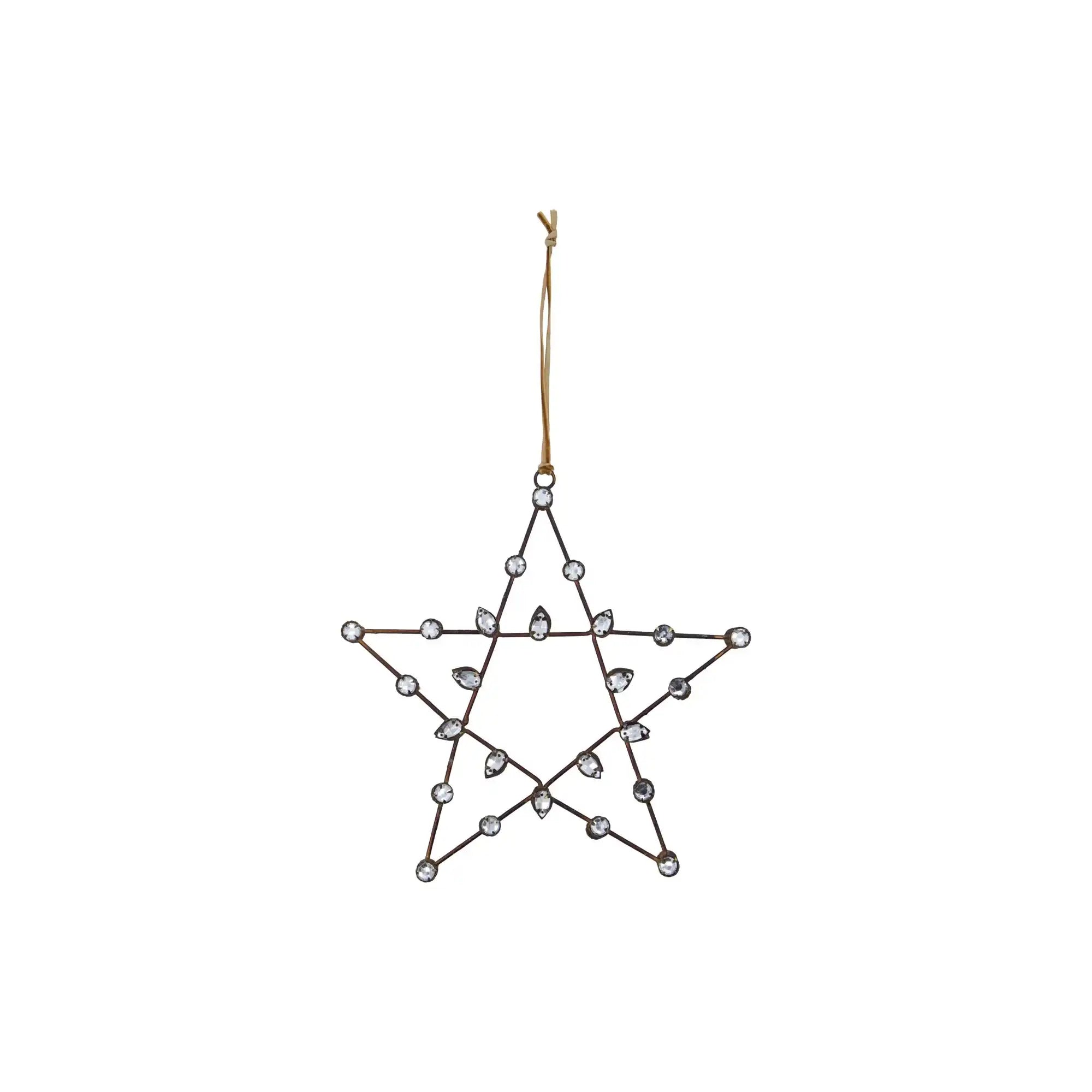 La estrella está hecha a mano con metal resistente y cuidadosamente acabada en un profundo tono cobre antiguo. En ambos lados se han colocado piedrecitas brillantes que capturan la luz de forma sutil. Con un ancho de 17 cm y una altura de 18 cm, este adorno tiene un tamaño ideal que destaca sin dominar el espacio.