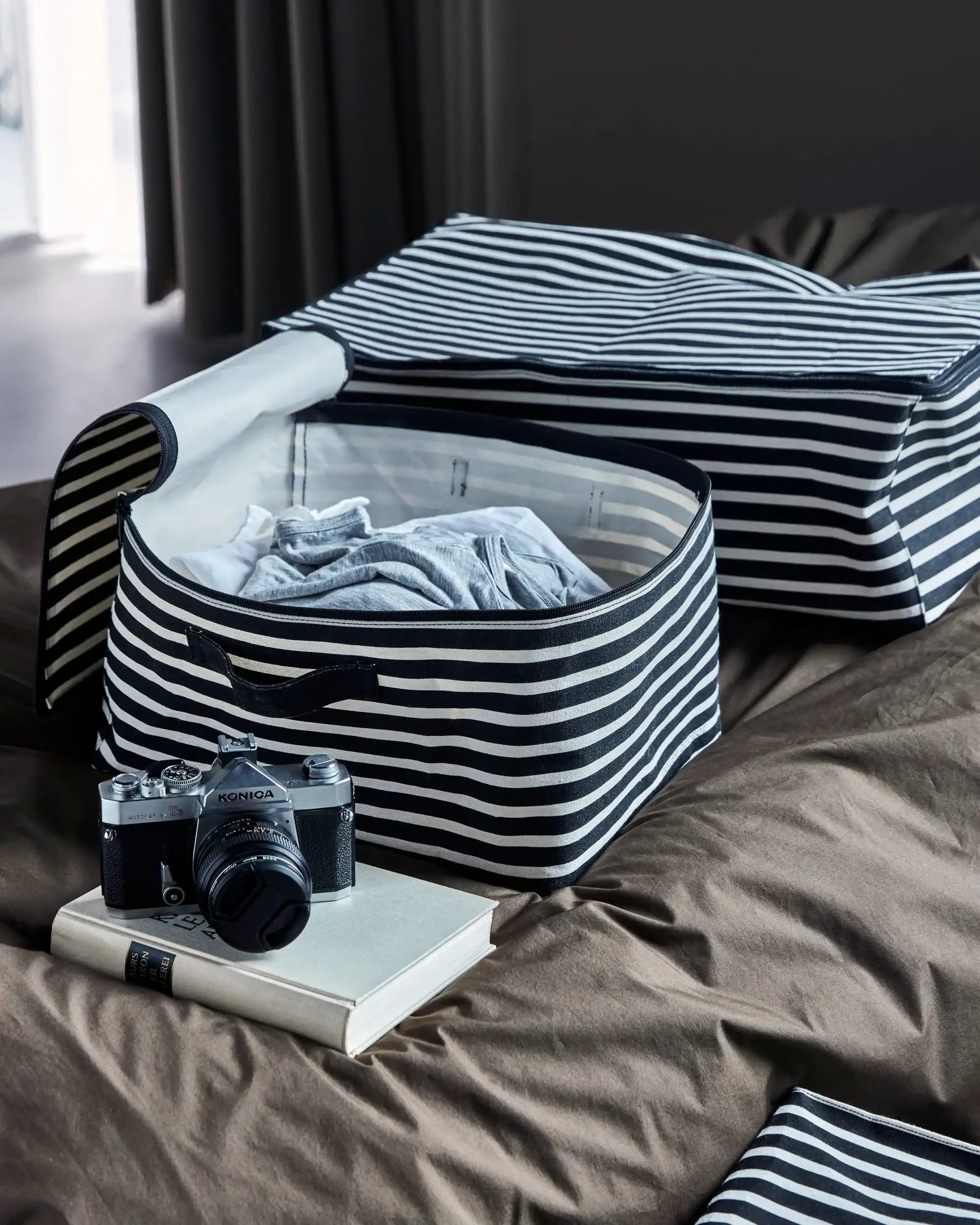 Un hogar ordenado empieza con soluciones de almacenamiento inteligentes que también pueden verse. Esta elegante caja organizadora aporta calma y ritmo a tu interior con sus modernas rayas en blanco y negro. Perfecta para quienes buscan algo práctico y bonito, ya sea junto al sofá o en una estantería del dormitorio.