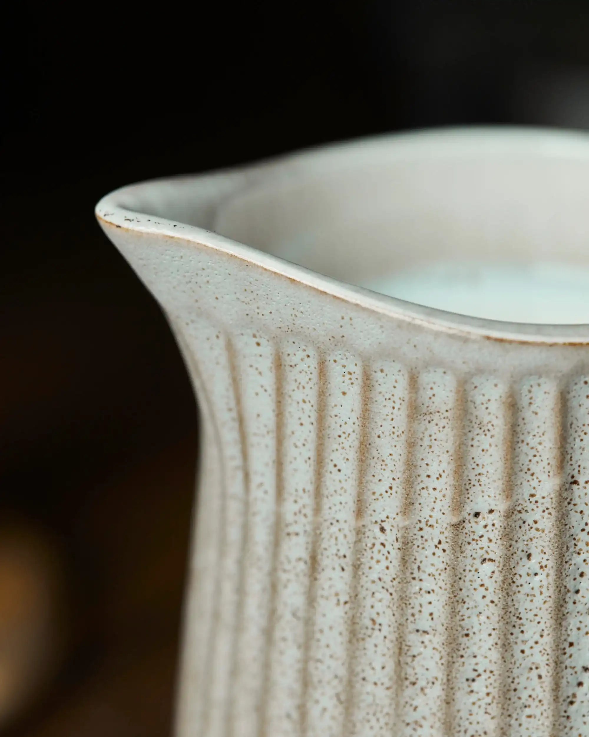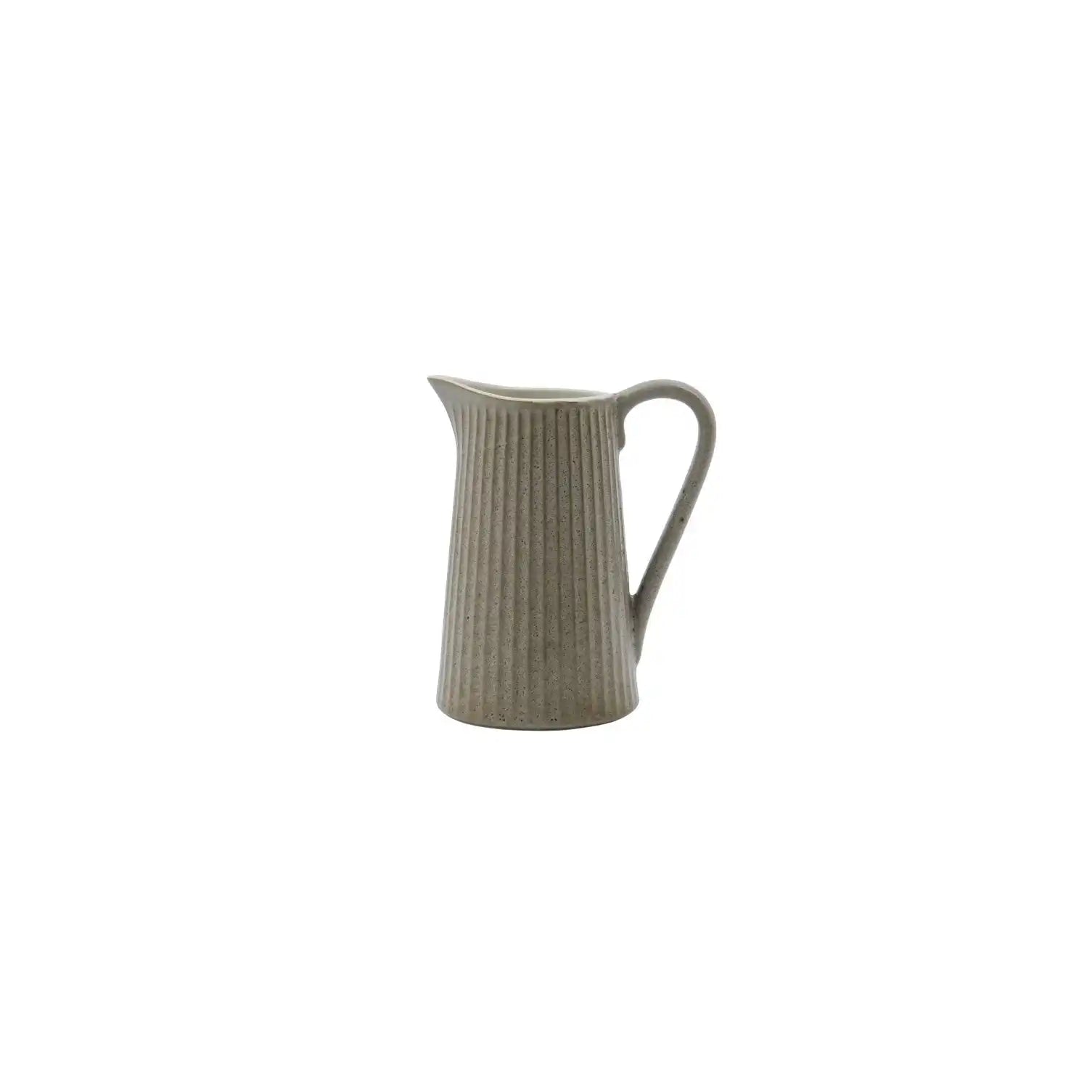 Esta pequeña jarra está hecha de cerámica de alta calidad. El exterior mate contrasta maravillosamente con el interior brillante, creando un detalle sorprendente. Con unas dimensiones de 11 cm de largo, 8 cm de ancho y 13 cm de alto, es compacta pero lo bastante llamativa como para no pasar desapercibida. El suave tono gris marrón combina fácilmente con la vajilla de uso diario.