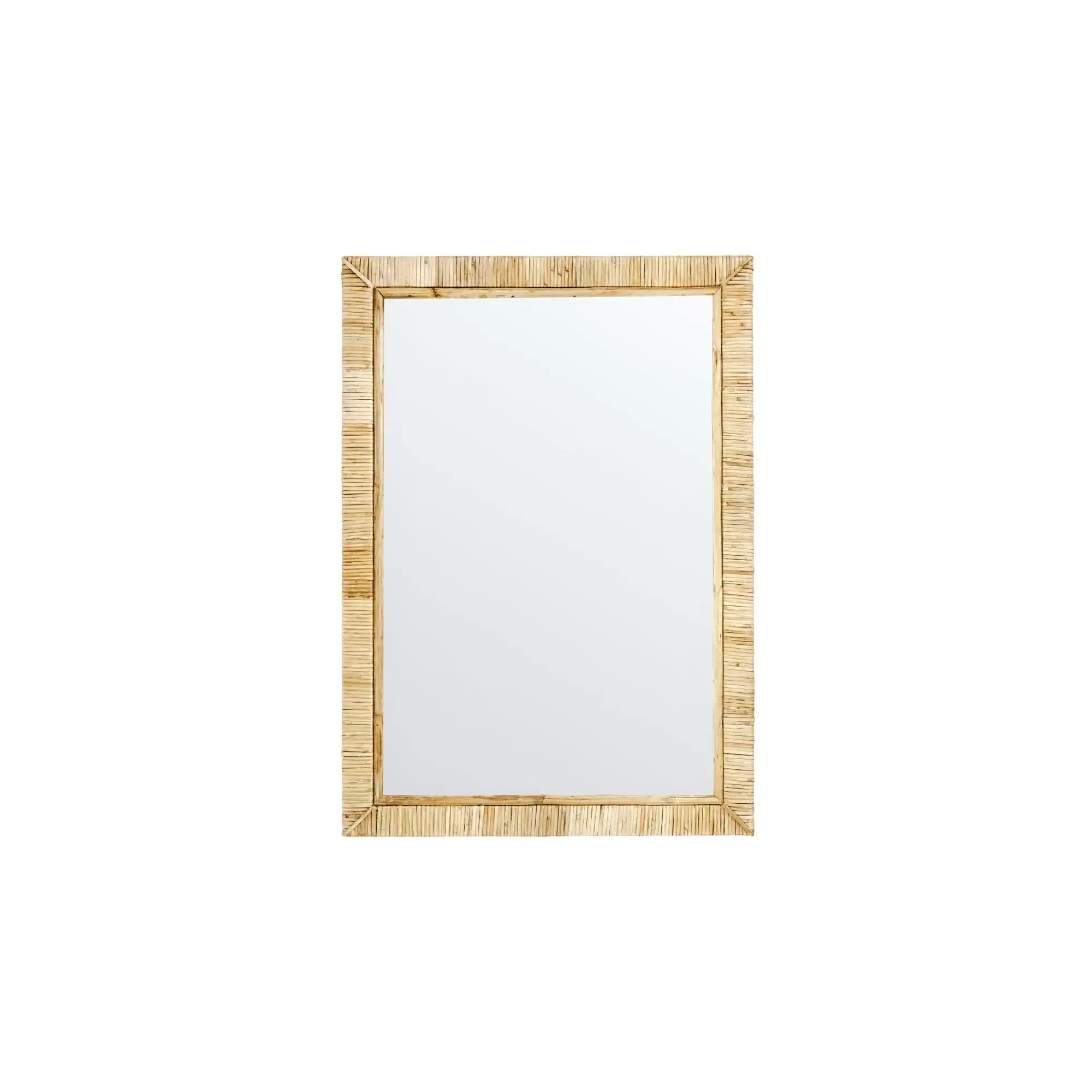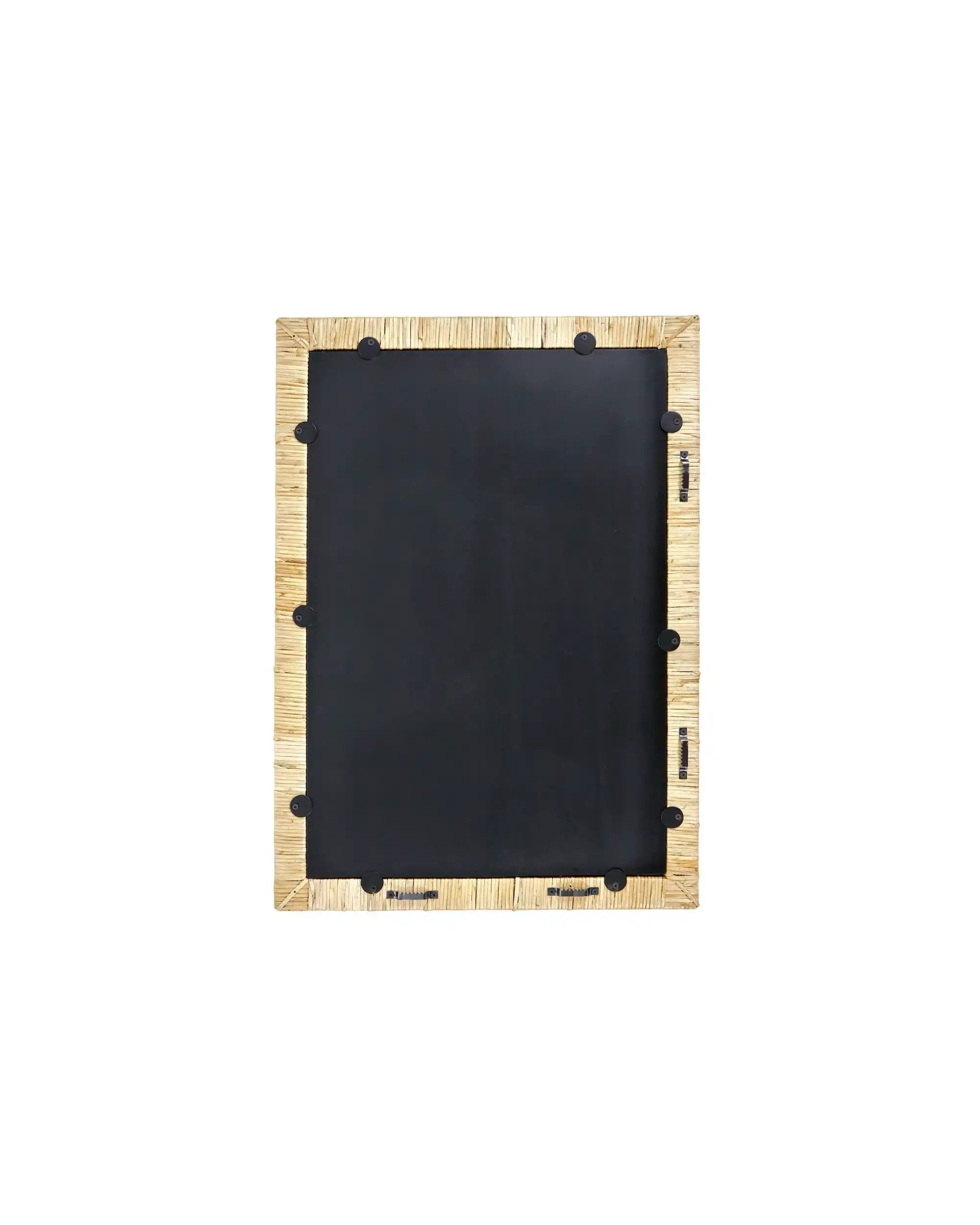 El marco está hecho de una combinación de ratán y madera de mango, ambos en su color natural. Esto le da un aspecto cálido y orgánico con ligeras variaciones de color. El espejo mide 50 cm de ancho, 70 cm de alto y tiene 4 cm de profundidad. Gracias a su tamaño y peso ligero, puedes colgarlo fácilmente de diferentes maneras.