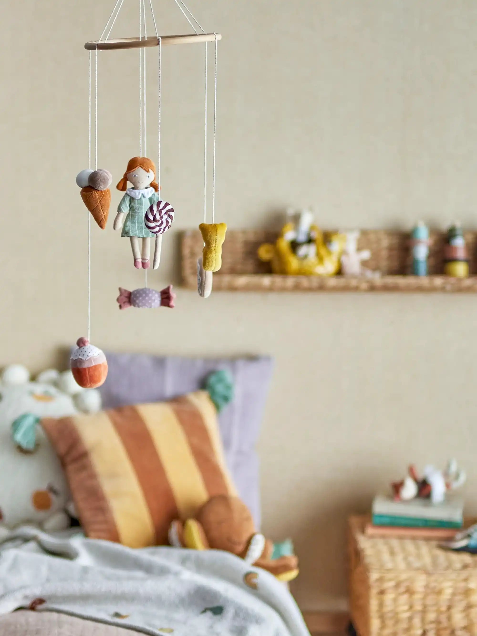 Por qué querrás el móvil Rosana de Bloomingville MINI: El Rosana es un móvil encantador que entretiene a tu peque de forma suave. La niña entre los dulces cuenta una pequeña historia sobre la cama, para que tú puedas cambiar o arropar tranquilamente. El diseño sereno hace que la habitación del bebé sea cálida y acogedora, sin ser demasiado llamativa. Ideal para la rutina de sueño.