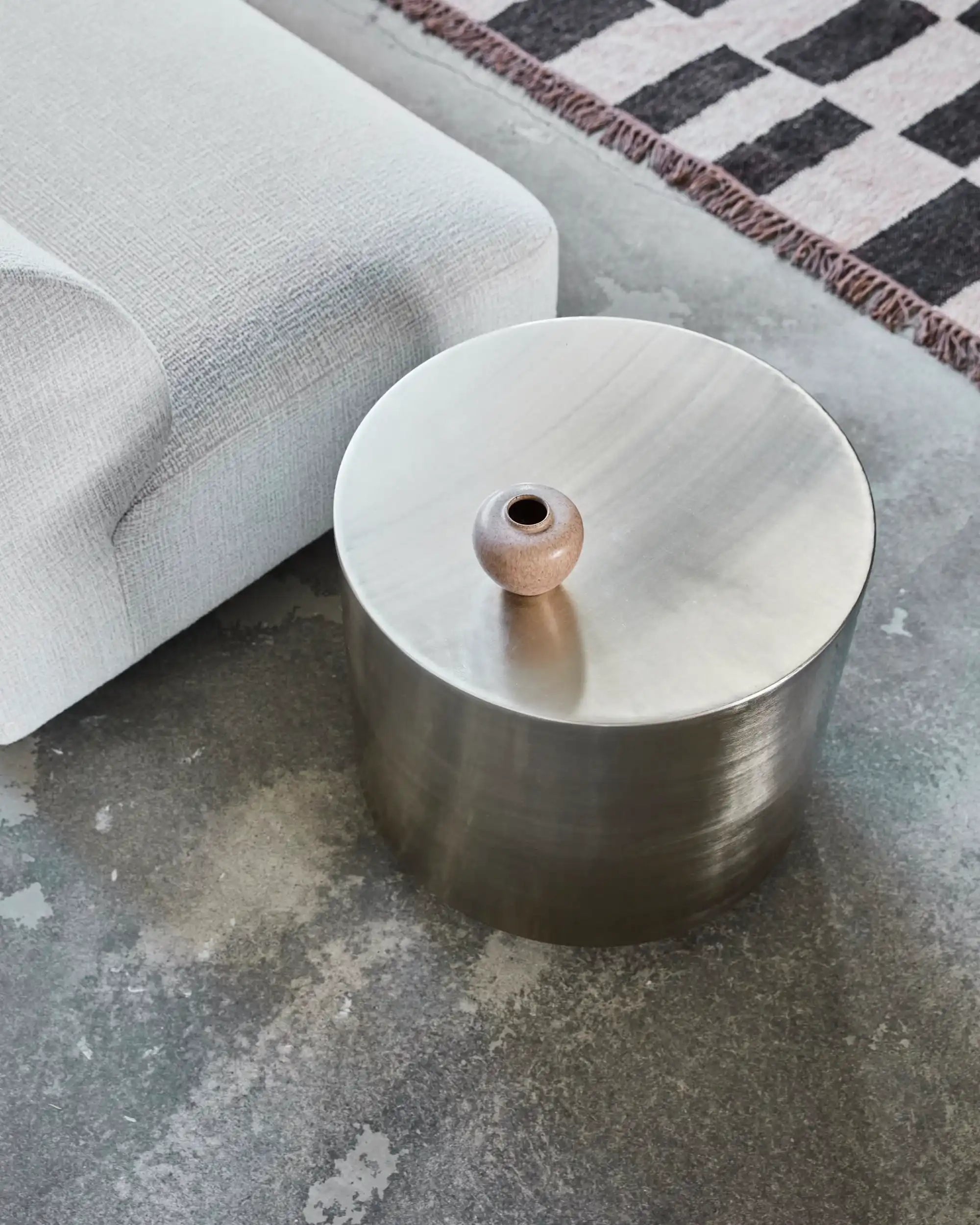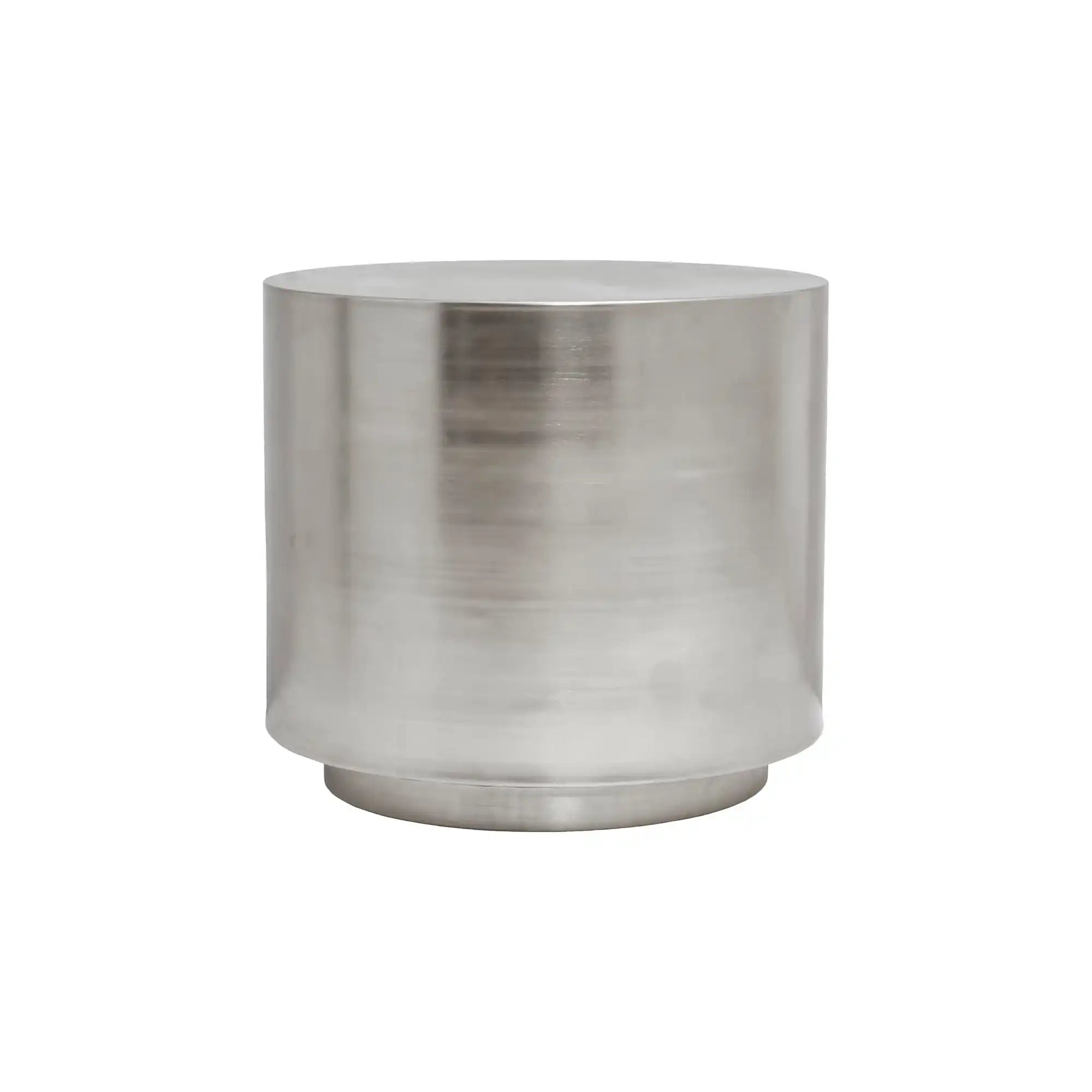 Step está fabricada completamente en metal y tiene una forma cilíndrica sólida. La mesa cuenta con un acabado en plata cepillada que crea un efecto de luz sofisticado. Con una altura de 45,5 cm y un diámetro compacto de 40 cm, encaja perfectamente junto al sofá o como acento independiente.