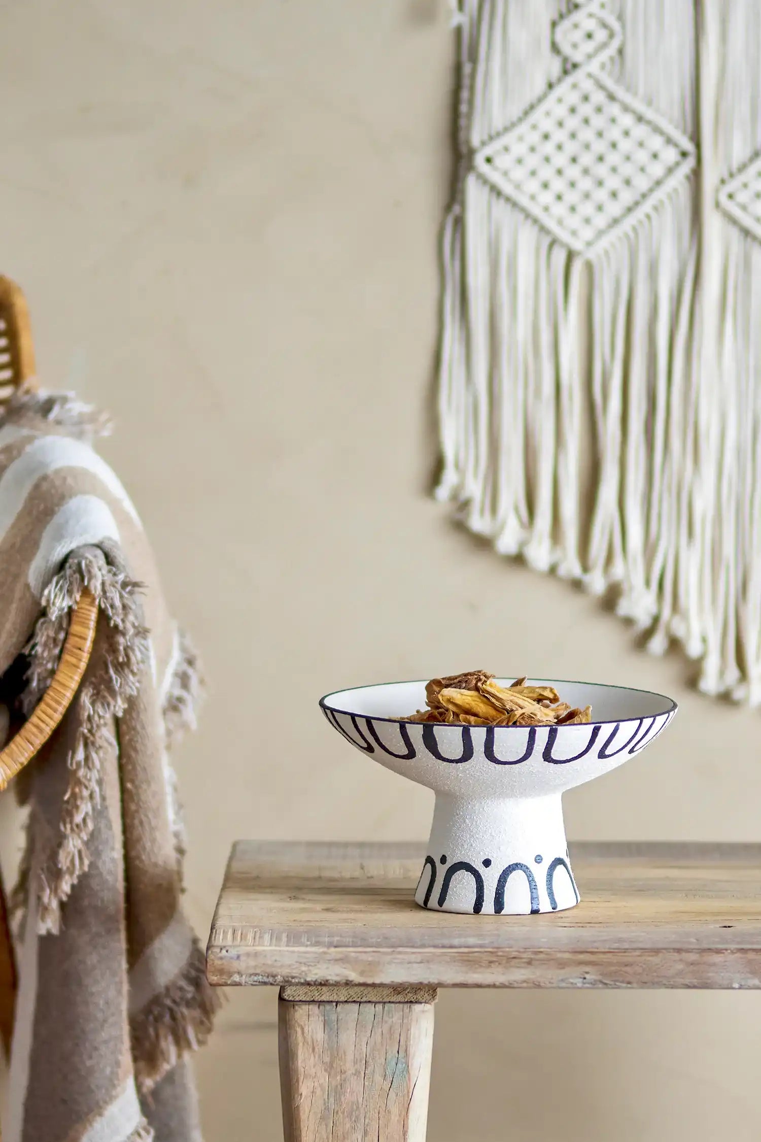 Detalles y material: El Mayotte está fabricado en cerámica resistente y cuenta con un esmalte blanco mate decorado a mano con detalles negros. Gracias a su generoso diámetro de 26 cm y una altura de 15 cm, tienes espacio de sobra para fruta o decoración. Cada bol está pintado a mano, por lo que es único en su clase.
