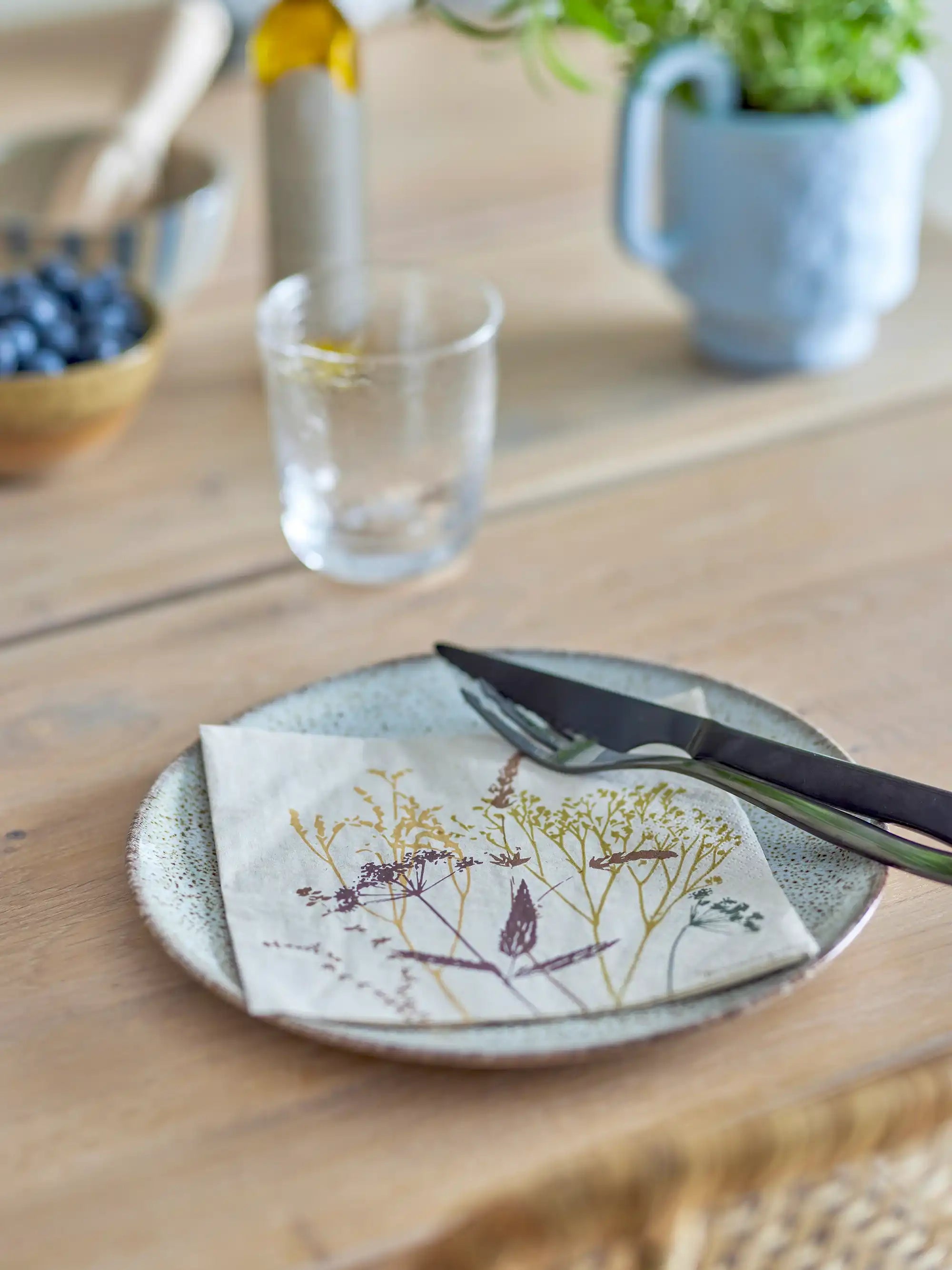 Por qué querrás tener estas servilletas: Con las servilletas Sirri de Bloomingville, tu mesa puesta adquiere al instante un ambiente cálido y acogedor. Su delicado motivo floral en tonos suaves y naturales aporta un sutil toque escandinavo, tanto si sirves un almuerzo entre semana como si organizas una velada especial con amigos.