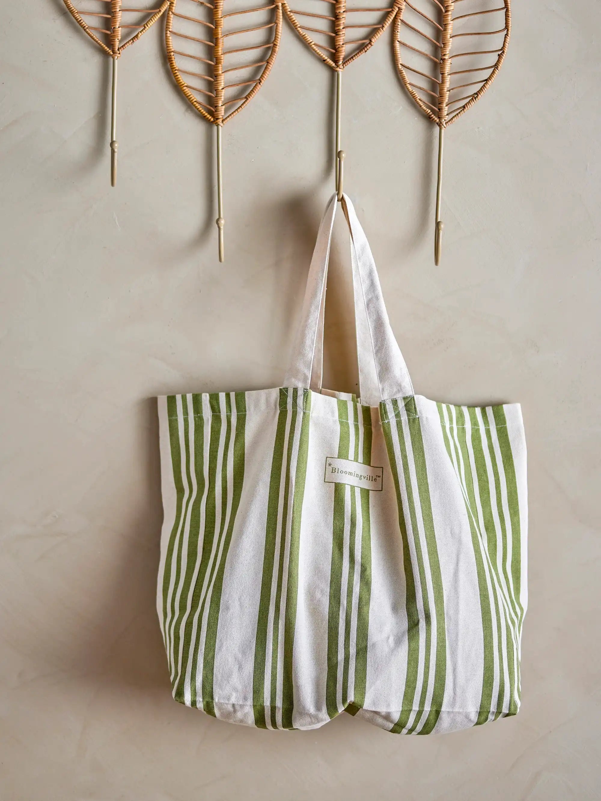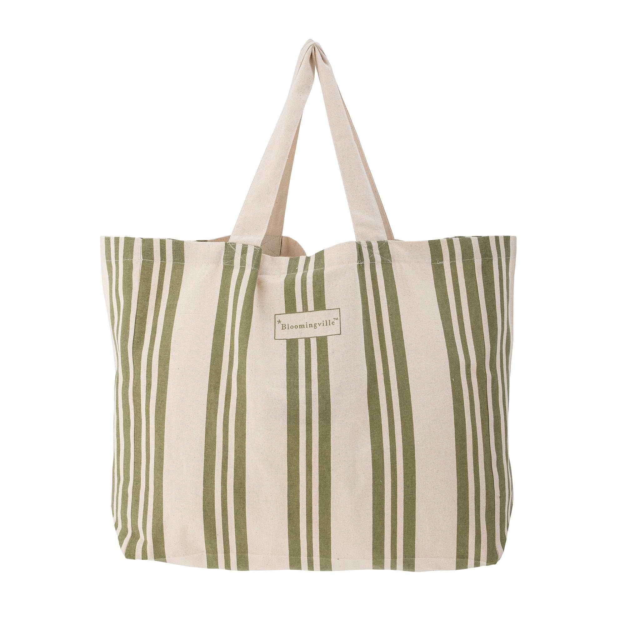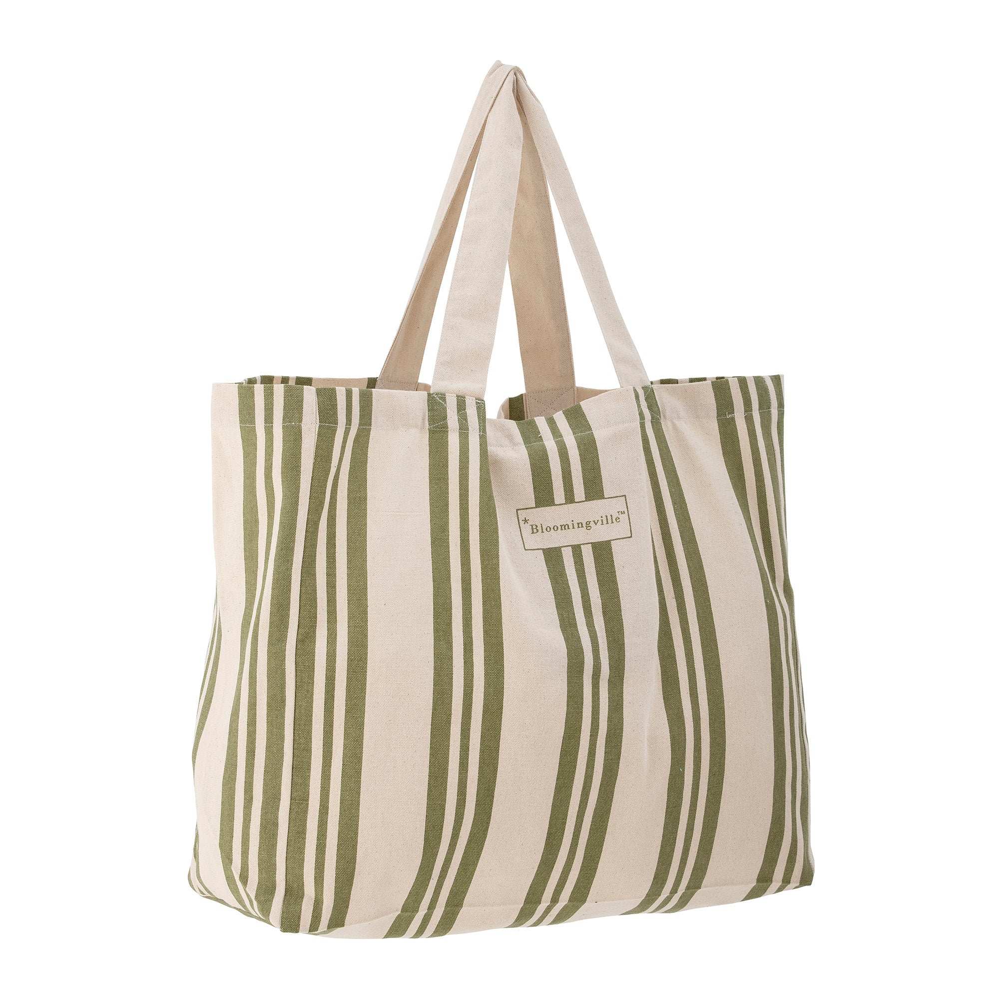 Por qué querrás tener este shopper de Bloomingville: Ya sea que vayas de compras o pases un día en la playa, con este shopper espacioso y elegante siempre tendrás tus esenciales a mano de forma práctica y con estilo. El diseño escandinavo aporta un toque fresco a tu look, y las sutiles rayas verdes hacen que este bolso combine fácilmente con cualquier conjunto.