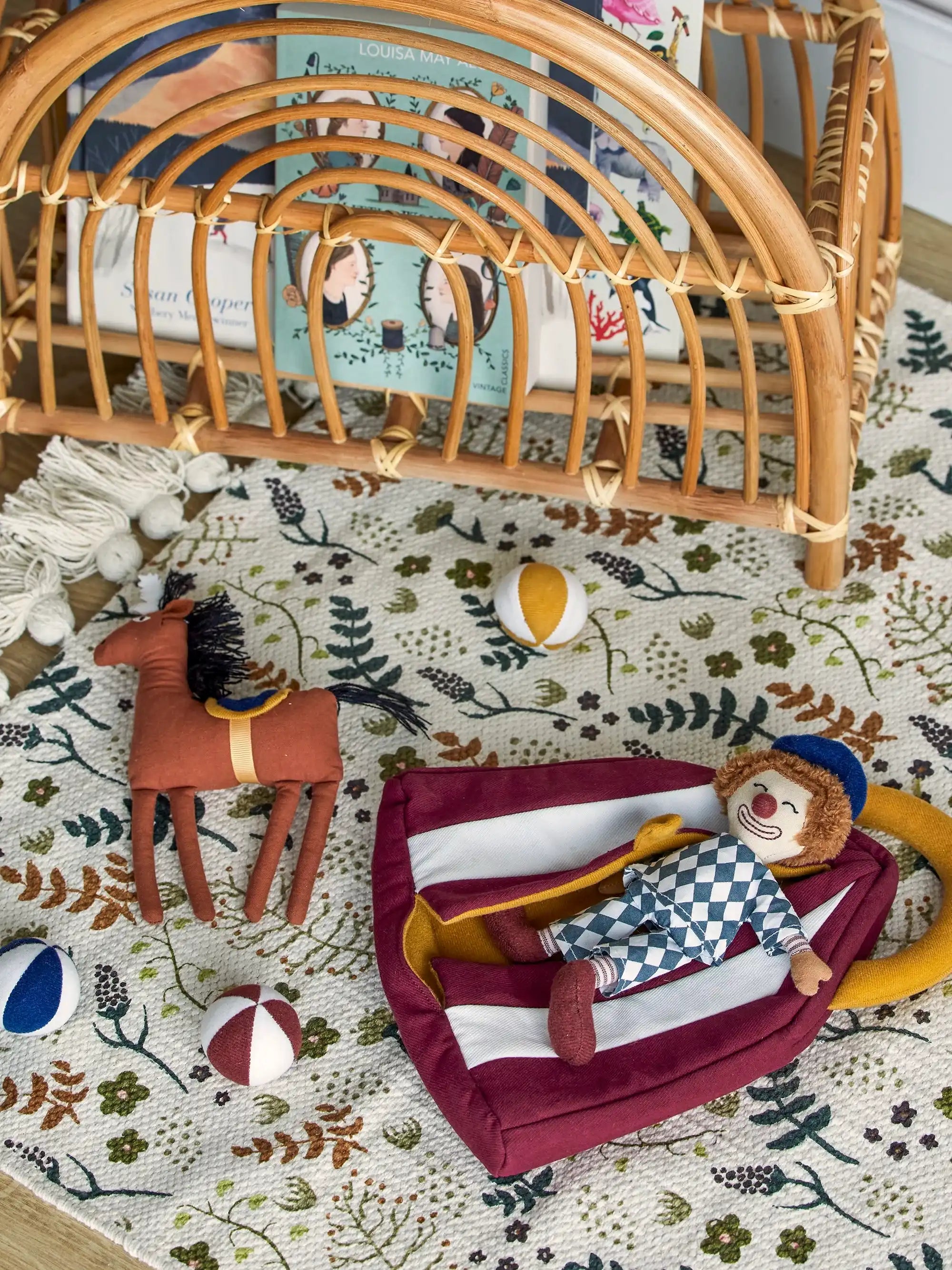 Por qué querrás tener el set de juego Theobald de BLOOMINGVILLE MINI: Lleva un toque de ambiente circense al cuarto de los peques con este alegre set de BLOOMINGVILLE MINI. Con el payaso, la carpa de circo, el caballo y tres pelotas de colores, tu hijo podrá inventar sus propias historias divertidas. Todo es suave al tacto y los colores dulces hacen que jugar sea aún más agradable. Perfecto para momentos tranquilos en el sofá o para jugar cómodamente en el suelo. Sin bordes duros, solo diversión suave y abrazable. Olvídate de la pantalla, porque este set garantiza horas de juego sin fin, estés donde estés.