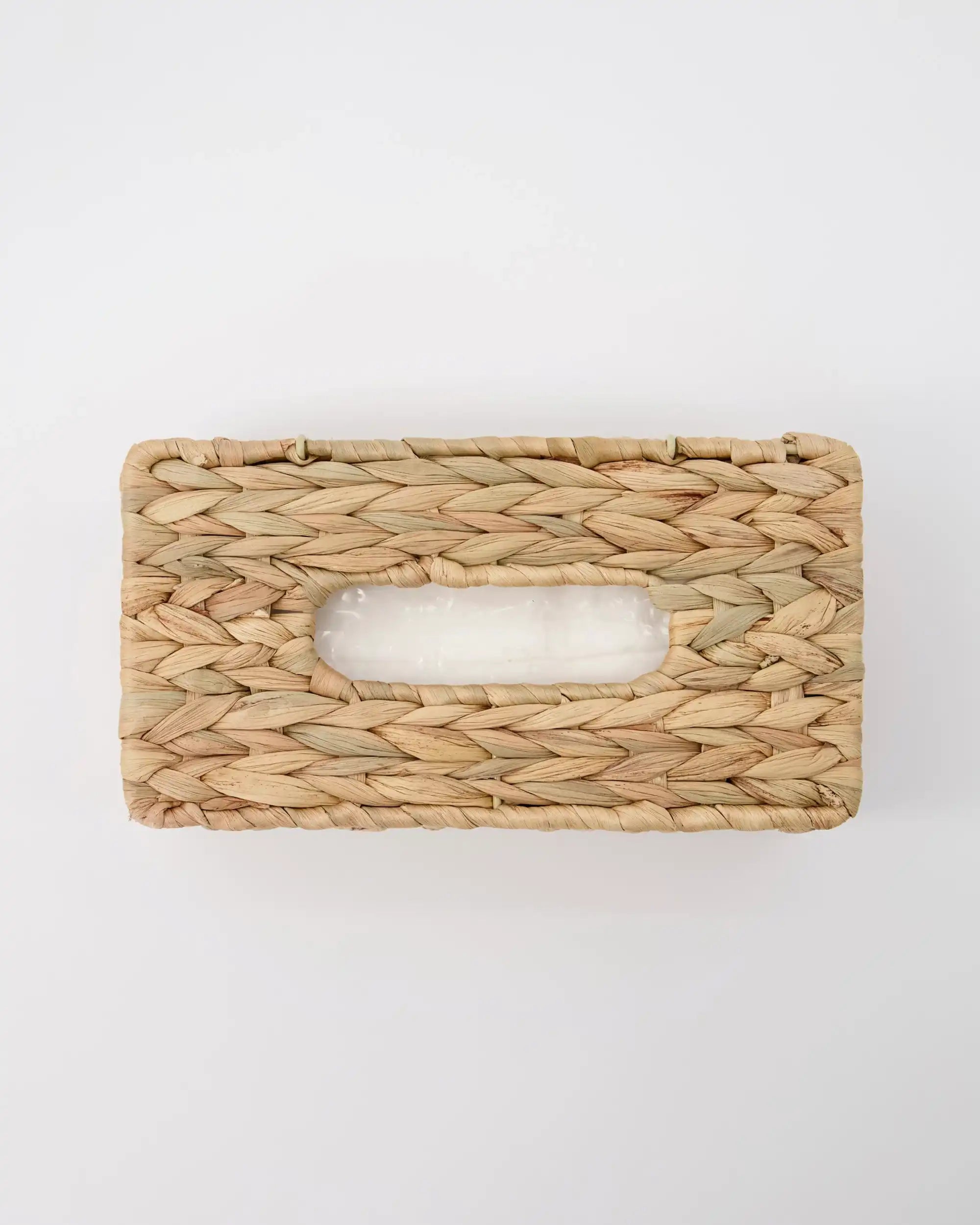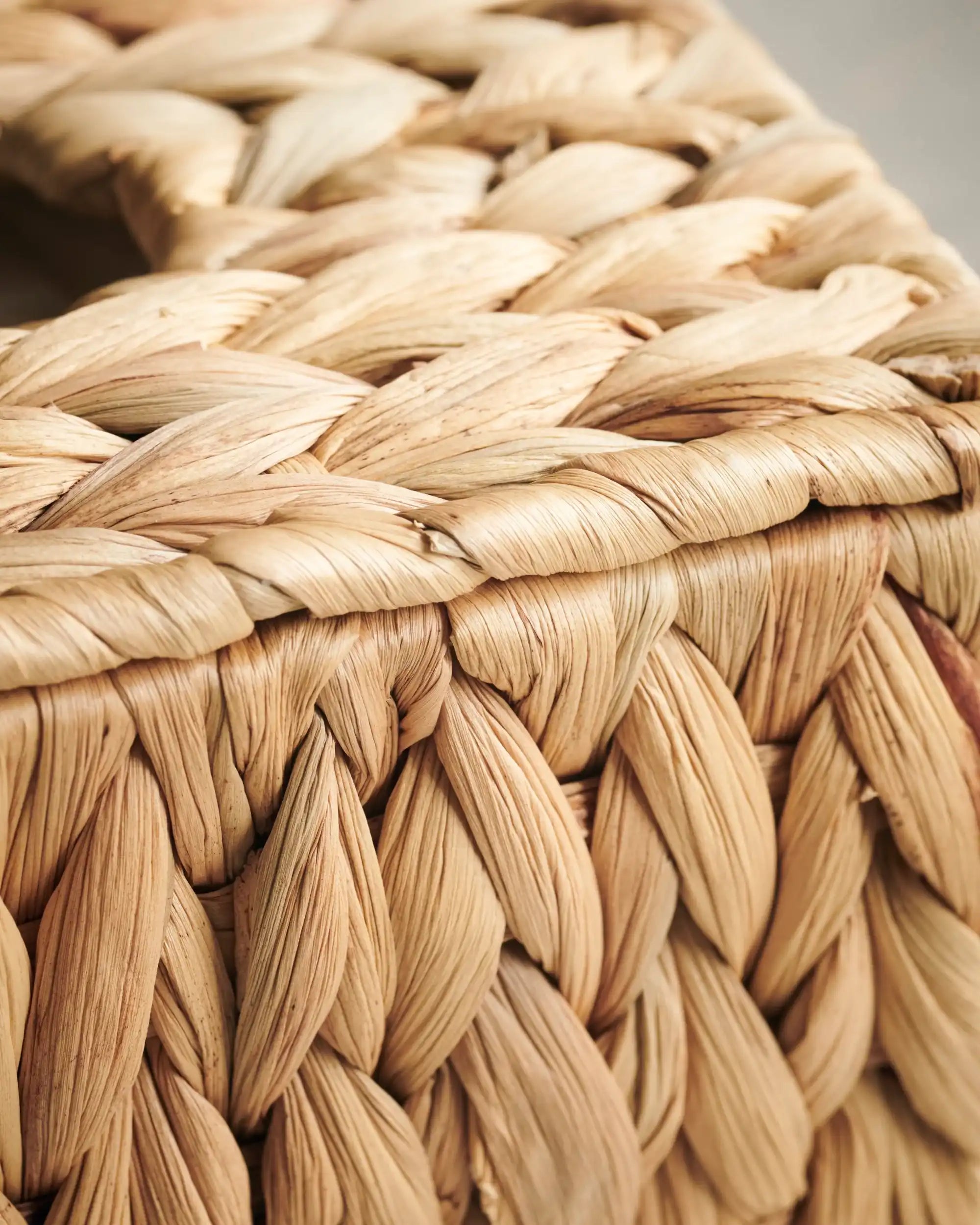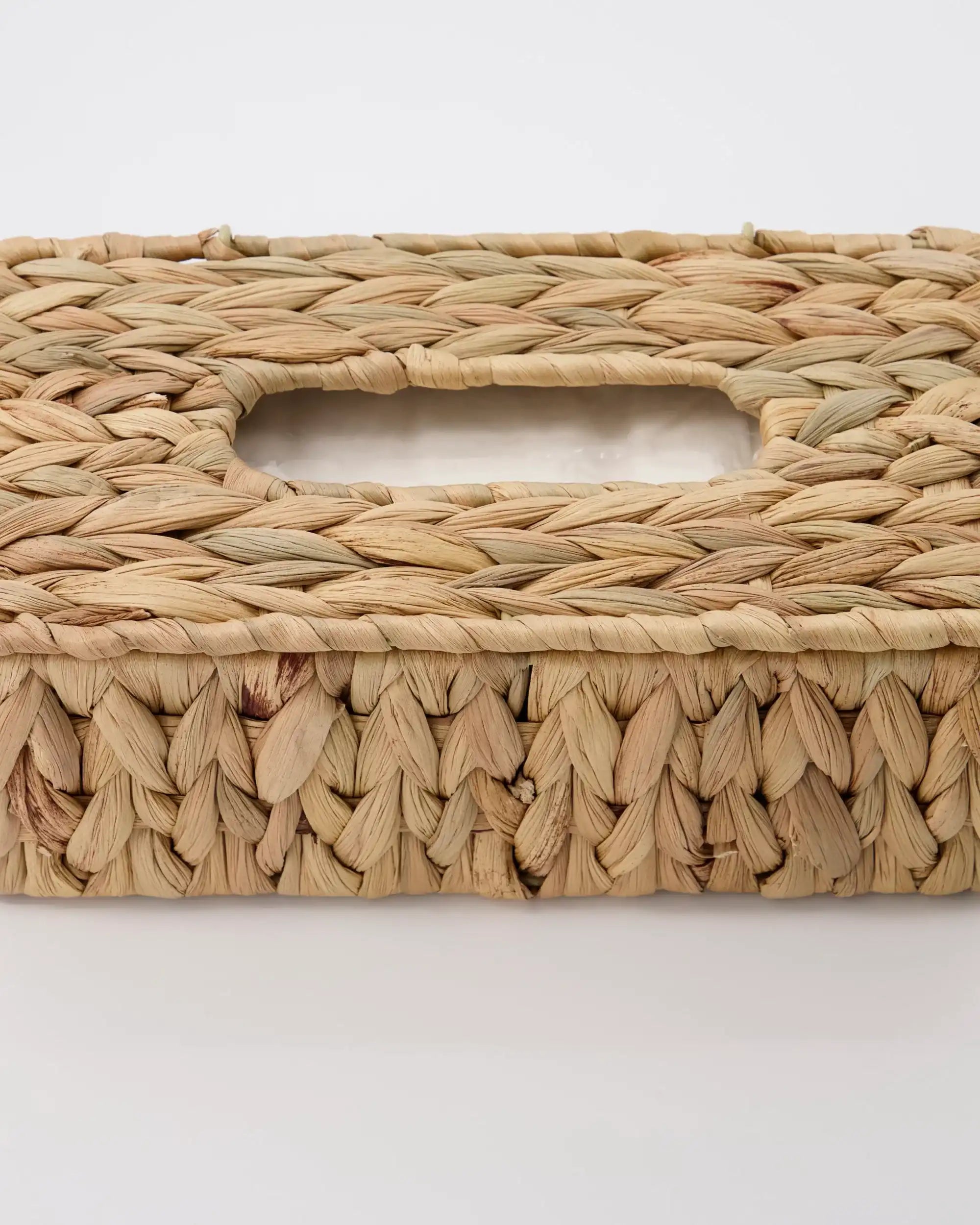 El portapañuelos está cuidadosamente tejido a mano con jacinto de agua, un material sostenible conocido por su suave estructura trenzada. El color natural resalta su carácter ligero y combina perfectamente con superficies limpias como mármol o cerámica. Con unas medidas de 27 cm de largo, 14 cm de ancho y 9 cm de alto, encaja fácilmente en casi cualquier superficie de tu hogar.