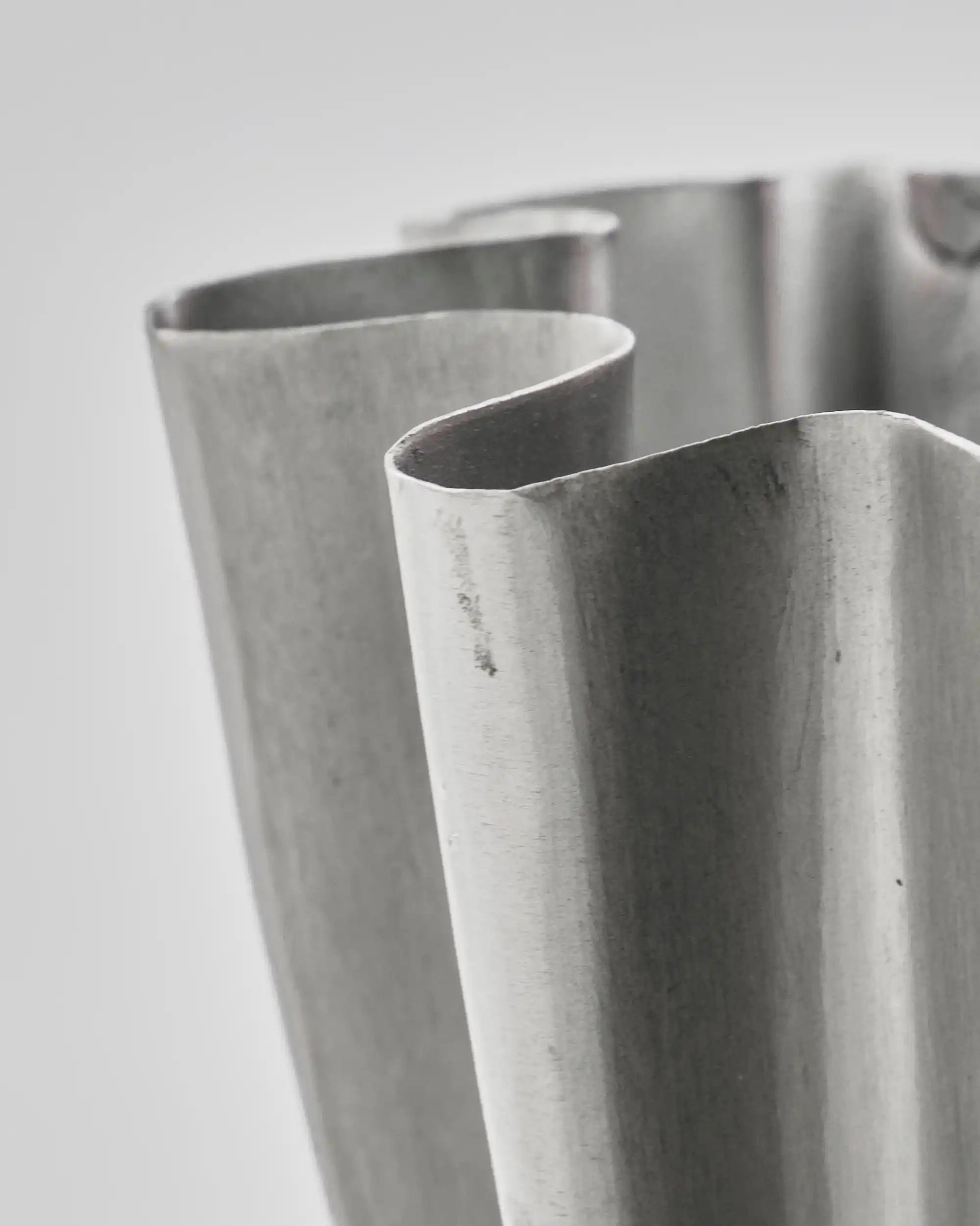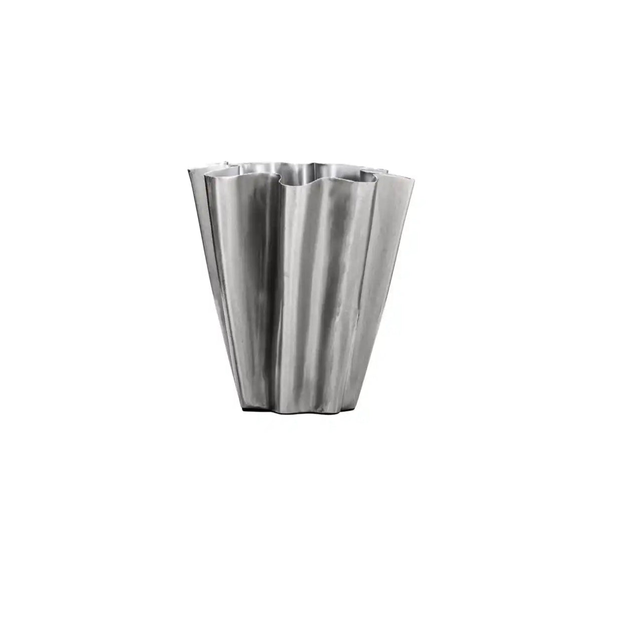 El material metálico duradero y el acabado plateado le dan al jarrón un aire industrial, mientras que la forma elegante aporta un look atemporal. La combinación de formas angulares con una superficie sutilmente brillante convierte este jarrón en el complemento decorativo perfecto para quienes aman los accesorios minimalistas pero acogedores.