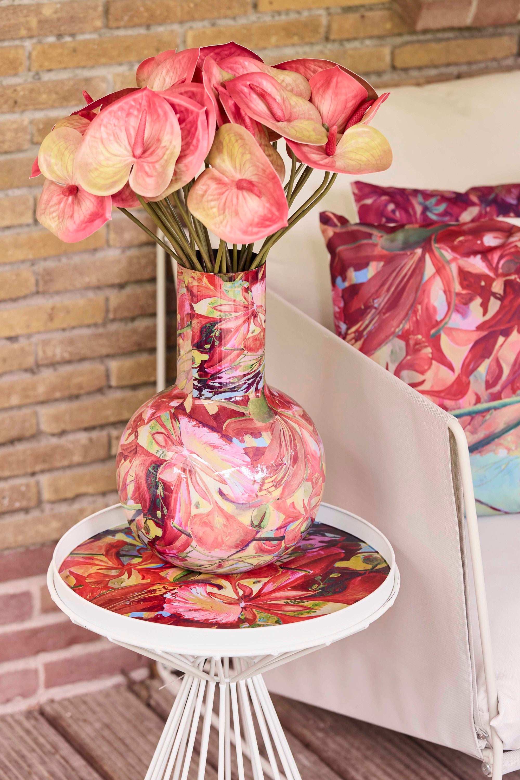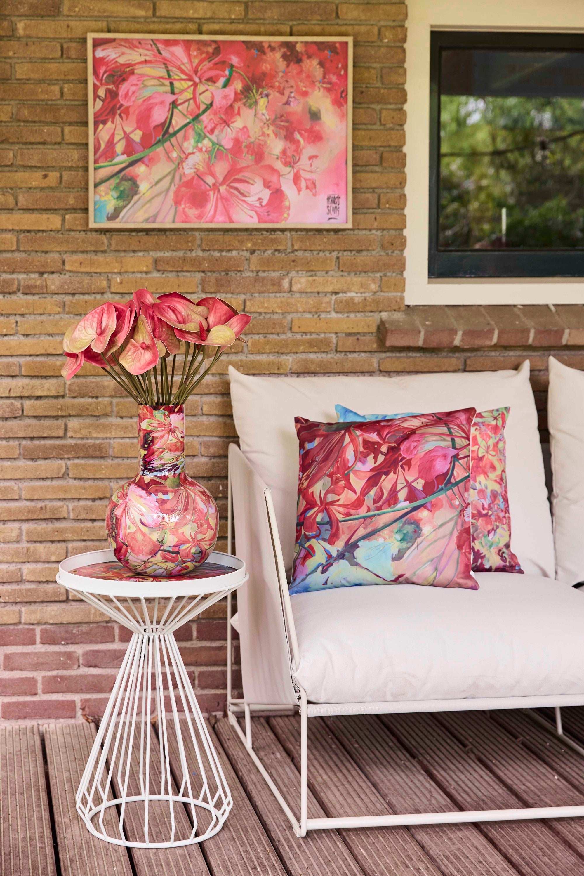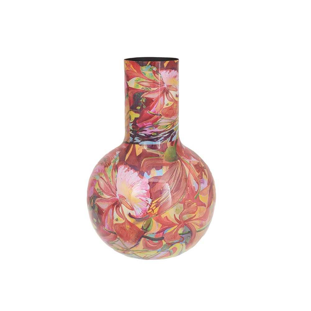 Con su estilo característico lleno de profundidad, color y emoción, Sling ha creado un patrón floral que rebosa energía. Este jarrón, hecho de metal resistente y decorado con un rico y colorido estampado floral, es un homenaje a la flora tropical y la libertad artística. Cada pincelada cuenta una historia: de Curazao a tu hogar.