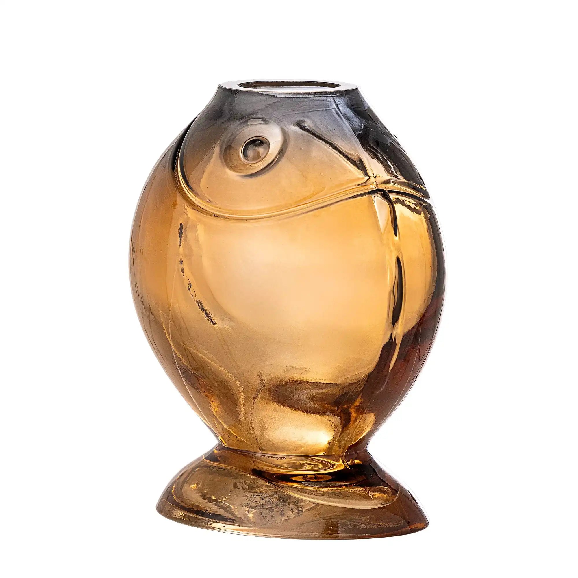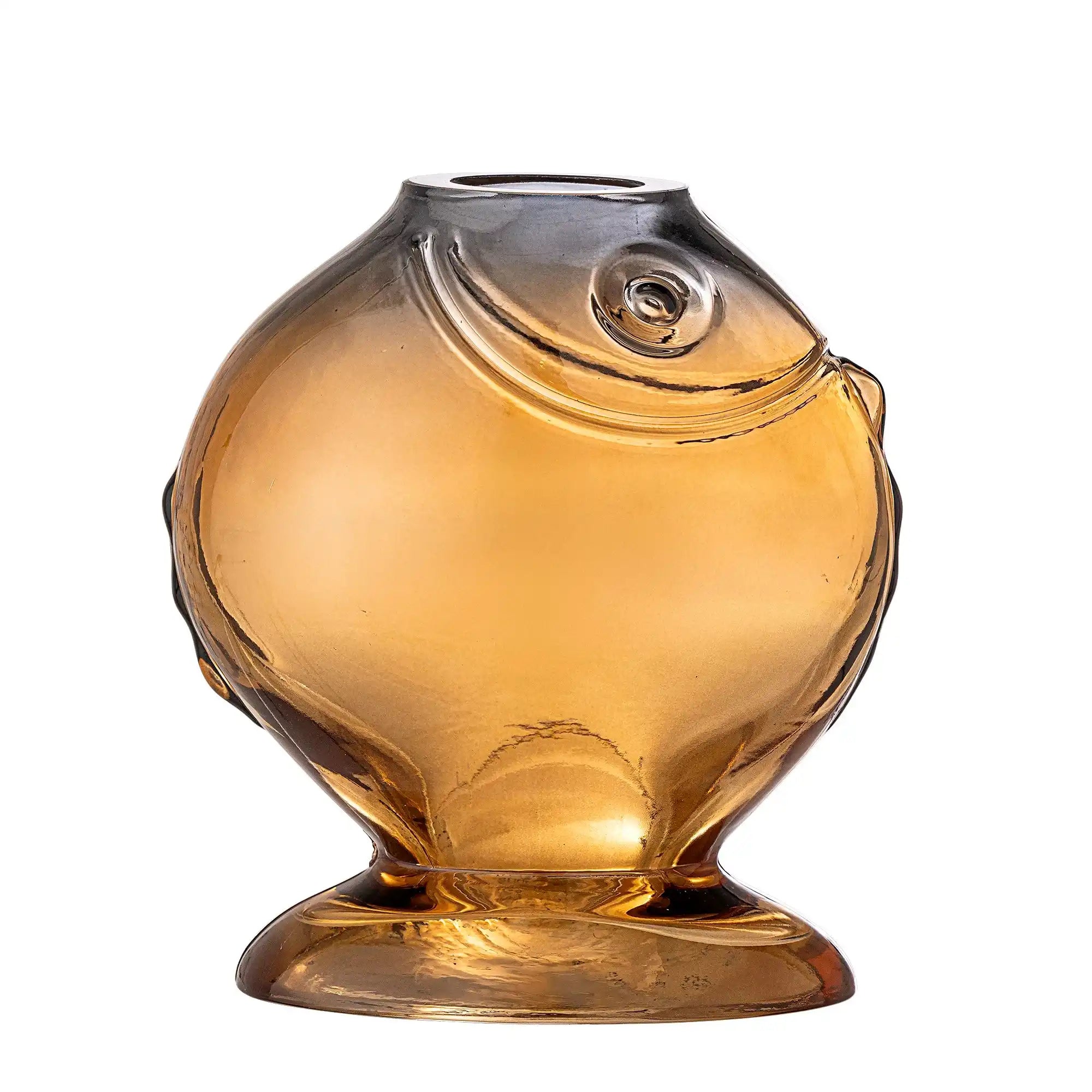 Detalles & material: Hecho de vidrio y soplado a mano, cada ejemplar se siente único. El tamaño b × h × d 10.5 × 16 × 15 cm la hace compacta y fácil de colocar, desde una estantería abierta hasta la mesita de noche. Gracias a la delicada capa de color – amarillo con matices dorados y azules brillantes – la superficie irradia suavemente cuando la luz incide sobre ella. La silueta en forma de pez añade dinamismo sin resultar recargada; así, el jarrón funciona como pieza decorativa autónoma y como alegre soporte para un pequeño ramo.