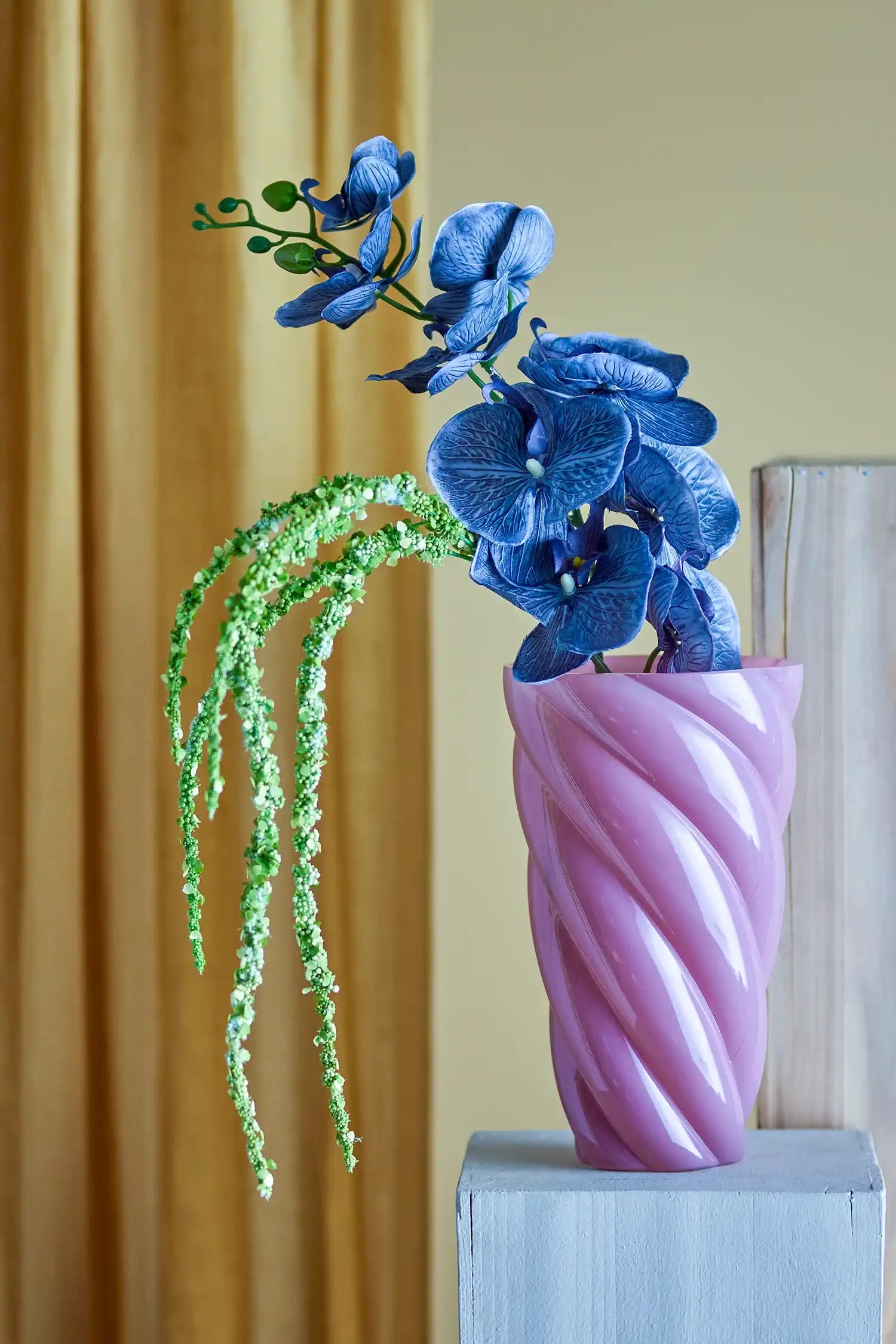 Detalles y material: Este jarrón de lujo está soplado a mano con vidrio de alta calidad y se distingue por un refinado patrón giratorio que añade sutilmente profundidad y movimiento. Con una altura de 29 cm y un diámetro de 17 cm, ofrece espacio para un ramo generoso, pero también luce precioso como pieza decorativa incluso sin flores.