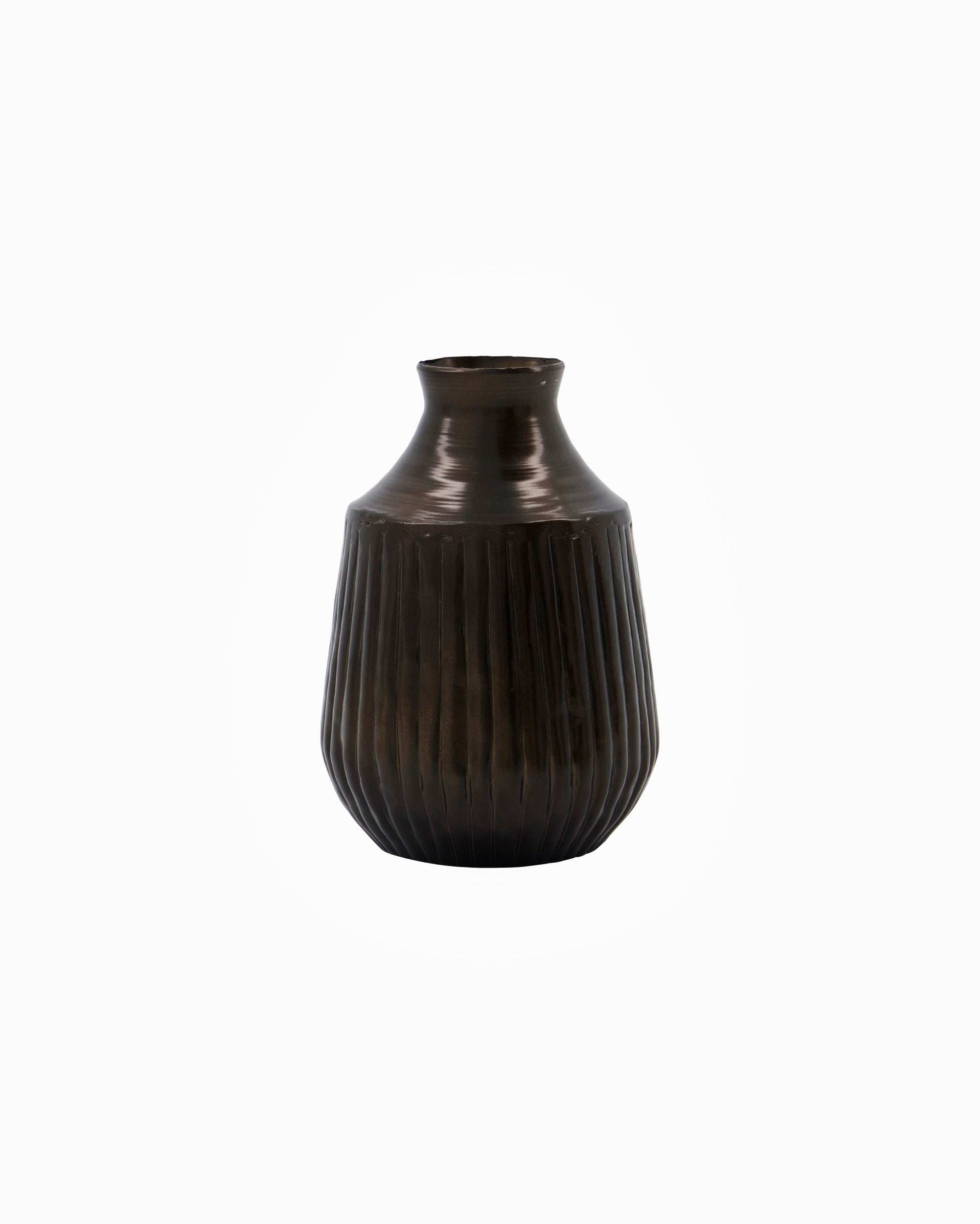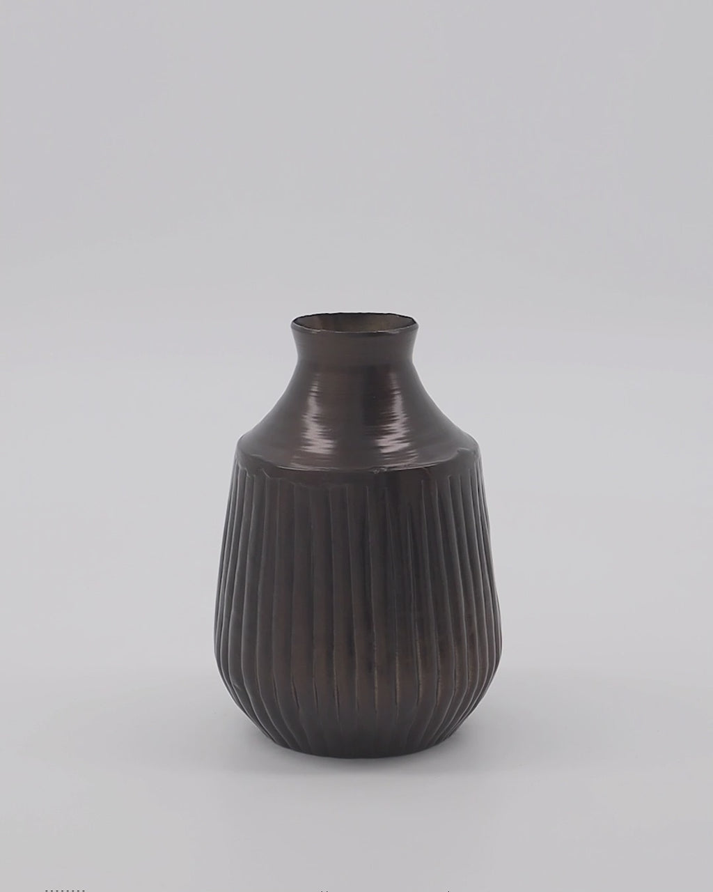 Aporta calidez y carácter a tu interior con el jarrón Groove de House Doctor. Este precioso jarrón de 15 cm de alto está hecho a mano en aluminio y acabado en un profundo tono marrón antiguo. La llamativa textura acanalada y la forma redondeada le dan profundidad extra y lo convierten en un elegante punto focal en cualquier espacio.
