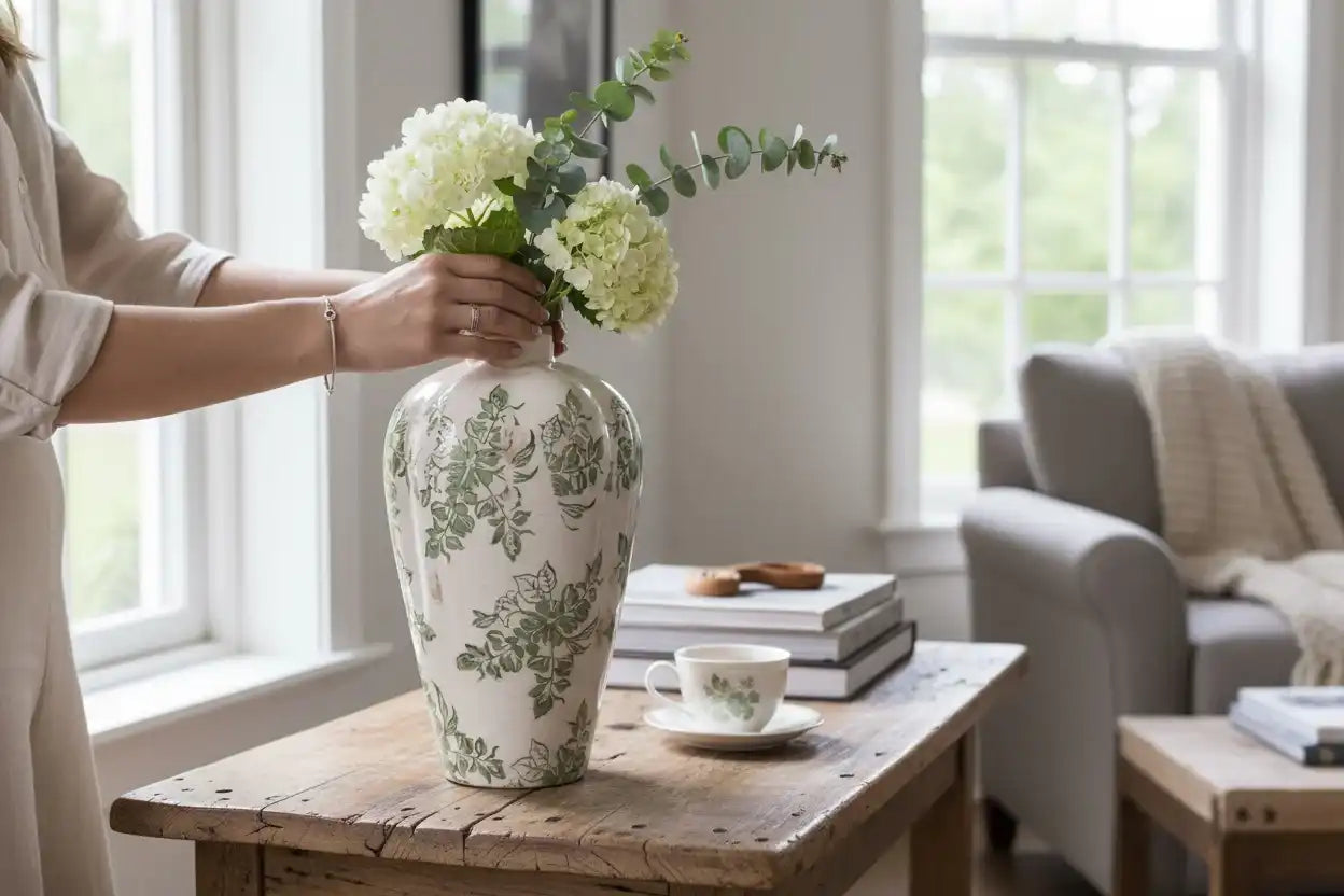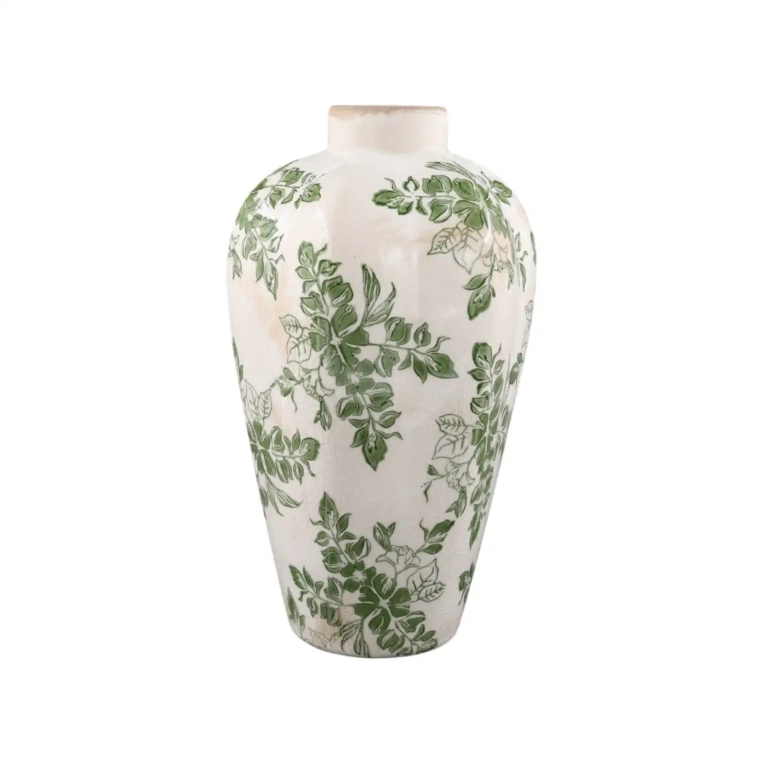 El Jarrón Jona en formato grande es una pieza llamativa que combina artesanía y elegancia sin esfuerzo. Este jarrón pintado a mano está decorado con un refinado motivo de hojas en tonos verde fresco sobre una base blanca suave. La sutil estructura craquelada del esmalte le da un aspecto vintage y vivido que encaja perfectamente tanto en interiores clásicos como modernos.