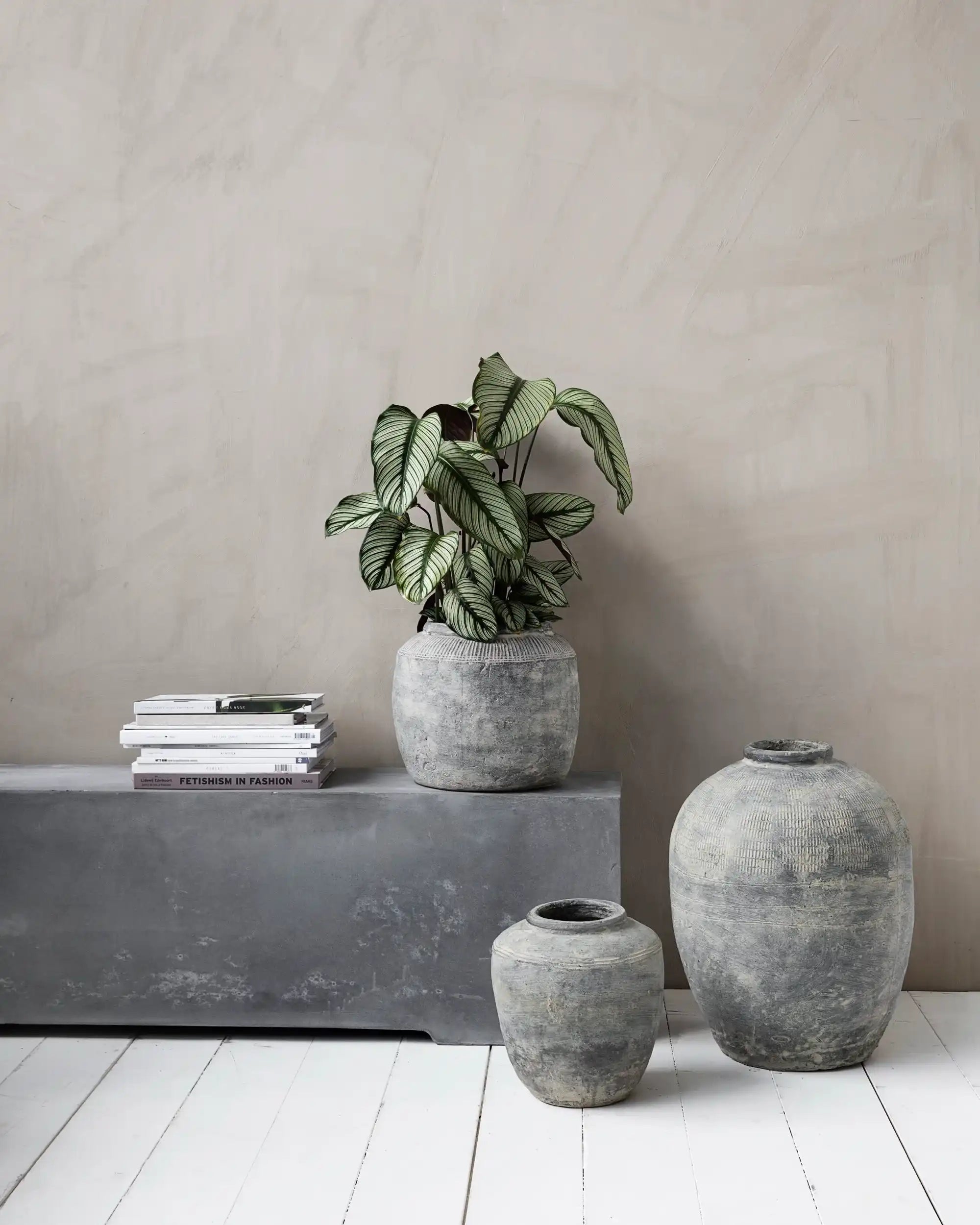 Rustik está hecho de hormigón resistente y tiene un bonito tono gris natural. Con una altura generosa de 47 cm y un diámetro de 37 cm, es un verdadero punto de atracción, por ejemplo, en el suelo de tu recibidor o junto al sofá. El material robusto y el color sobrio le dan un aspecto atemporal que se mezcla fácilmente con otros estilos.