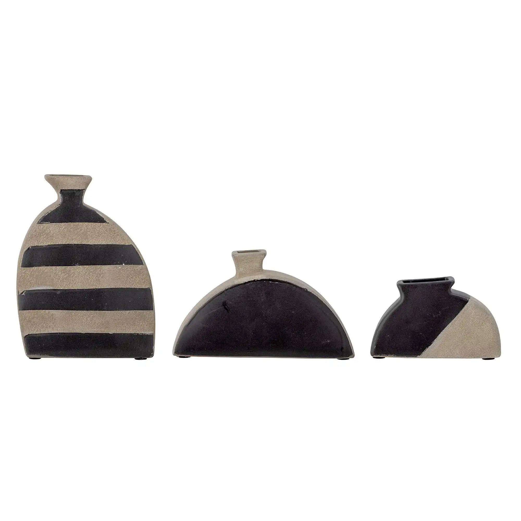 Cada jarrón está decorado a mano, lo que le da a cada pieza un aspecto único. Están hechos de terracota de alta calidad y tienen una forma estrecha y escultórica. El set incluye tres tamaños diferentes: