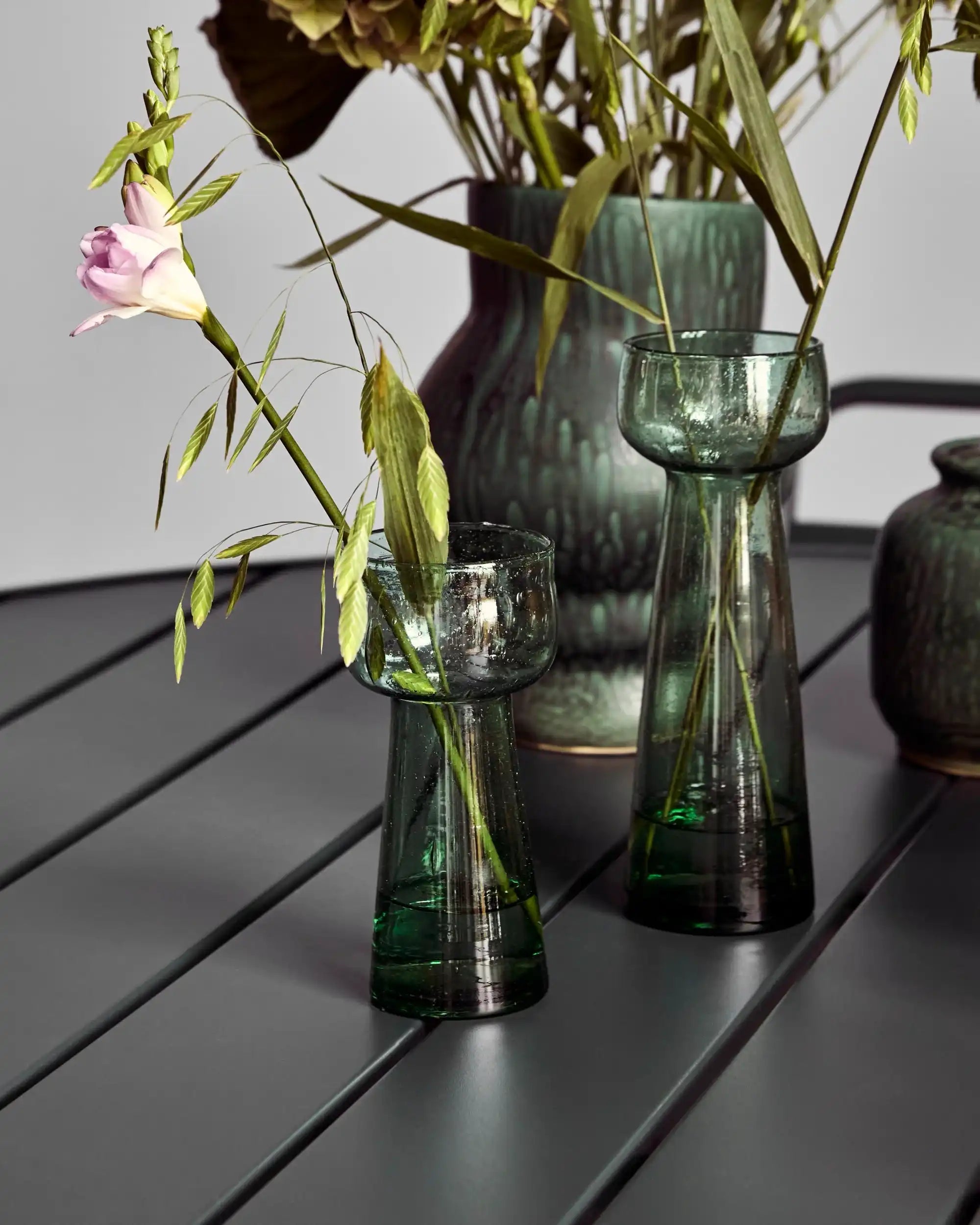 El jarrón está hecho de vidrio verde con variaciones naturales de color que hacen que cada pieza sea única. Gracias a la base cilíndrica ancha, se mantiene estable, mientras que el cuello delgado y la abertura redonda son perfectos para una sola flor o un ramo sutil. Con una altura de 16,5 cm y un diámetro de 8 cm, es un acento compacto pero llamativo en tu hogar.