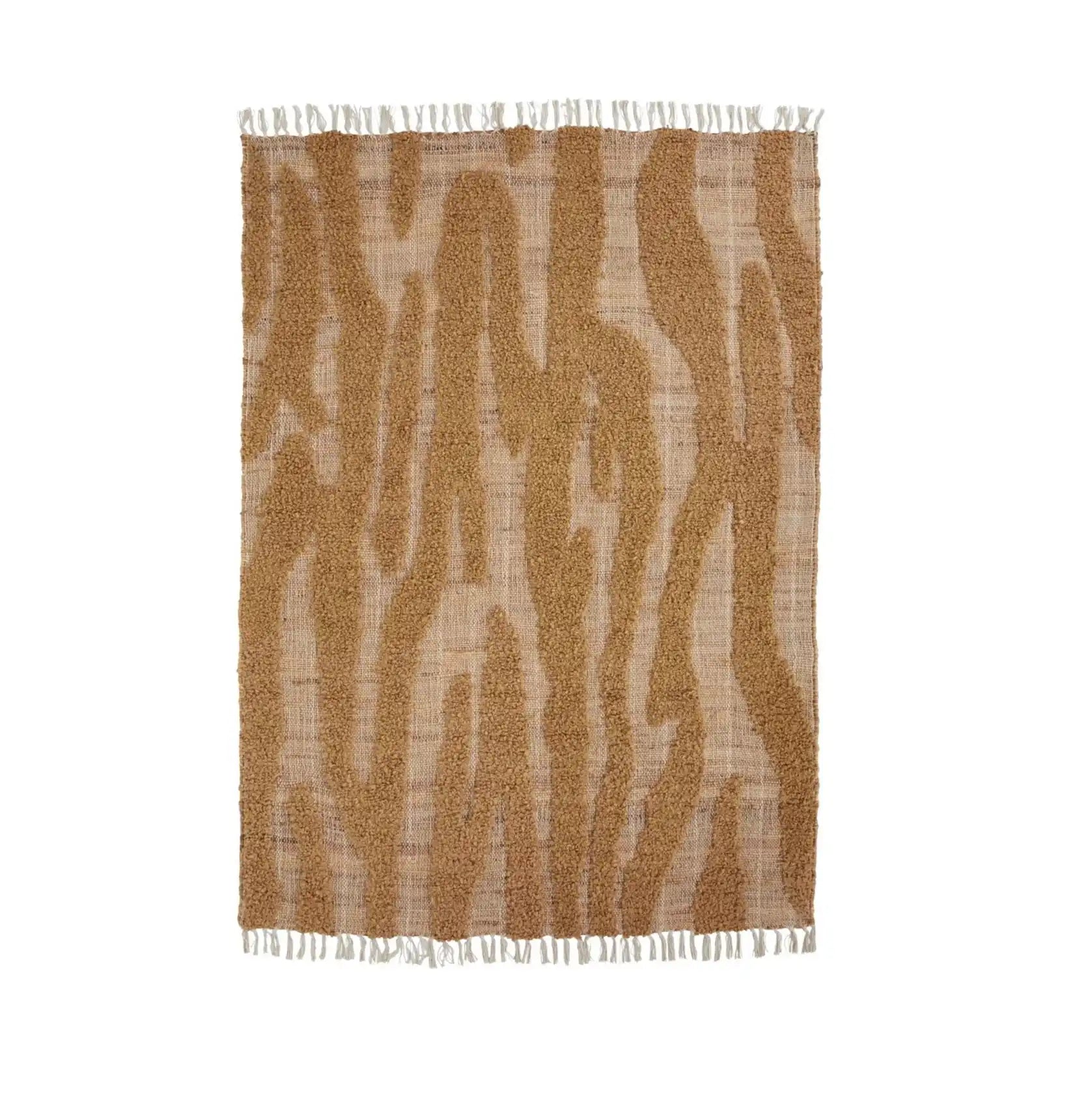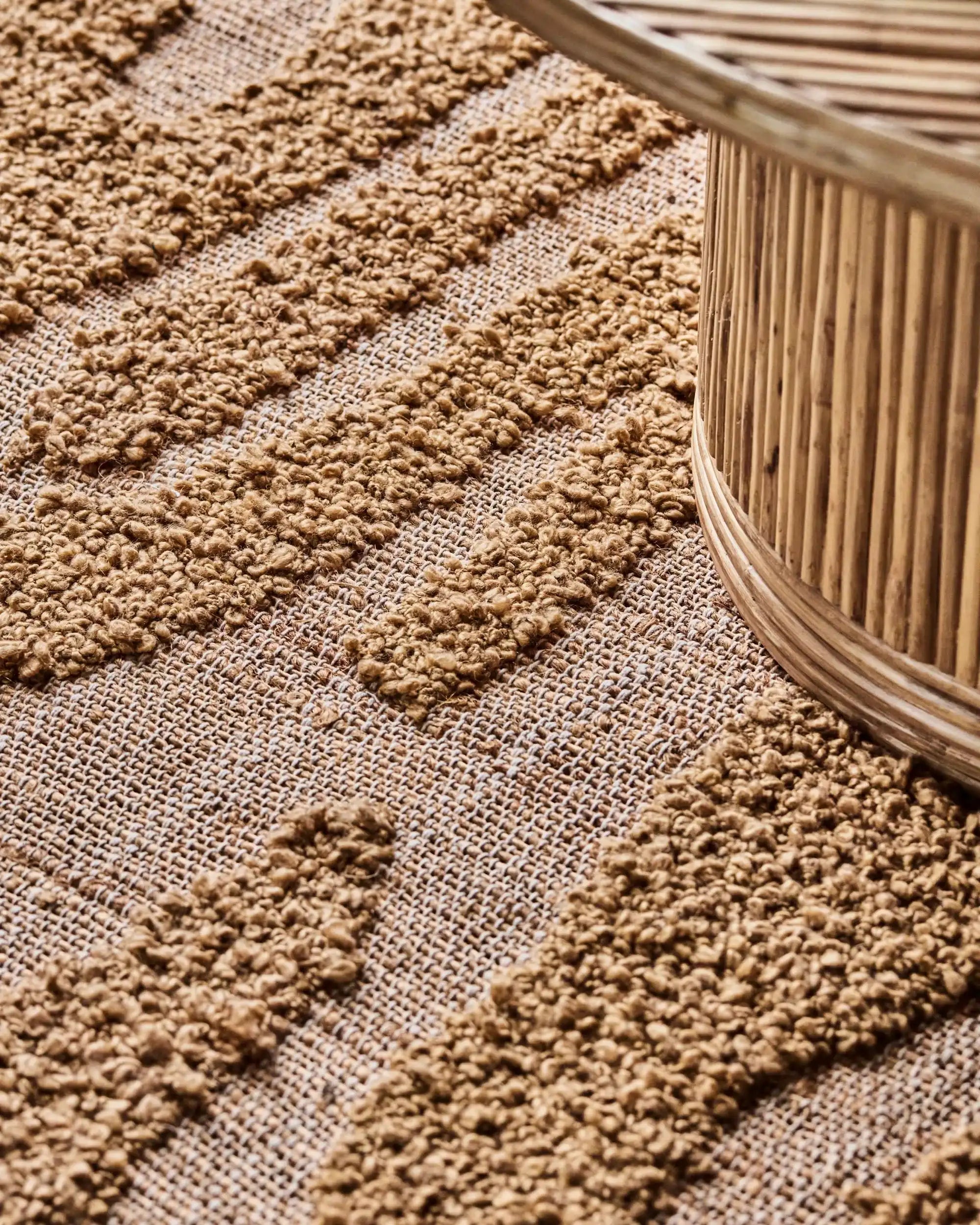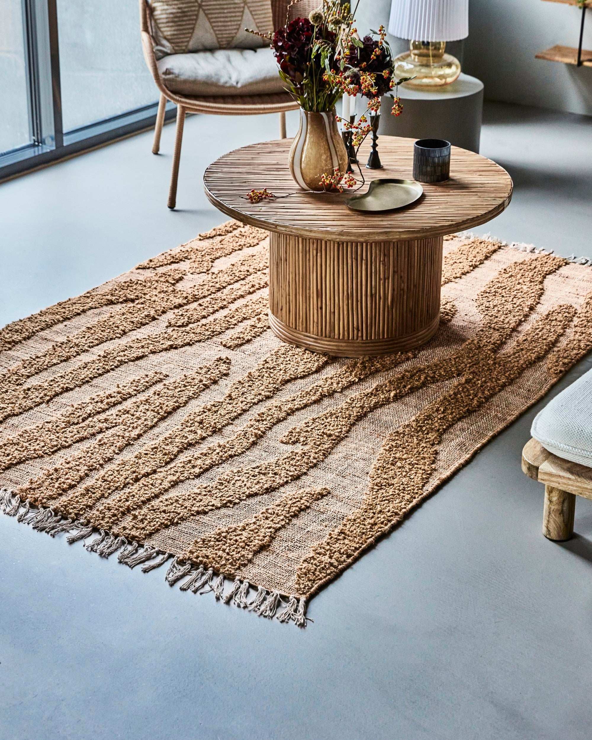 La alfombra está hecha de una mezcla equilibrada de yute natural, poliéster cómodo e hilos de algodón suave. Esta combinación ofrece una textura agradable y una larga durabilidad. La textura tejida añade una variación sutil, lo que hace que la alfombra combine perfectamente con muebles de madera, acero o cerámica.