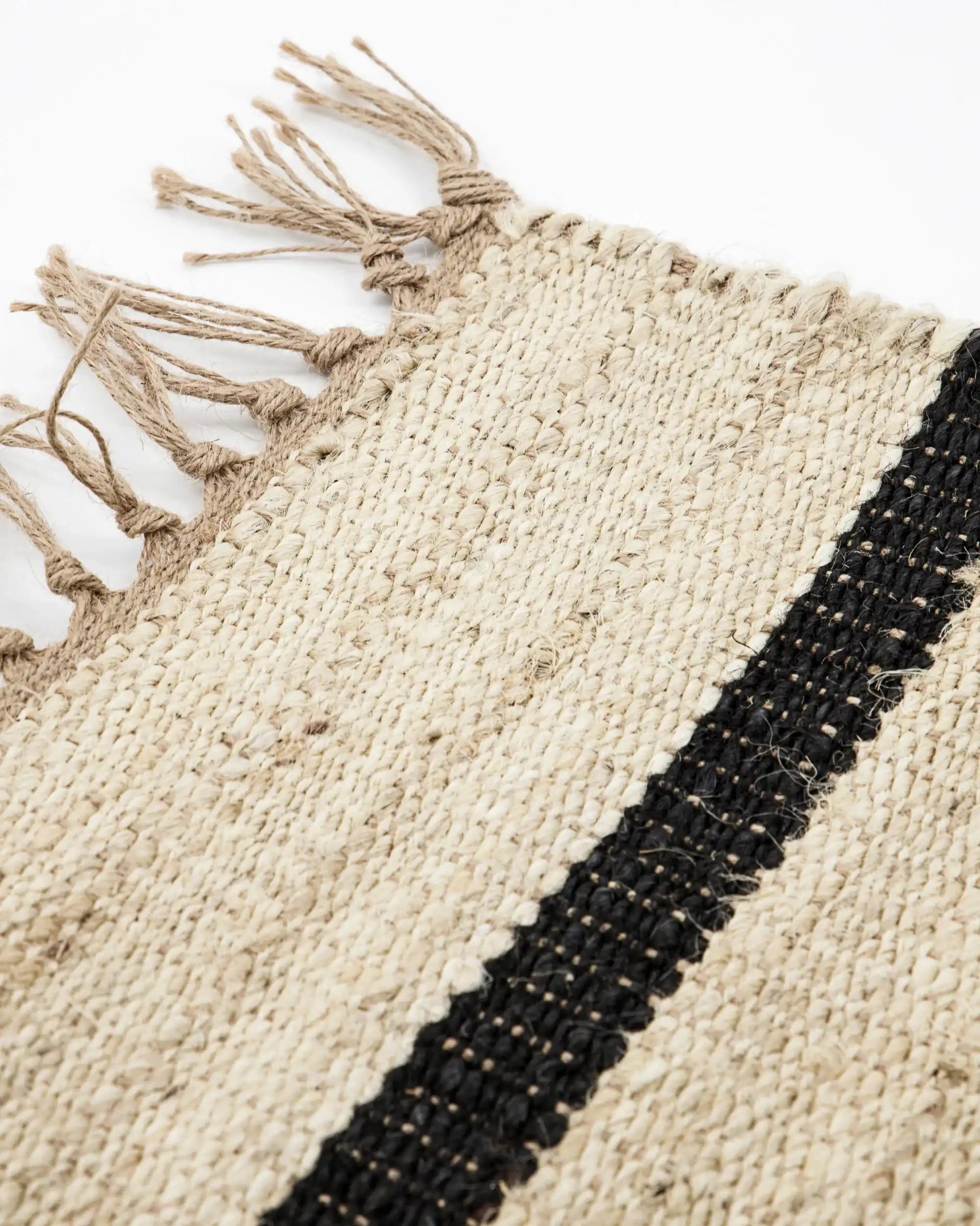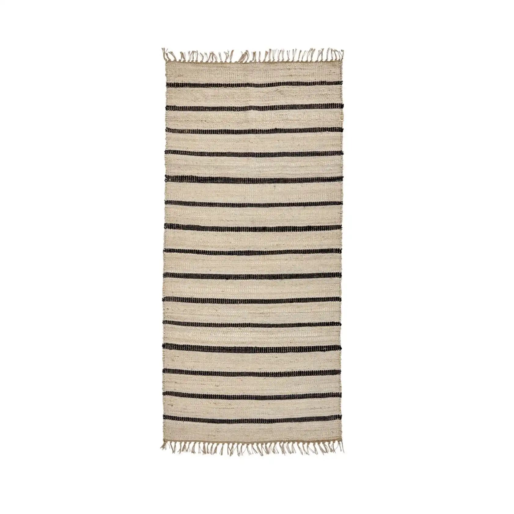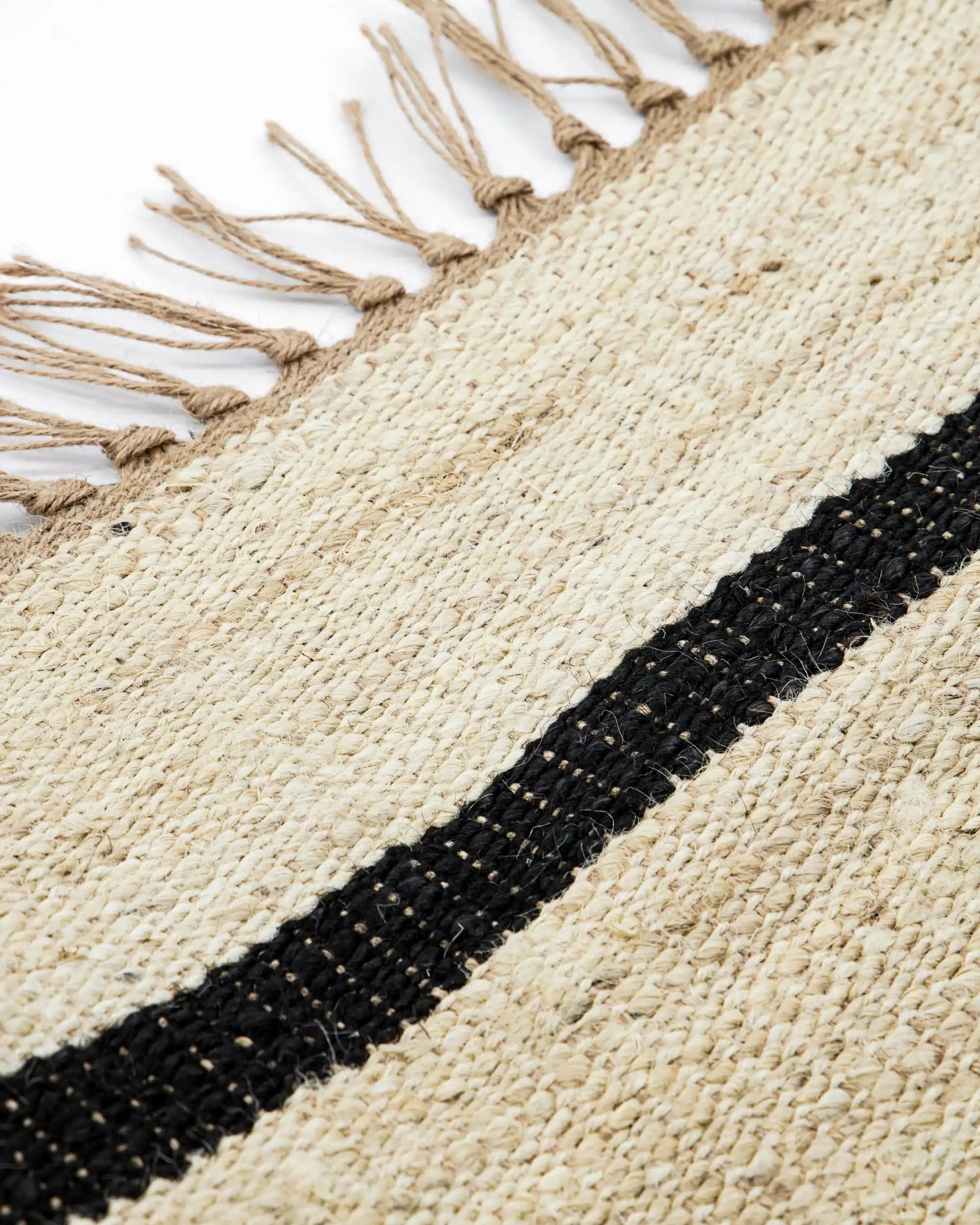 Gracias a su generoso tamaño de 90 por 200 cm, esta alfombra es ideal para tu recibidor, dormitorio o como un sutil punto focal bajo la mesa del comedor. La mezcla de franjas negras llenas de carácter sobre la base suave de yute le da a tu interior un aire robusto pero atemporal. Cada pieza es única por los matices naturales del material.