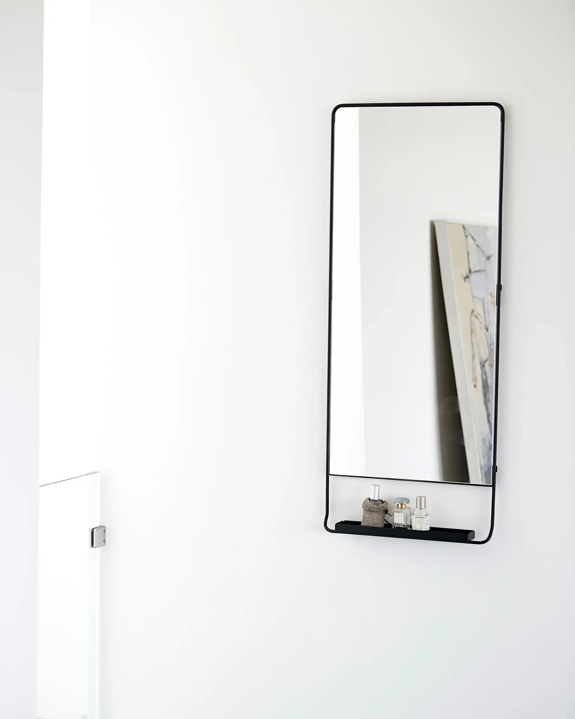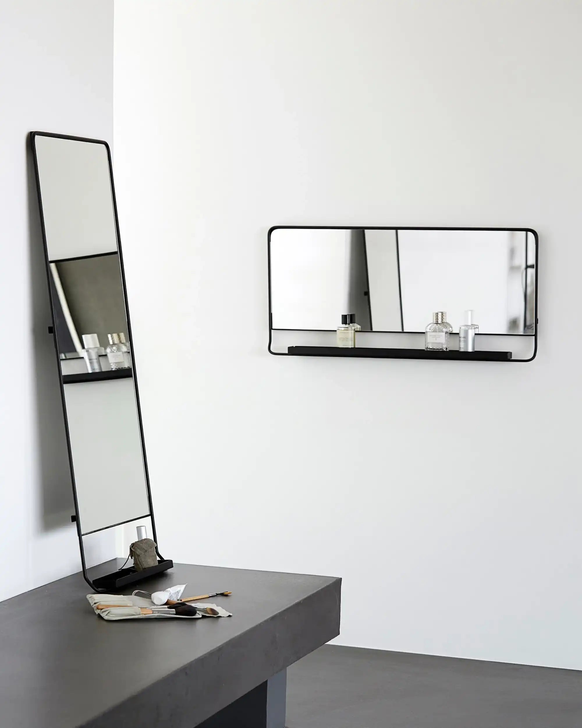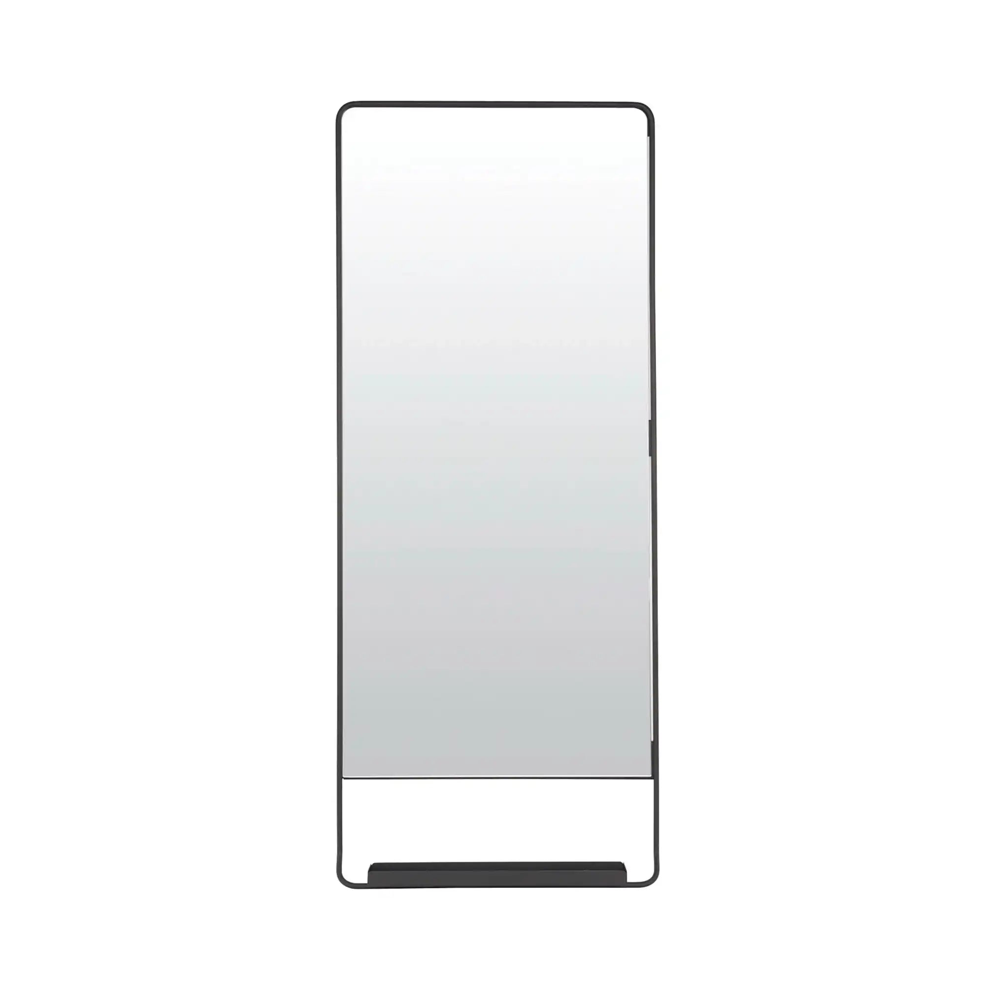 El espejo está fabricado en metal y vidrio, y tiene un acabado negro que combina perfectamente con varios estilos de interior. Con una altura de 110 cm y un ancho de 45 cm, ofrece una superficie de espejo generosa, mientras que la repisa de 7 cm de profundidad proporciona justo el espacio suficiente para un pequeño jarrón, un frasco de perfume u otros objetos favoritos. El diseño atemporal lo hace relevante durante años.