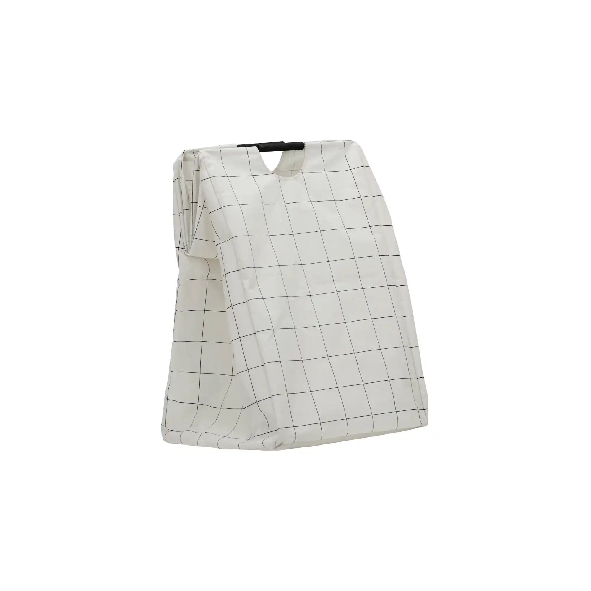 Esta bolsa independiente está hecha de un material resistente y viene en un blanco brillante con un patrón minimalista de cuadros. Gracias a su forma fija, la bolsa se mantiene perfectamente erguida. Con una altura de 60 cm y un ancho y profundidad de 40 cm cada uno, ofrece espacio suficiente para tu ropa sucia. Las asas integradas a ambos lados facilitan el traslado.
