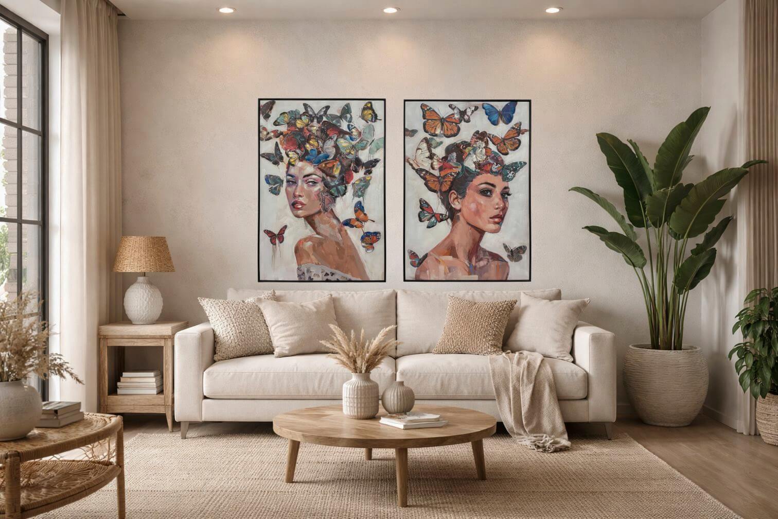 Perhoset muodostavat muotokuvan ympärille dynaamisen sommitelman ja antavat taululle leikkisän, lähes maagisen vaikutelman. Lämpimien sävyjen, luonnollisten värien ja värikkäiden korostusten sekoitus tekee tästä teoksesta todellisen katseenvangitsijan seinälle. Reilun kokonsa ansiosta taulu sopii täydellisesti olohuoneeseen, eteiseen tai lipaston yläpuolelle.