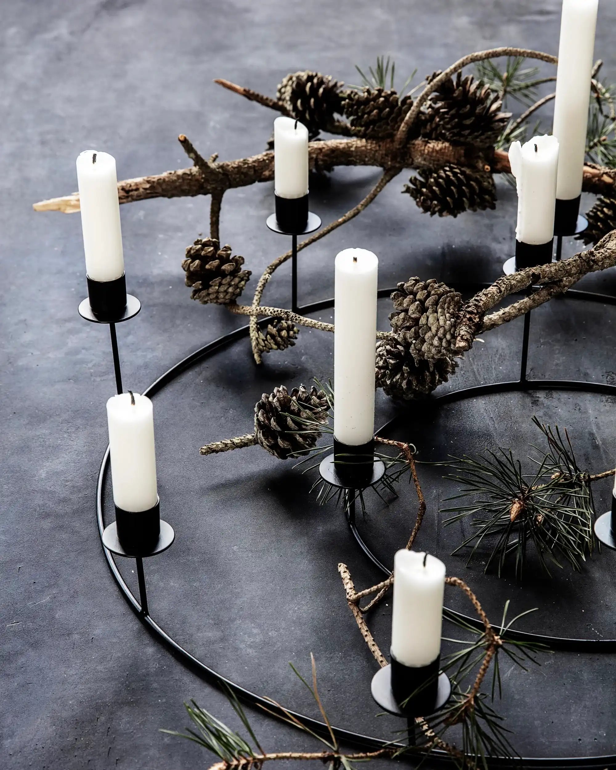 Teline on valmistettu lujasta metallista ja viimeistelty mattamustaksi. 11,5 cm:n korkeus ja avara 50 cm:n läpimitta tuovat sommitteluun luontevasti näyttävyyttä ja tasapainoa. Kahdeksan kynttiläpaikkaa ovat eri korkeuksilla, mikä luo leikkisän ja elävän kokonaisuuden, kun kynttilät palavat.