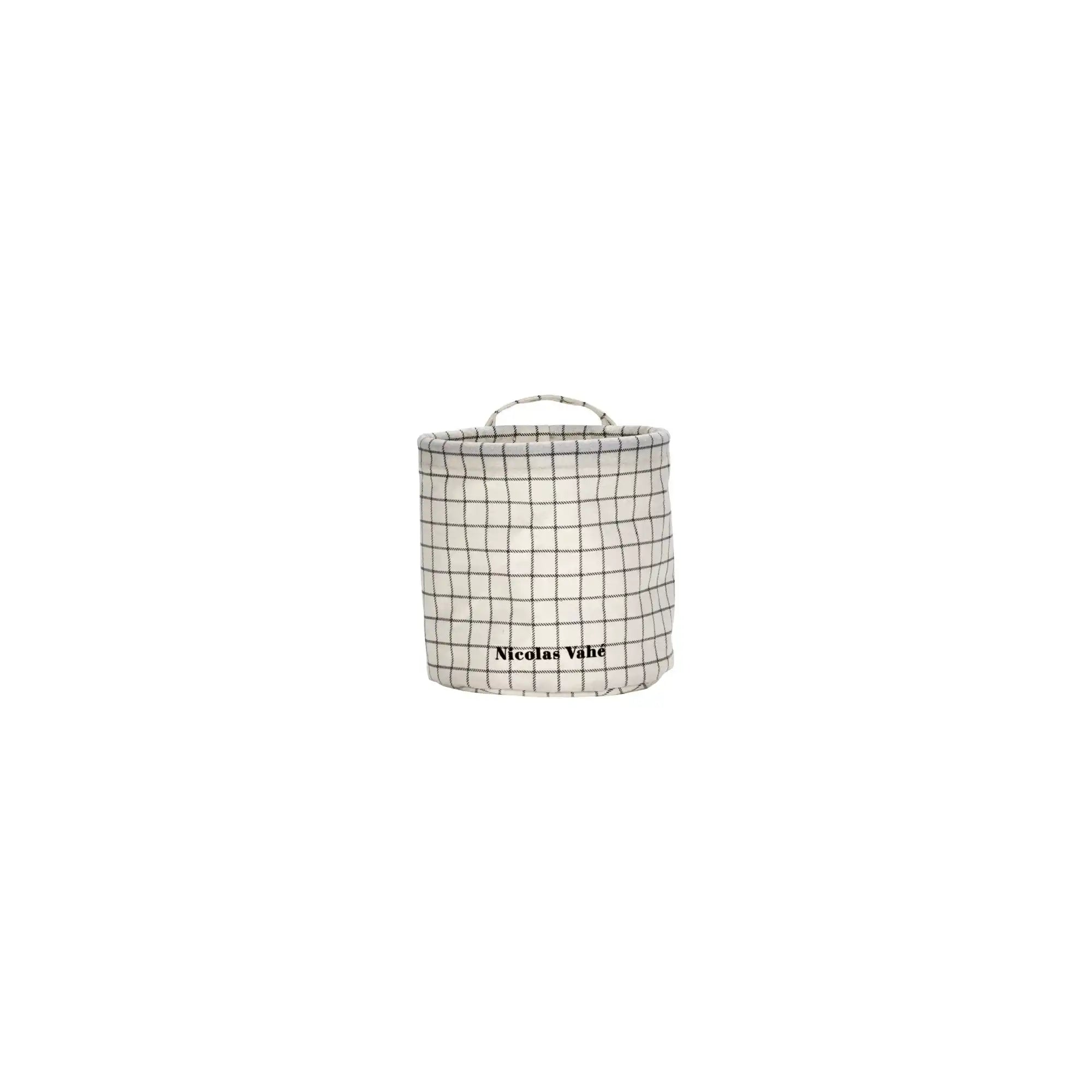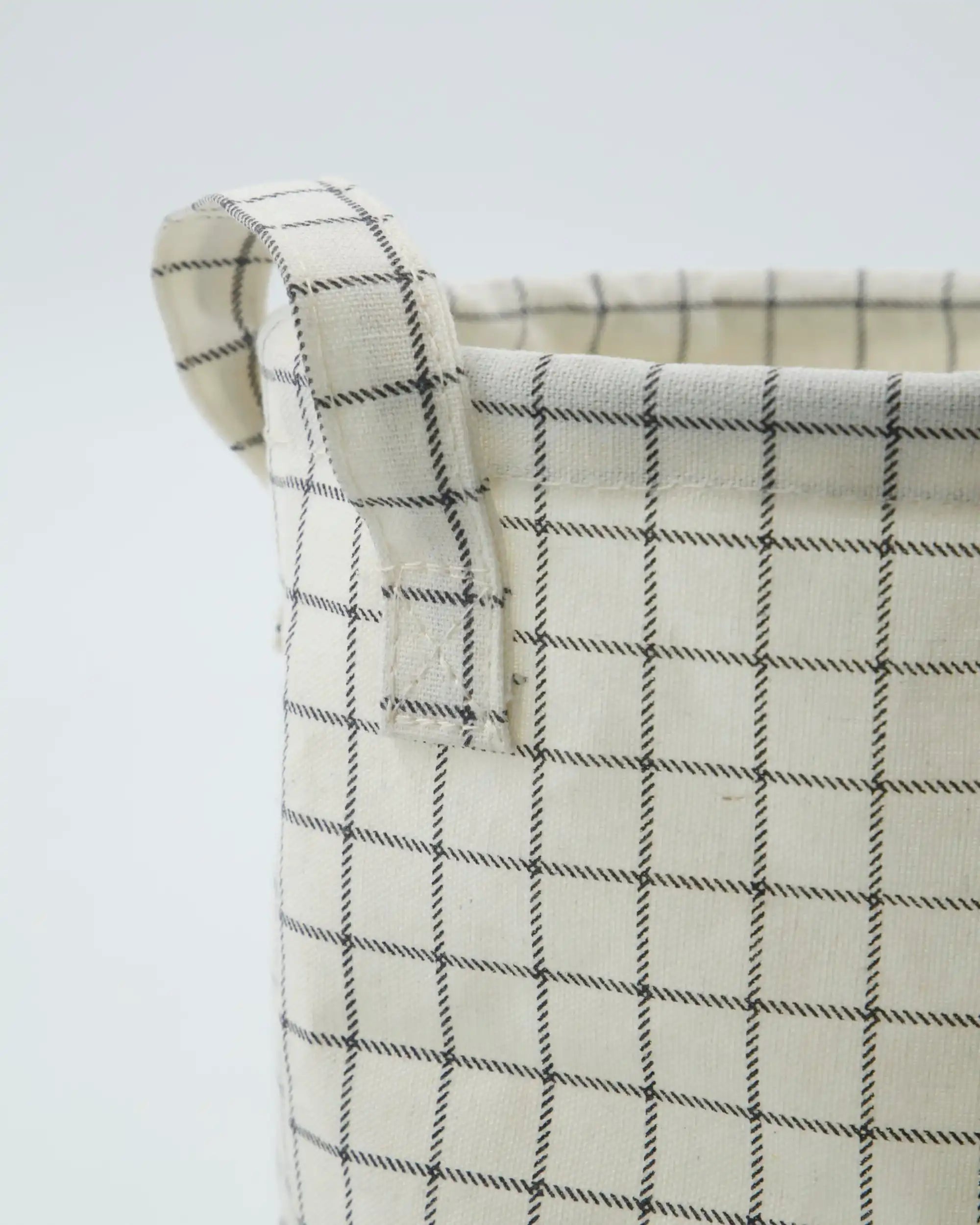 Kori on valmistettu kestävästä polyesteristä ja viimeistelty pehmeän vaaleanharmaalla värillä sekä mustalla ruutukuviolla. Yläosassa olevan kahvan ansiosta voit kantaa sitä helposti huoneesta toiseen. Korkeus on 15 cm ja halkaisija 15 cm, joten kori on tarpeeksi pieni hyllylle, mutta tilava irtotavaroille kuten aikakauslehdille, latureille tai pienille tarvikkeille.