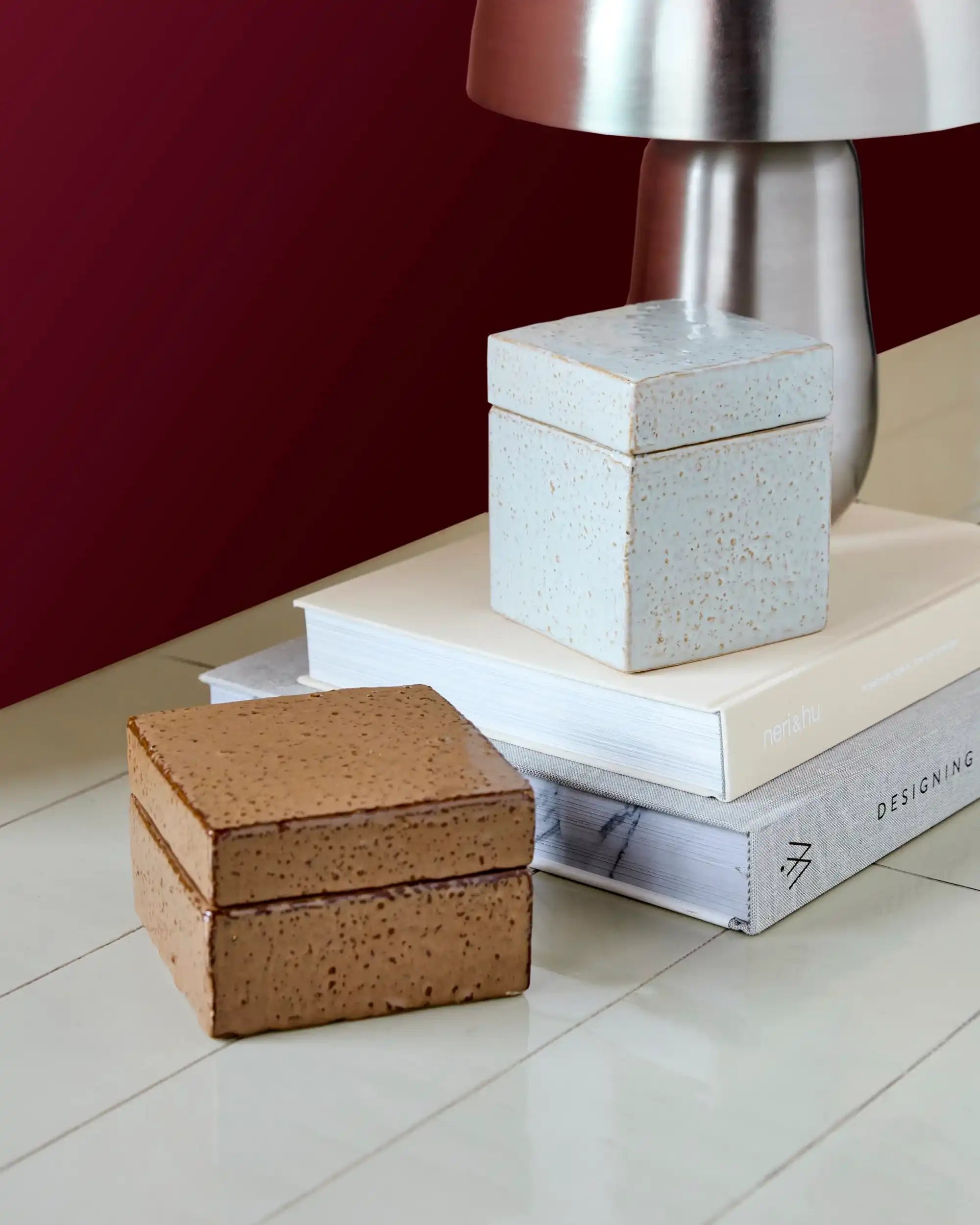Apporte une touche élégante et pratique à la maison avec ce set de deux boîtes de rangement Treasure faites main de House Doctor. L'association de la céramique brun chaud et bleu clair crée un look ludique et surprenant qui donne instantanément du caractère à ton intérieur. Grâce à leur finition artisanale unique, ces boîtes de rangement sont de véritables accroche-regards – que tu les poses sur une étagère ou les utilises comme accessoire discret sur la table.