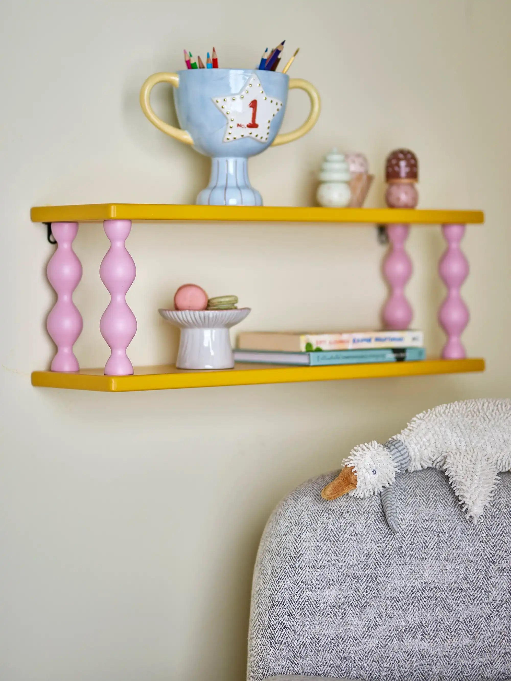 Conseil d’utilisation : Dispose une rangée de livres préférés sur l’étagère, accompagnés d’une petite plante ou d’un joli cadre photo. Change régulièrement les objets pour garder un côté ludique. Le jaune se marie à merveille avec des tons pastel ou du bois clair, pour une ambiance scandinave toute douce. Chaque recoin devient ainsi un endroit agréable à redécouvrir encore et encore.