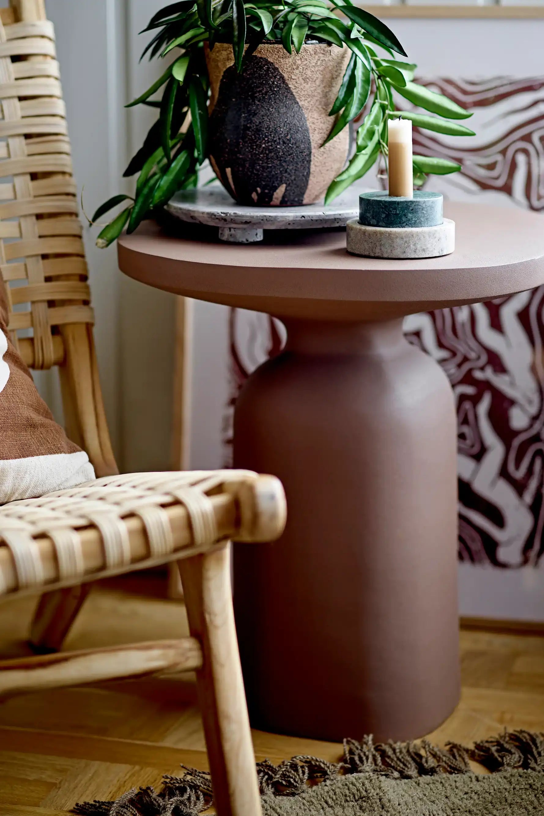 Détails uniques & matériau de qualité : Cette table d’appoint est fabriquée en aluminium solide et finie avec une teinte brune mate et terreuse qui se marie parfaitement avec des matériaux naturels. Chaque pièce est en partie réalisée à la main, ce qui garantit des irrégularités authentiques et beaucoup de charme – ta table est toujours unique. Avec un diamètre de 44,5 cm et une hauteur de 50 cm, elle offre juste assez d’espace pour tes accessoires préférés, une tasse de café ou un beau livre.