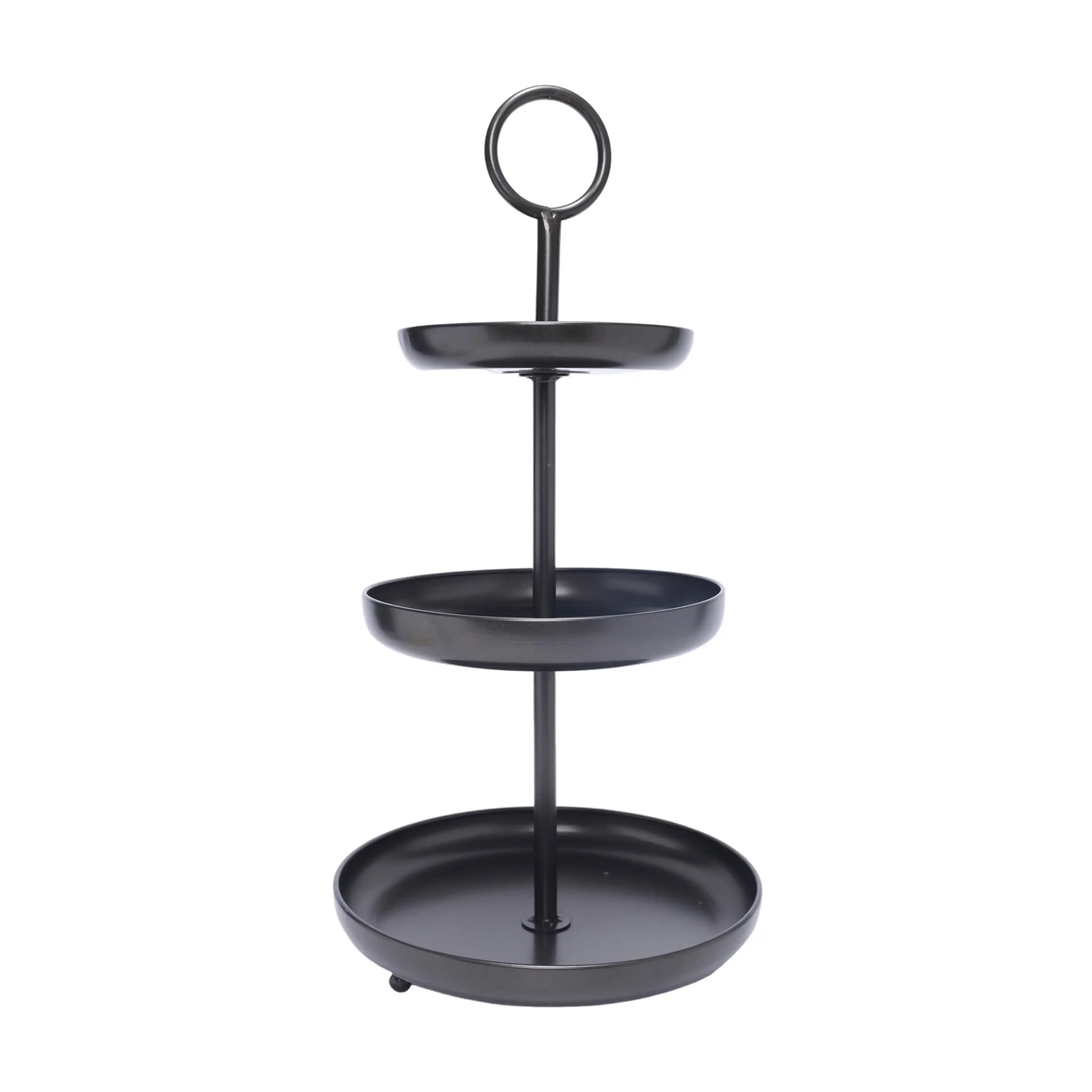 L’étagère a une hauteur de 60 cm et un diamètre de 30 cm au niveau du plateau inférieur. Les plateaux diminuent subtilement de taille, ce qui apporte un aspect équilibré et élégant. En haut, une anse pratique te permet de soulever ou déplacer l’étagère facilement.