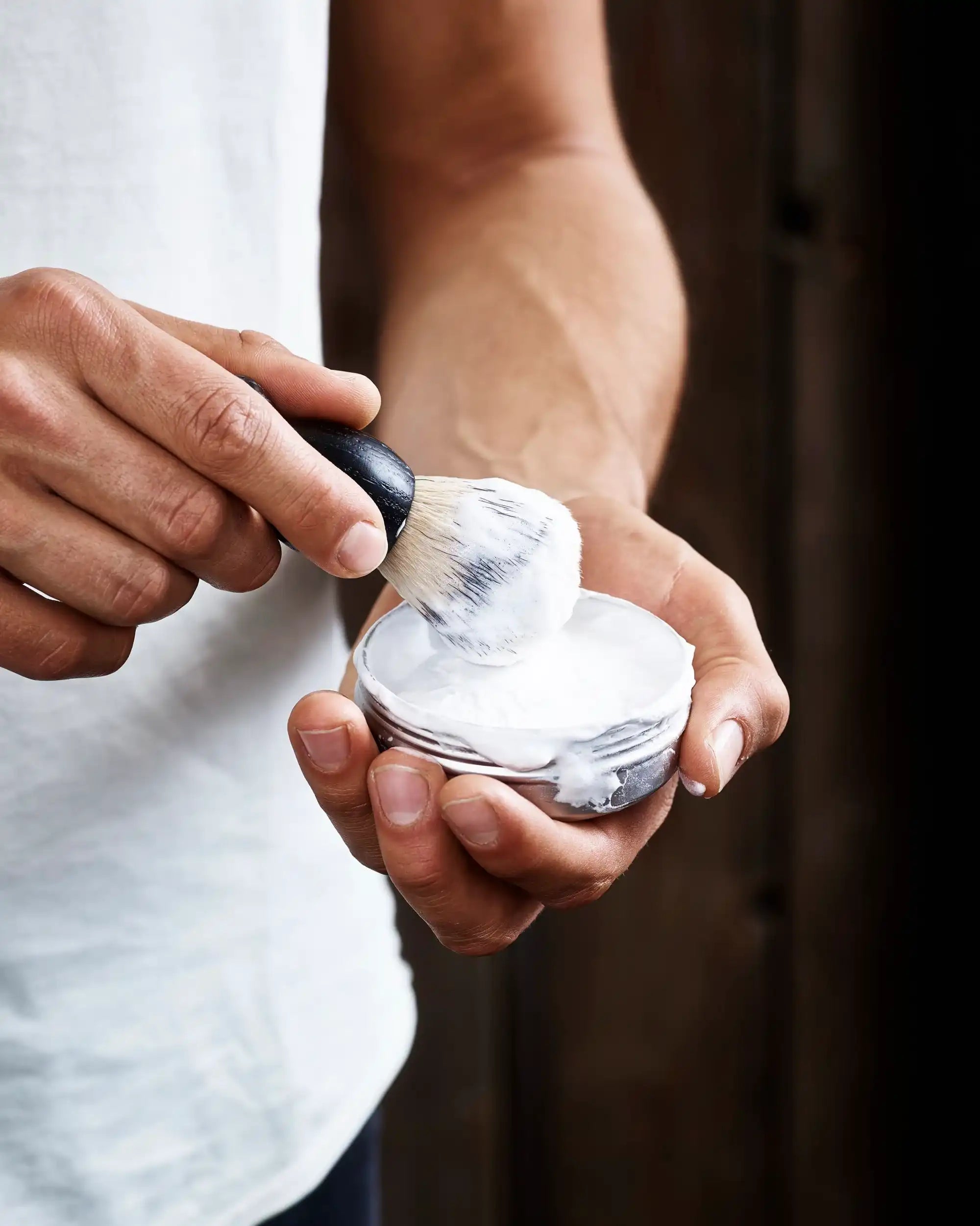 Astuce : Mouille ton visage à l’eau tiède, applique un peu de savon à raser sur le blaireau et masse doucement la peau en mouvements circulaires.