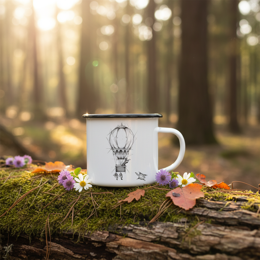 Vas-tu désormais savourer ton café ou ton thé dans ce mug en émail ultra résistant de Ligarti ? Ce mug, orné d'un motif unique de montgolfière, est conçu et fabriqué à la main par Ligarti en Allemagne. On dit que ces mugs sont indestructibles, et grâce à leur légèreté, ils sont aussi faciles à emporter partout.