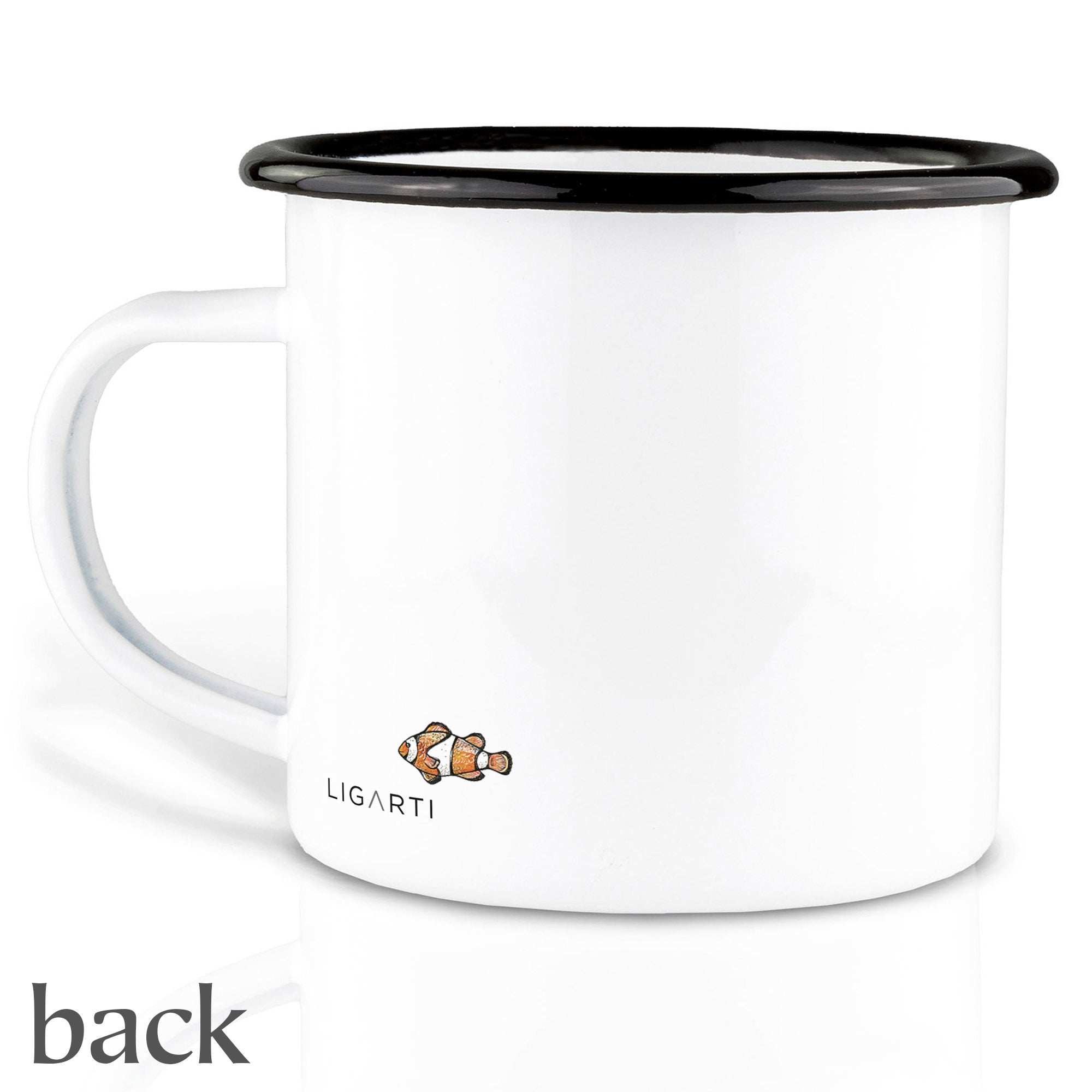 La Ligarti Handgemaakte emaille mok Dolfijn 300ml met en valeur, de façon poétique, le lien entre une mère et son petit – avec deux dauphins glissant gracieusement dans l’eau. L’illustration bleu-gris subtile dégage calme et élégance. Au dos du mug, un petit poisson orange (clin d’œil à Nemo) nage à côté du logo Ligarti – un détail ludique qui rend cette tasse vraiment unique.
