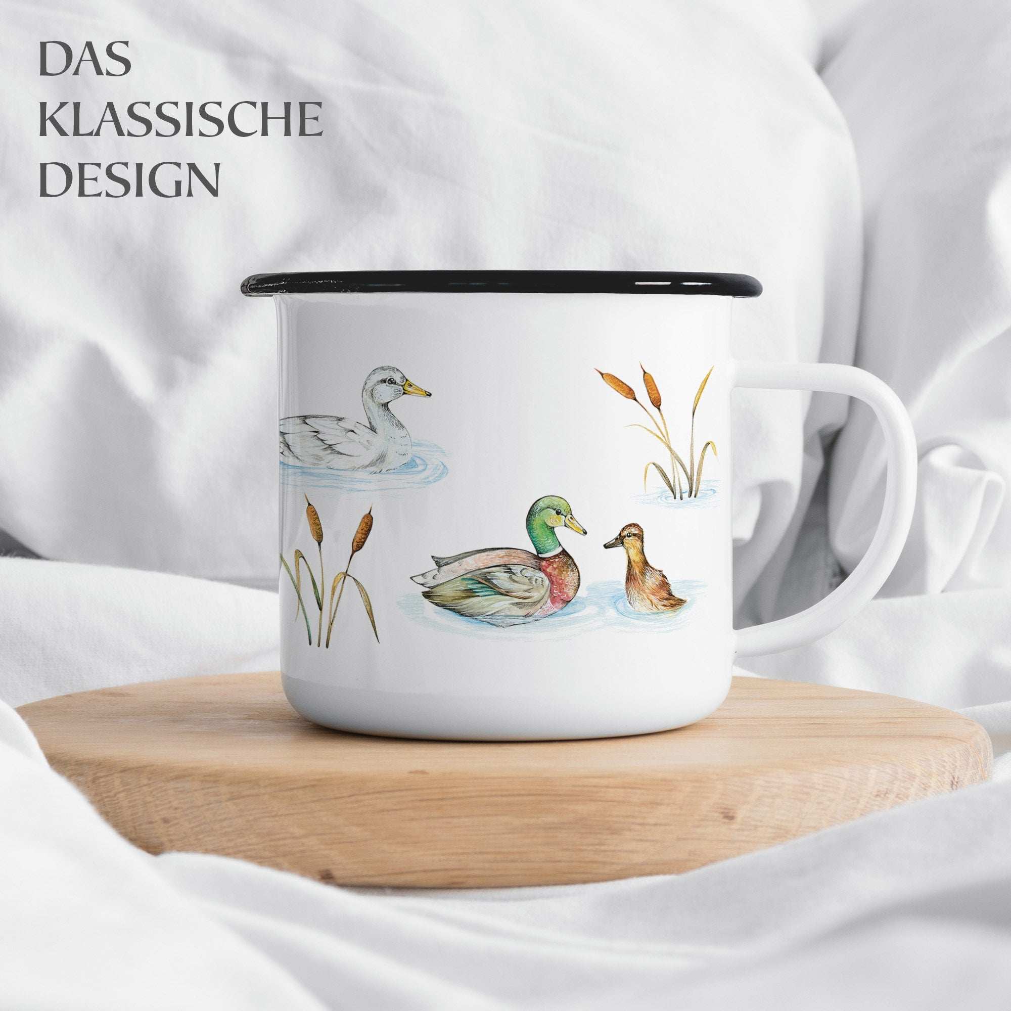 Comme toutes les tasses Ligarti, celle-ci est également fabriquée et imprimée à la main en Allemagne. Les canards colorés et leurs canetons ressortent magnifiquement sur le métal blanc, entourés d'un liseré noir classique. Avec sa contenance de 300 ml, cette tasse est parfaite pour le café, le thé ou toute autre boisson chaude préférée.