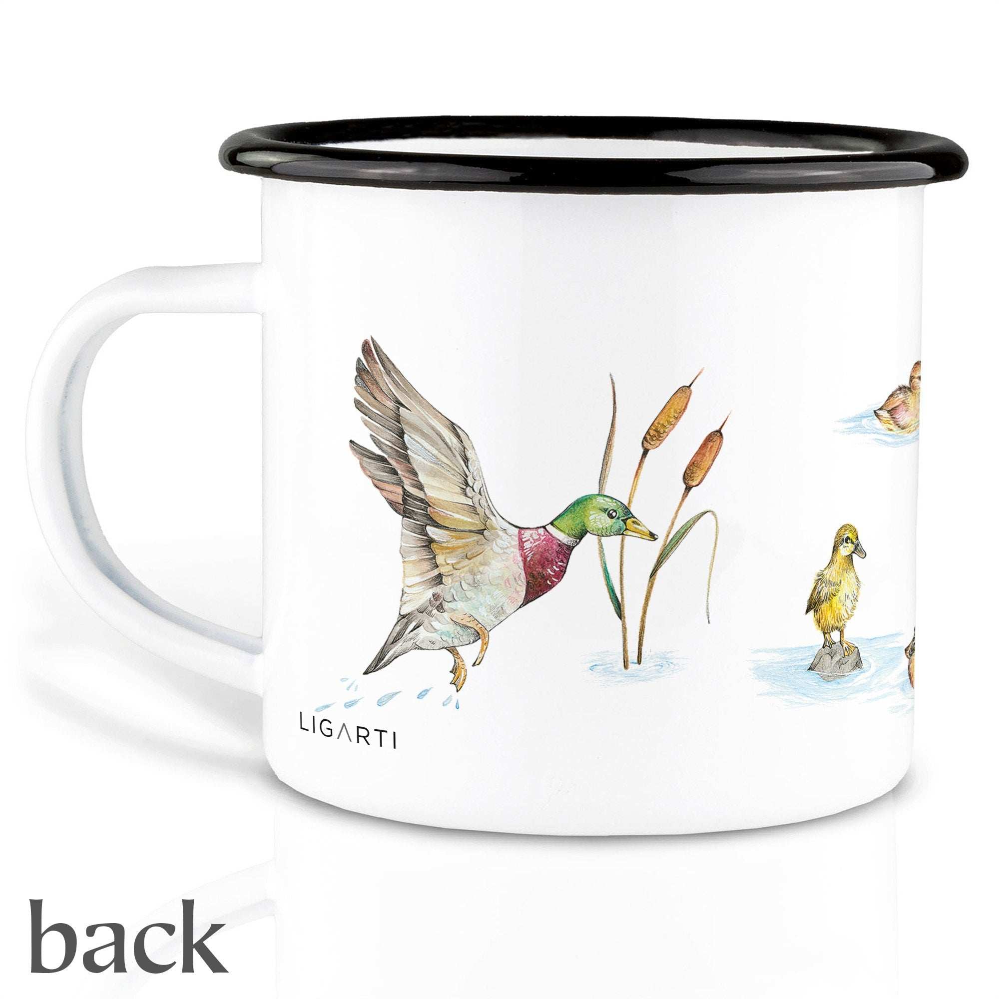 La Ligarti Tasse en émail faite main Étang aux canards 300ml présente une scène paisible : une maman canard et ses petits, flottant sur un étang coloré. L'illustration joyeuse aux tons doux respire la sérénité, la nature et la simplicité. Parfaite pour une pause-café qui t'invite à rêver au bord de l'eau.