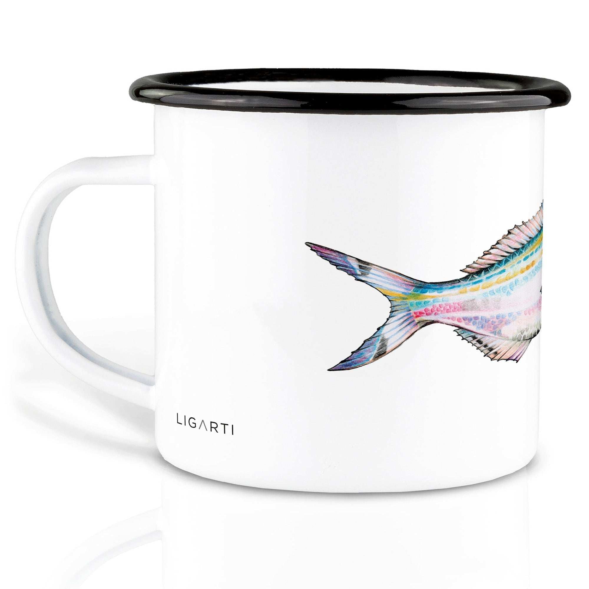 La Ligarti Tasse en émail faite main Poisson coloré n° 3 – 300ml est une combinaison colorée d'art et de praticité. L'illustration ludique du poisson bleu et rose attire immédiatement le regard et donne à ta pause-café une touche unique. Cette tasse fait partie d'une collection unique de quatre, chacune représentant un poisson différent dans une palette de couleurs différente – idéale à collectionner ou à offrir en mixant les modèles.