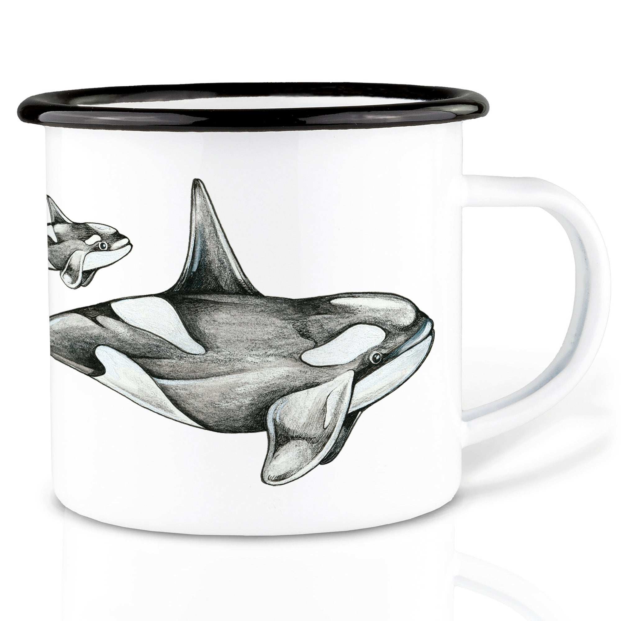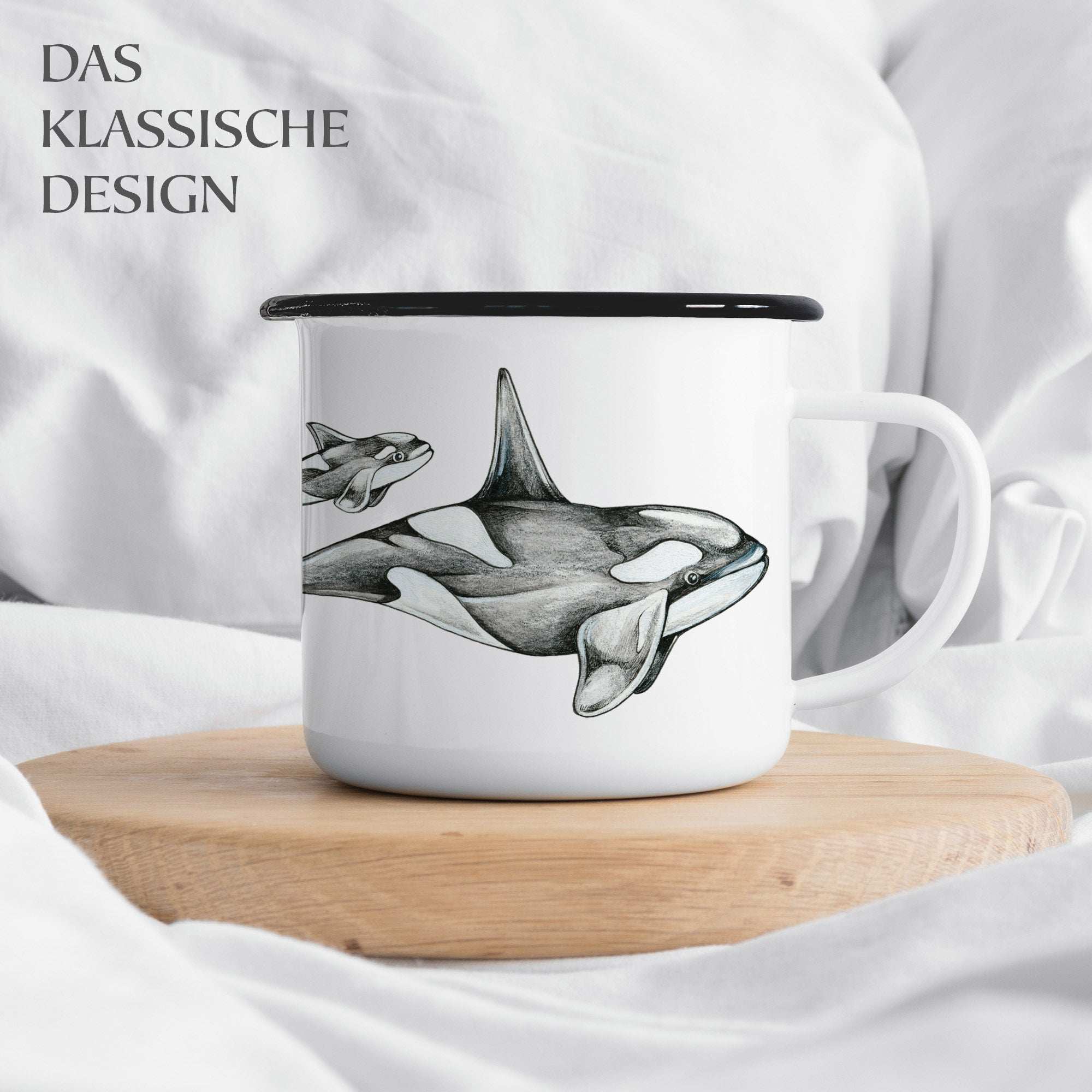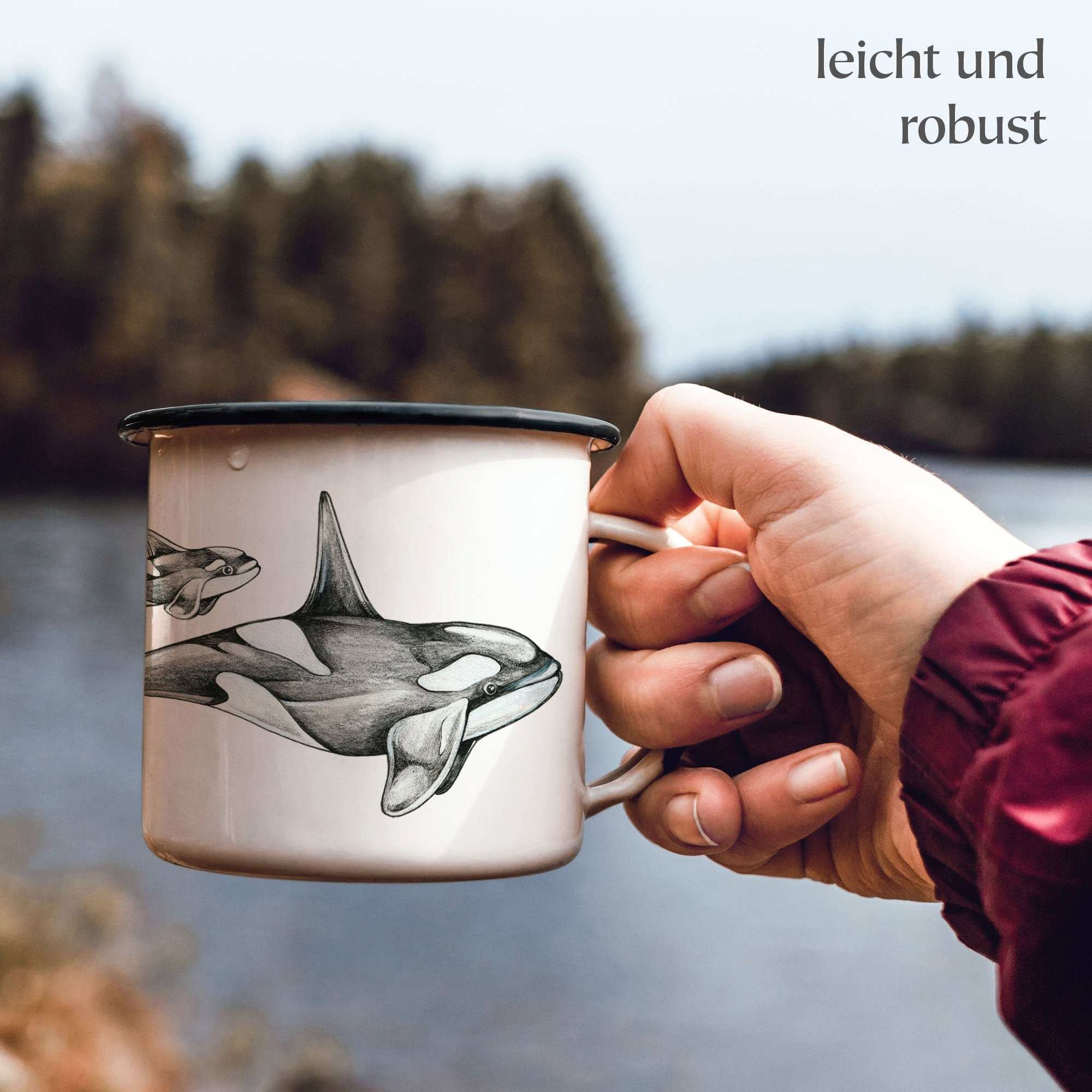 Comme toutes les tasses Ligarti, cette édition orque est également imprimée à la main en Allemagne. L'émail de haute qualité est appliqué sur un métal blanc solide et fini avec un bord noir. Grâce à sa contenance de 300 ml, cette tasse est parfaite pour le café, le thé ou le chocolat chaud – à la maison, en déplacement ou au bord de la mer.