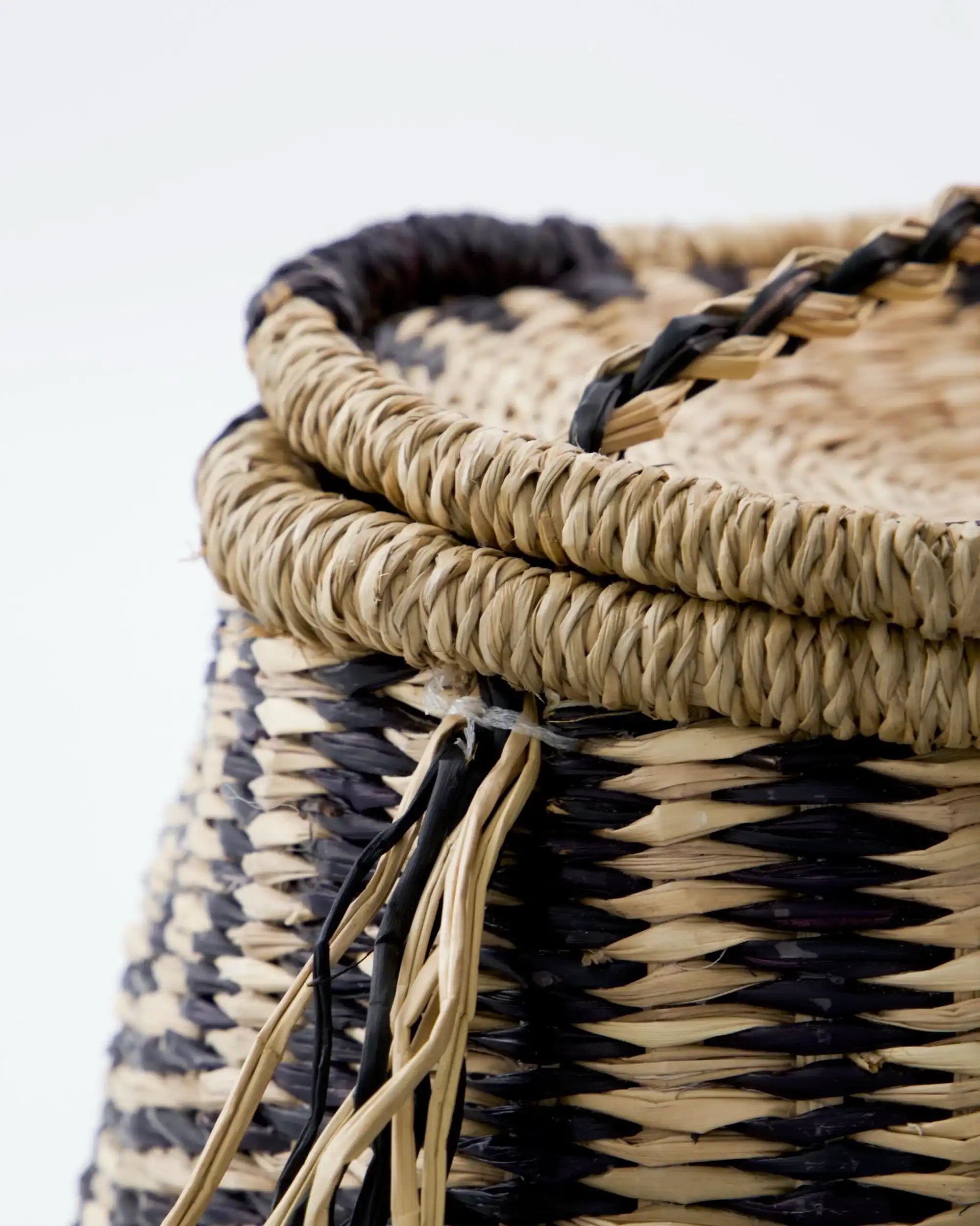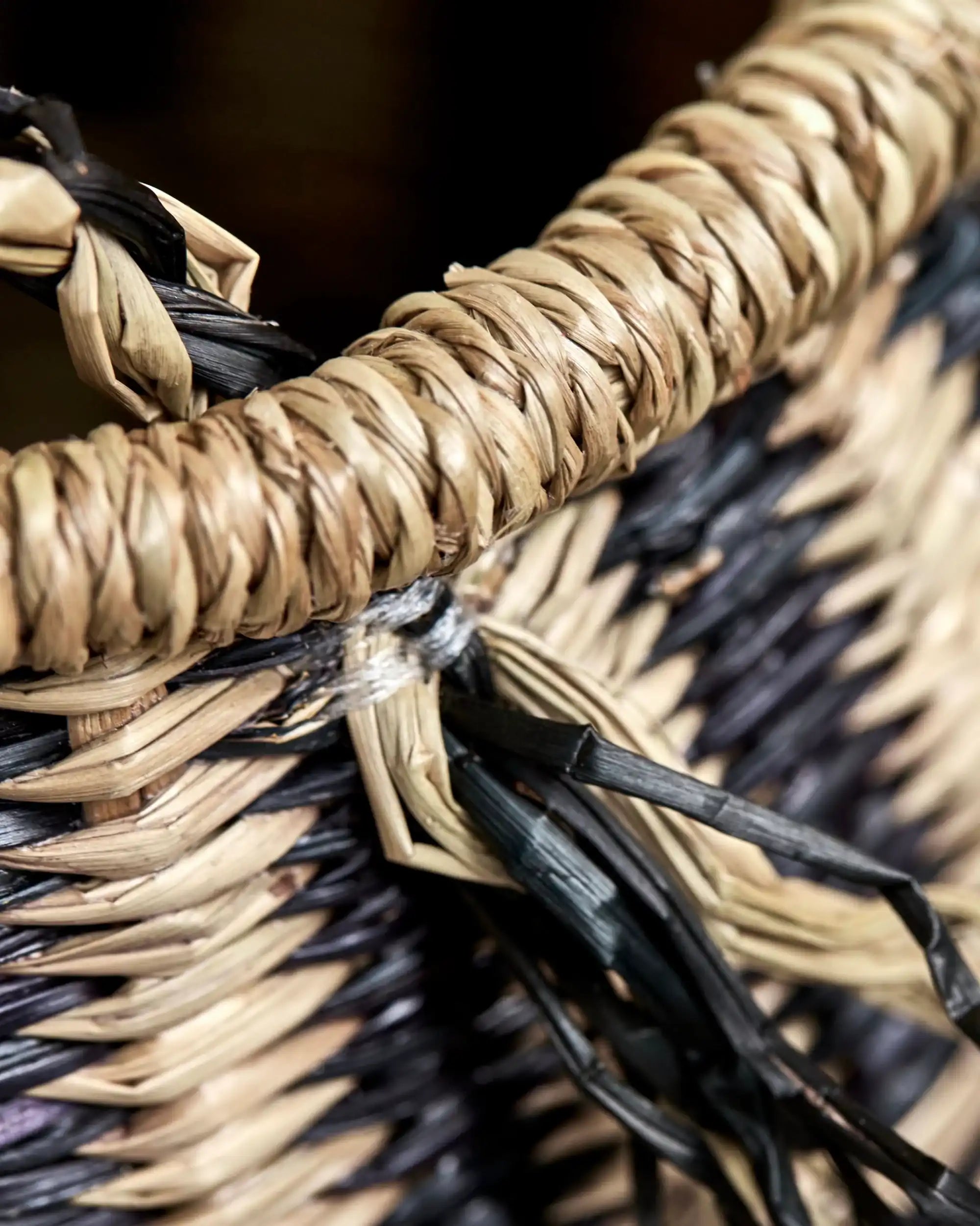 Isa est tressé à la main en jonc de mer naturel et offre, avec une hauteur de 90 cm et un diamètre de 23 cm, un espace de rangement étonnamment généreux. Son design rond et son couvercle astucieux rendent le panier non seulement pratique, mais aussi discret à suspendre. L'association du naturel et du noir apporte une touche graphique et chaleureuse à ton mur.
